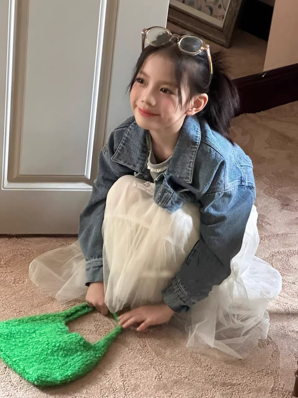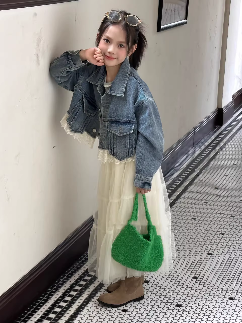 - Áo khoác denim trẻ em nữ phối ren, mùa xuân thu 2025, áo khoác trẻ em tay dài, áo kiểu học sinh, kiểu ngắn thời trang