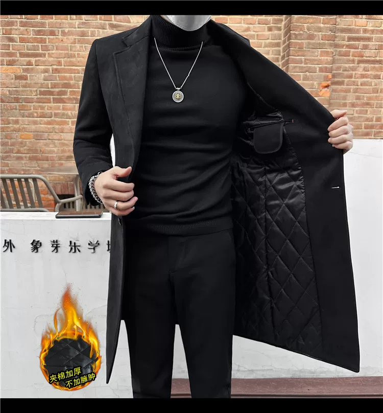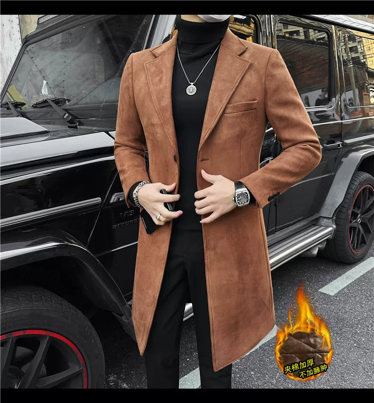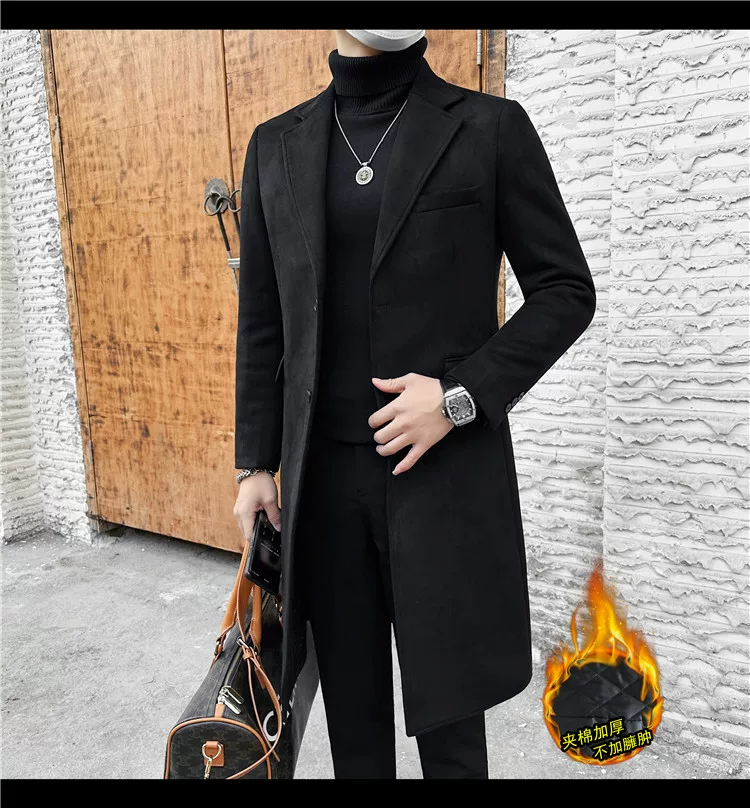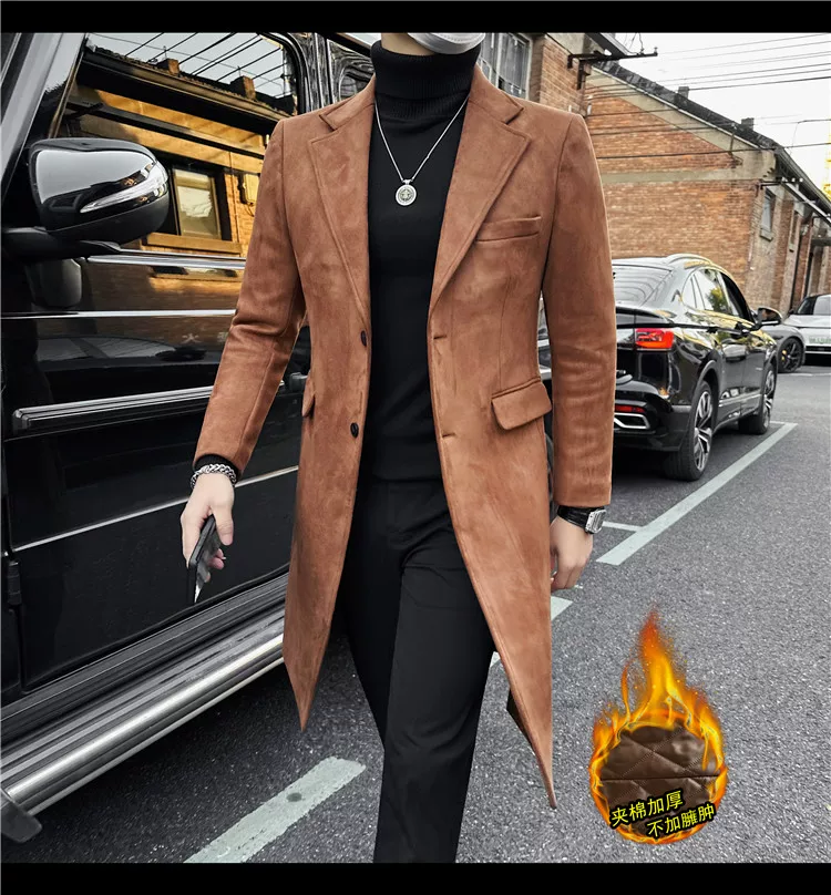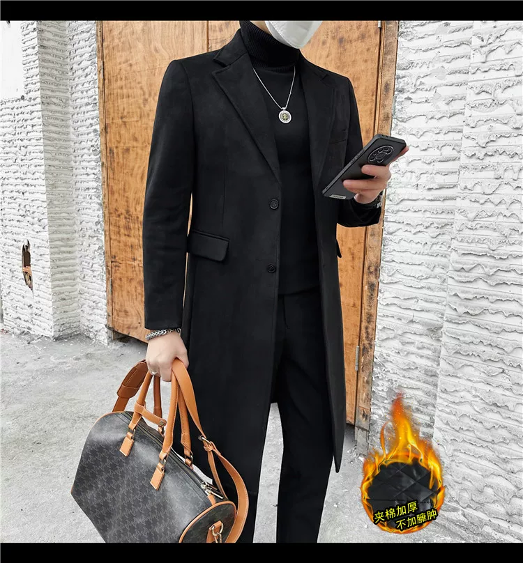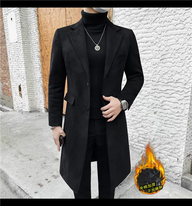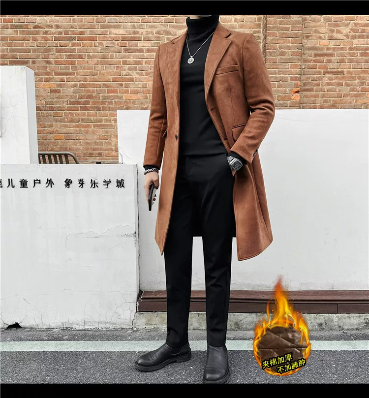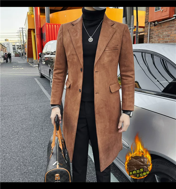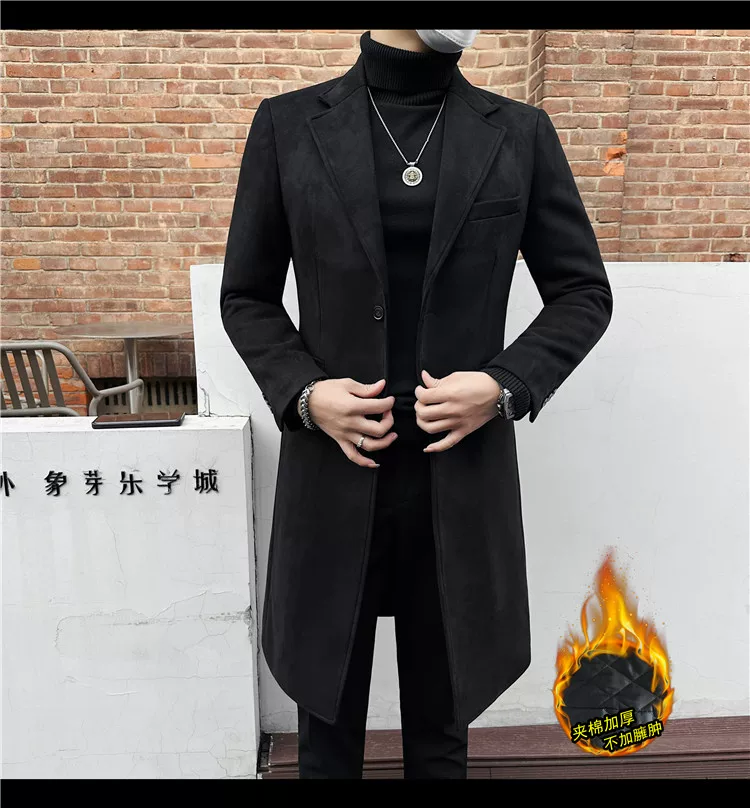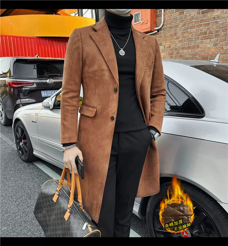Áo khoác len da lộn cho nam, dài vừa phải, mùa đông, có đệm và dày dặn, áo khoác len cao cấp, hợp thời trang, đa năng.