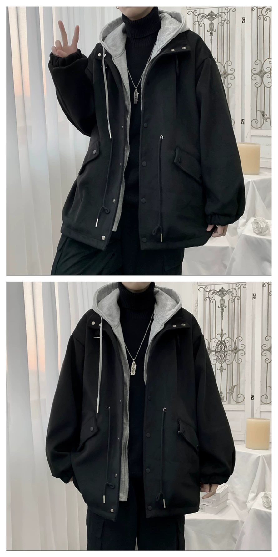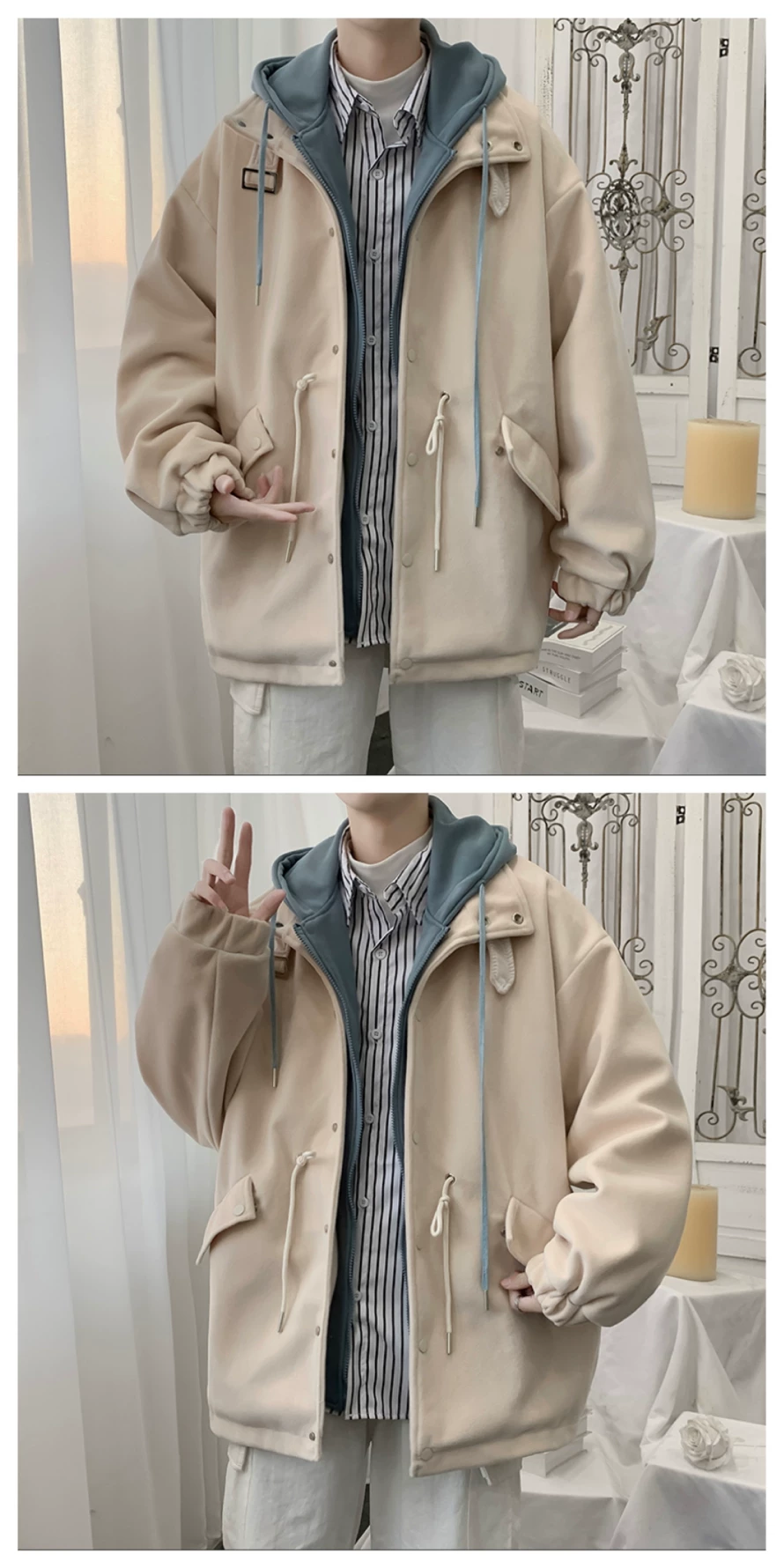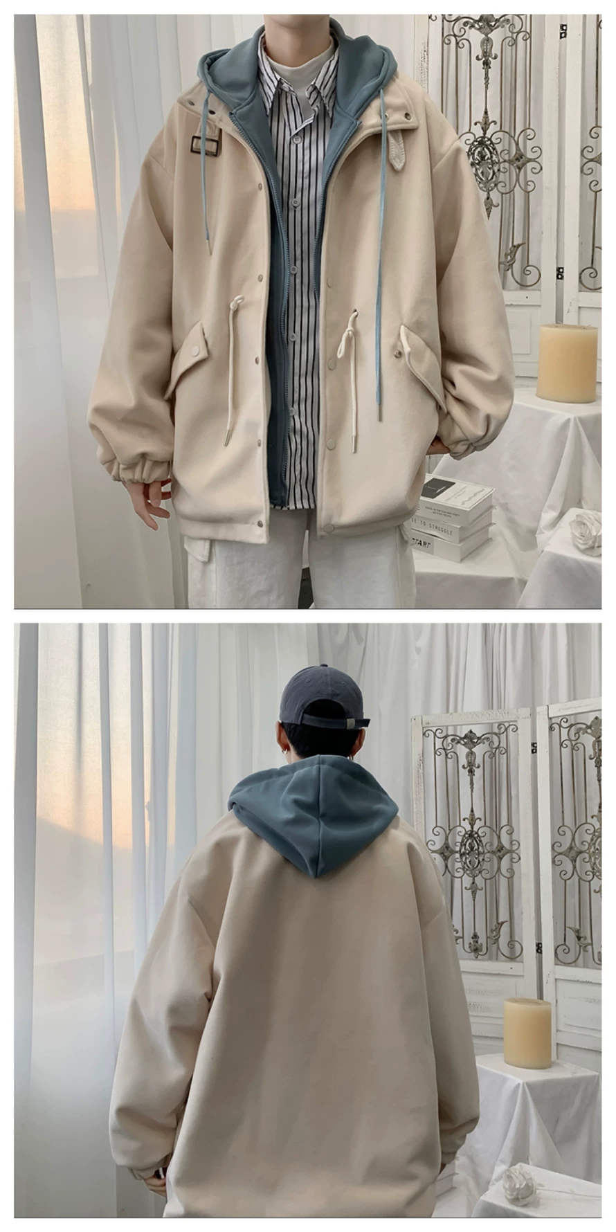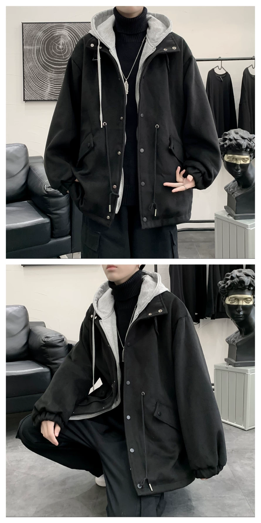 - Áo khoác len giả hai mảnh phong cách Hồng Kông dành cho nam, áo khoác có mũ trùm đầu dáng rộng cho cặp đôi mùa thu đông, áo khoác len thời trang cá tính.