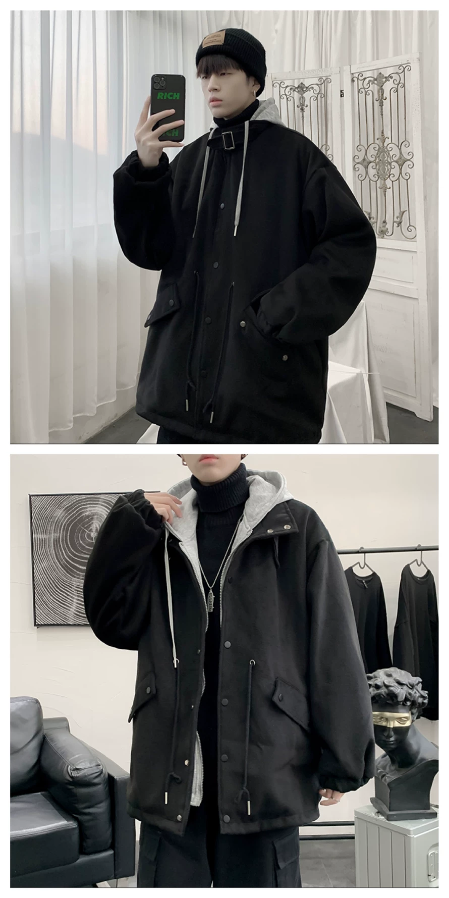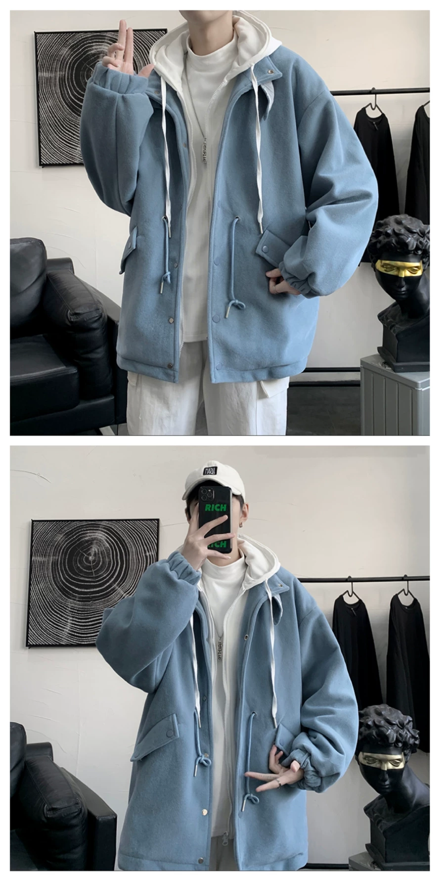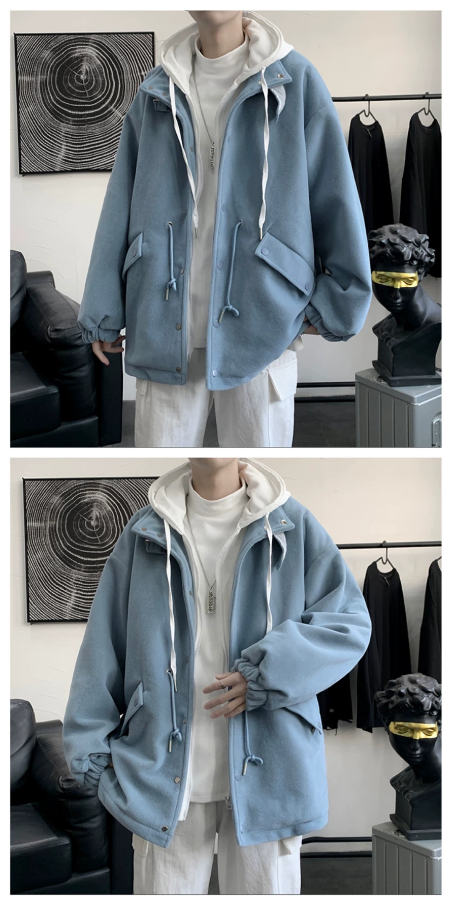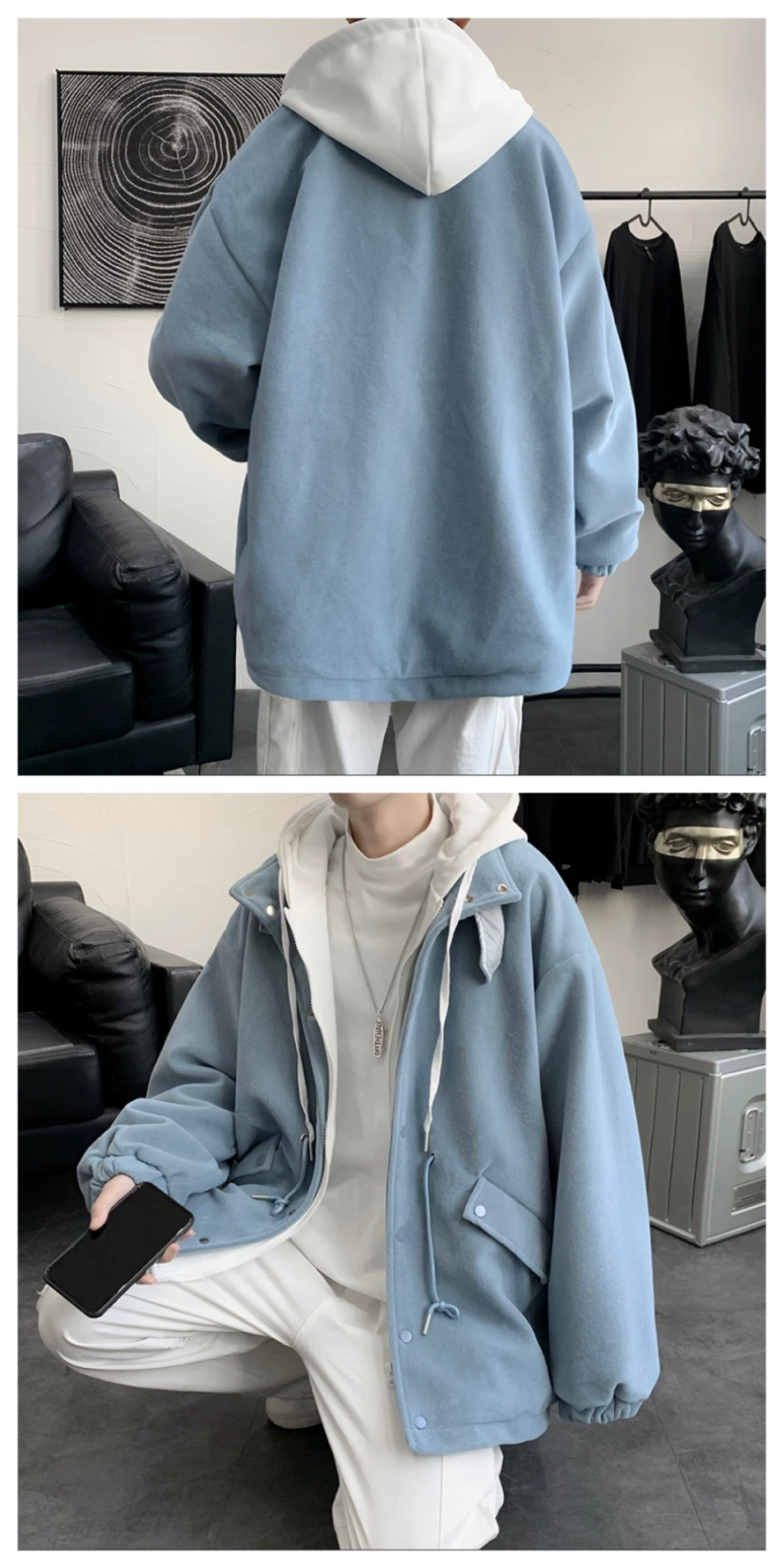 - Áo khoác len giả hai mảnh phong cách Hồng Kông dành cho nam, áo khoác có mũ trùm đầu dáng rộng cho cặp đôi mùa thu đông, áo khoác len thời trang cá tính.