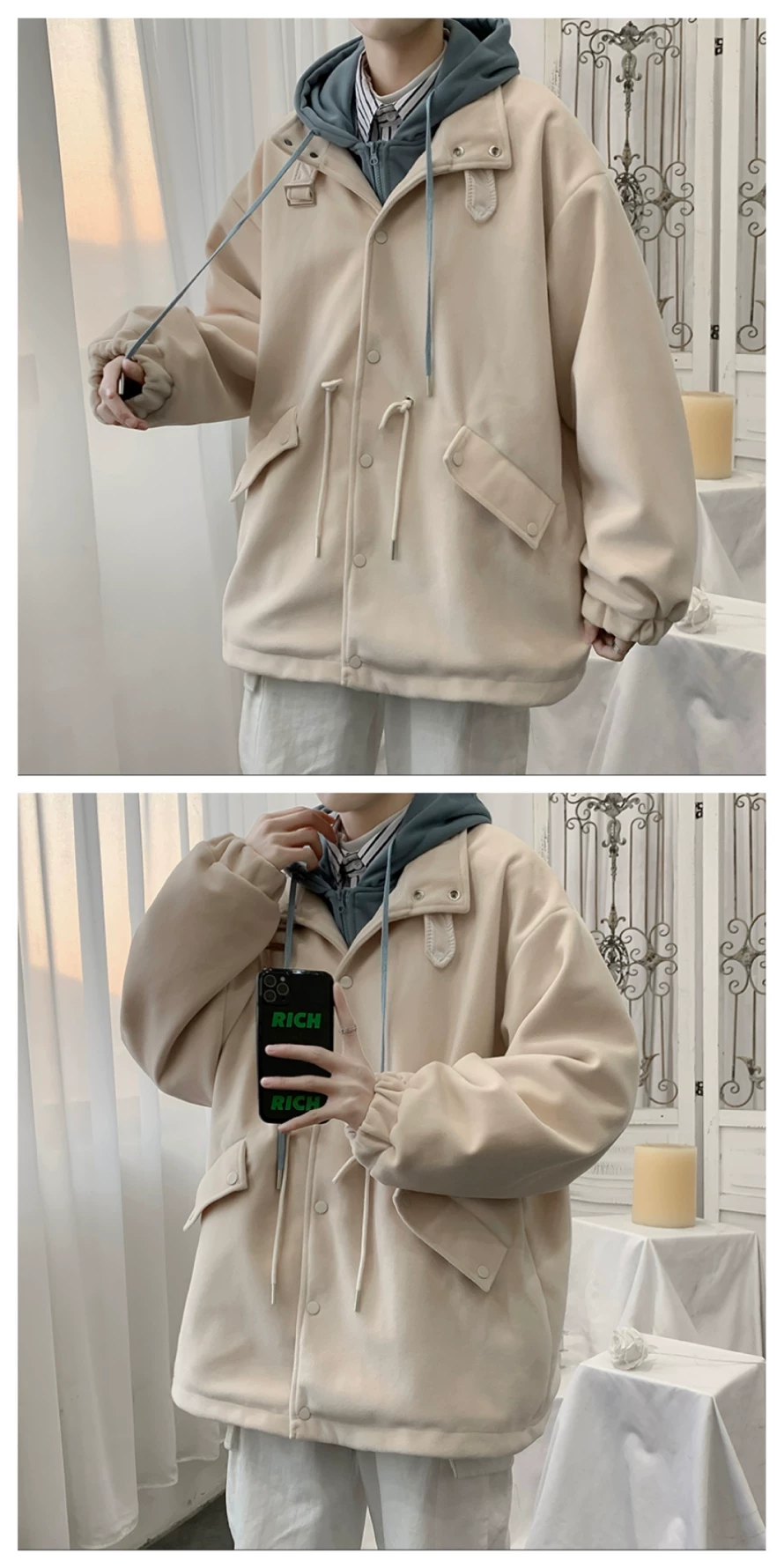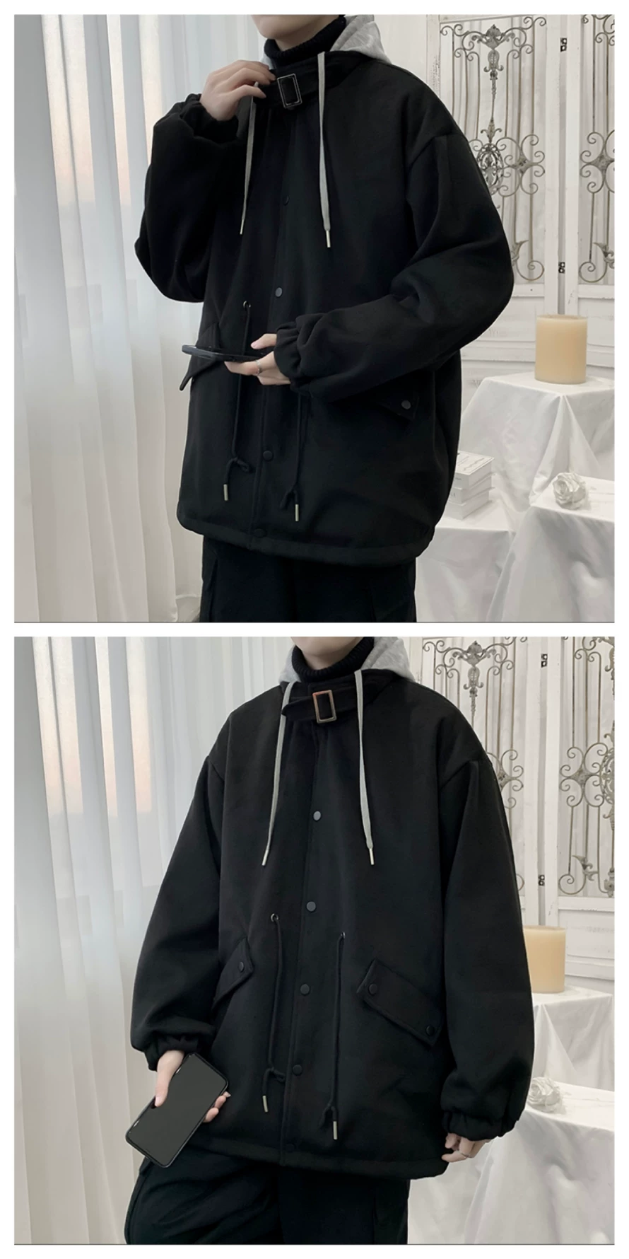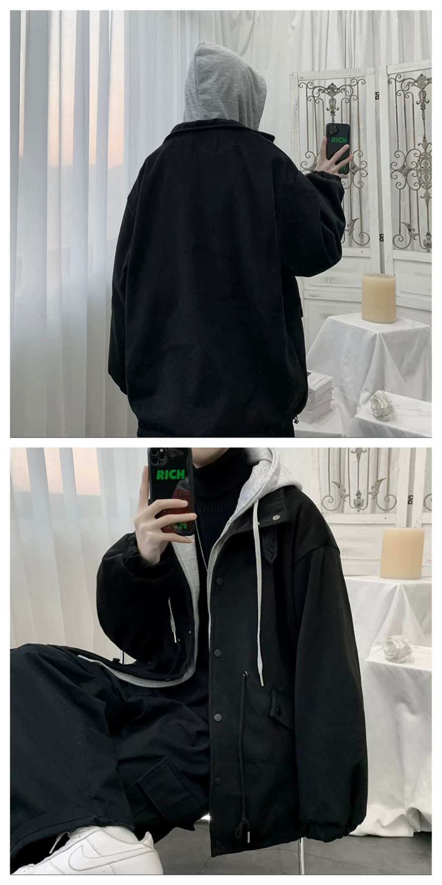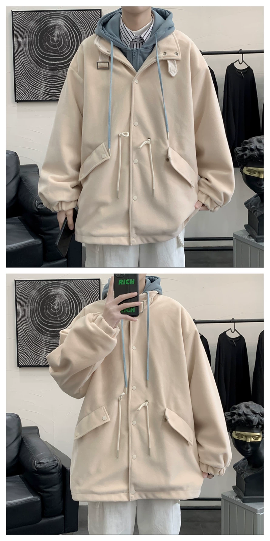 - Áo khoác len giả hai mảnh phong cách Hồng Kông dành cho nam, áo khoác có mũ trùm đầu dáng rộng cho cặp đôi mùa thu đông, áo khoác len thời trang cá tính.