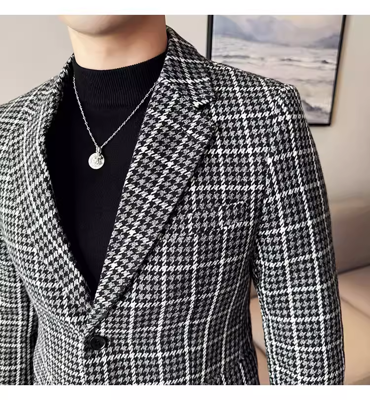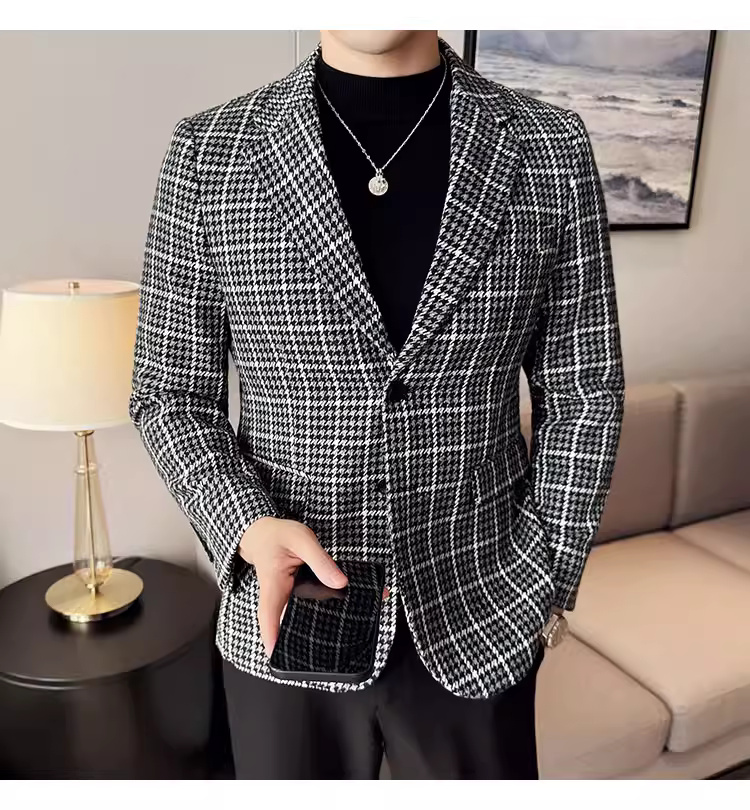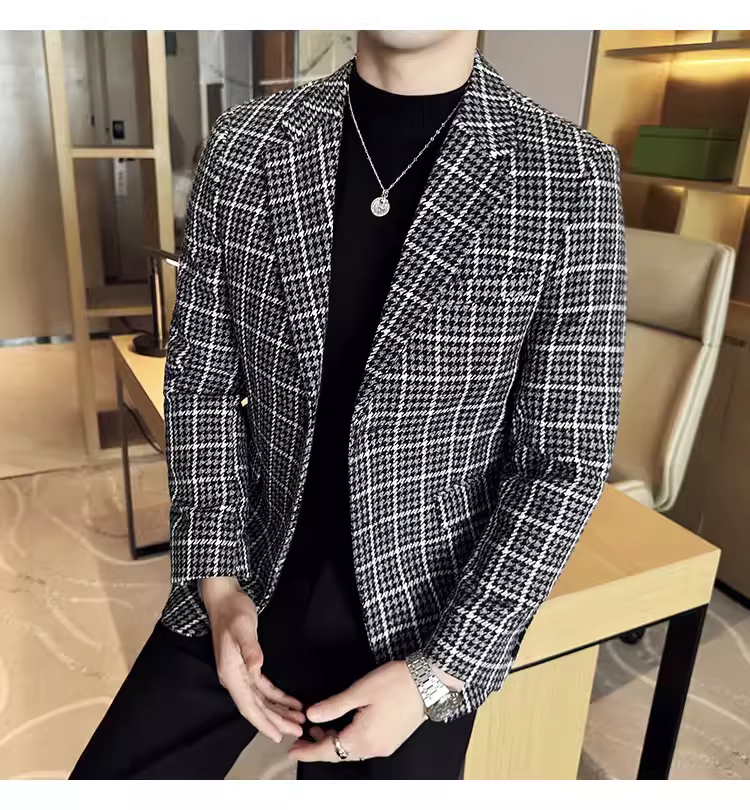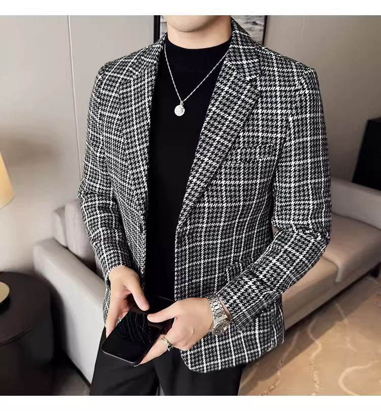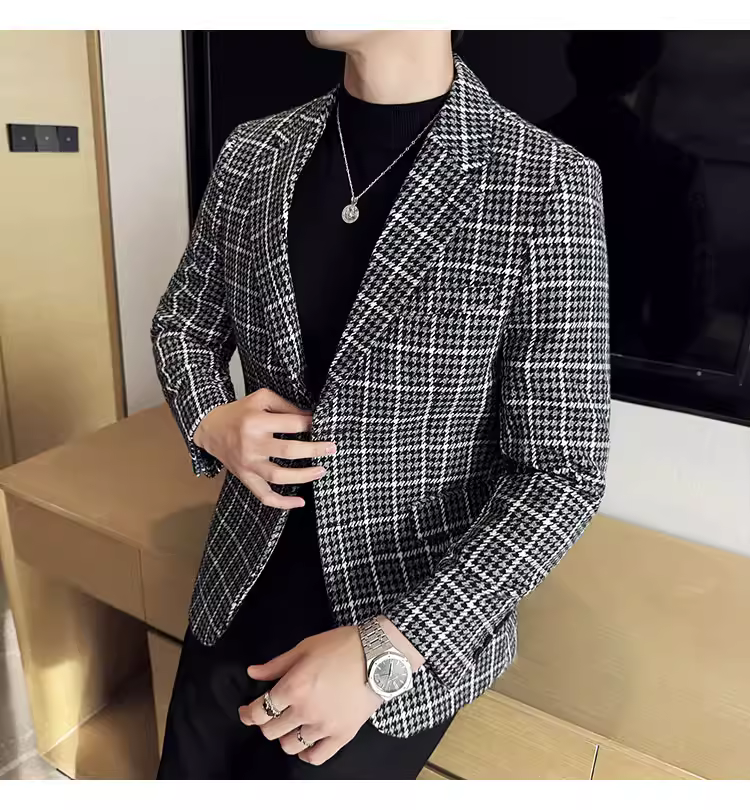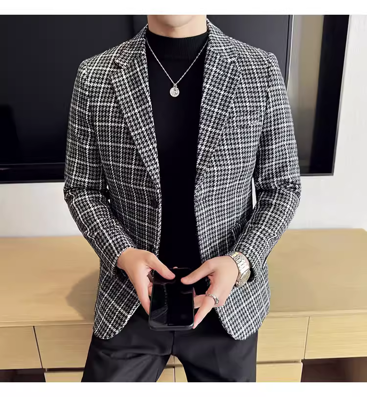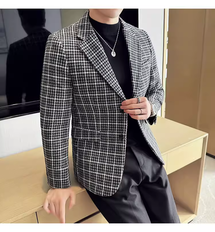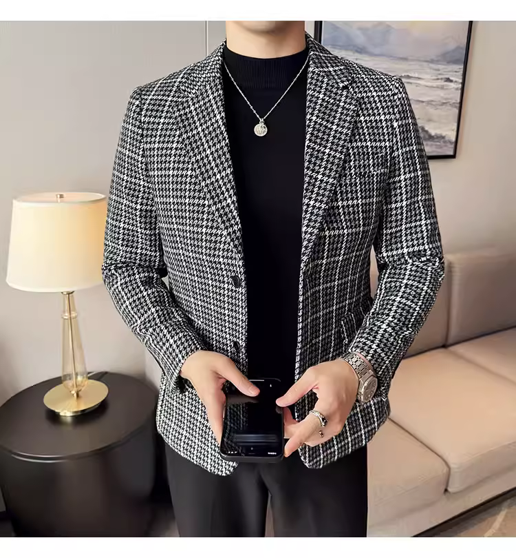 Áo khoác len kẻ sọc dành cho nam, kiểu dáng dày dặn mùa thu đông, kiểu dáng công sở lịch lãm cao cấp, đa năng, ôm dáng, chất liệu len, đơn hàng khuy.
