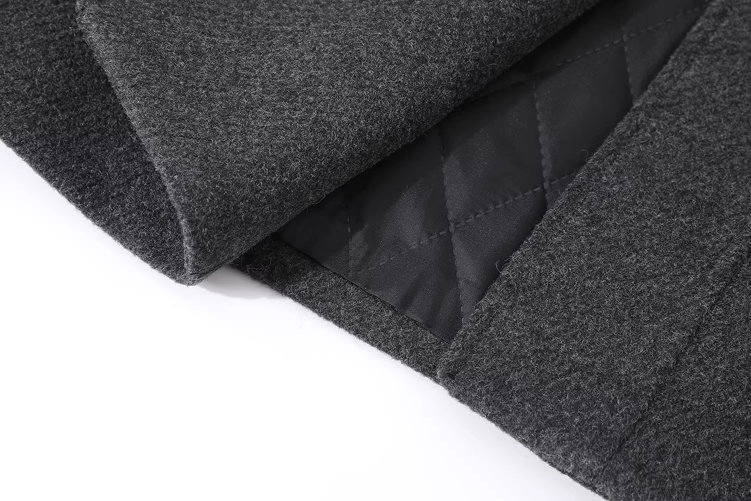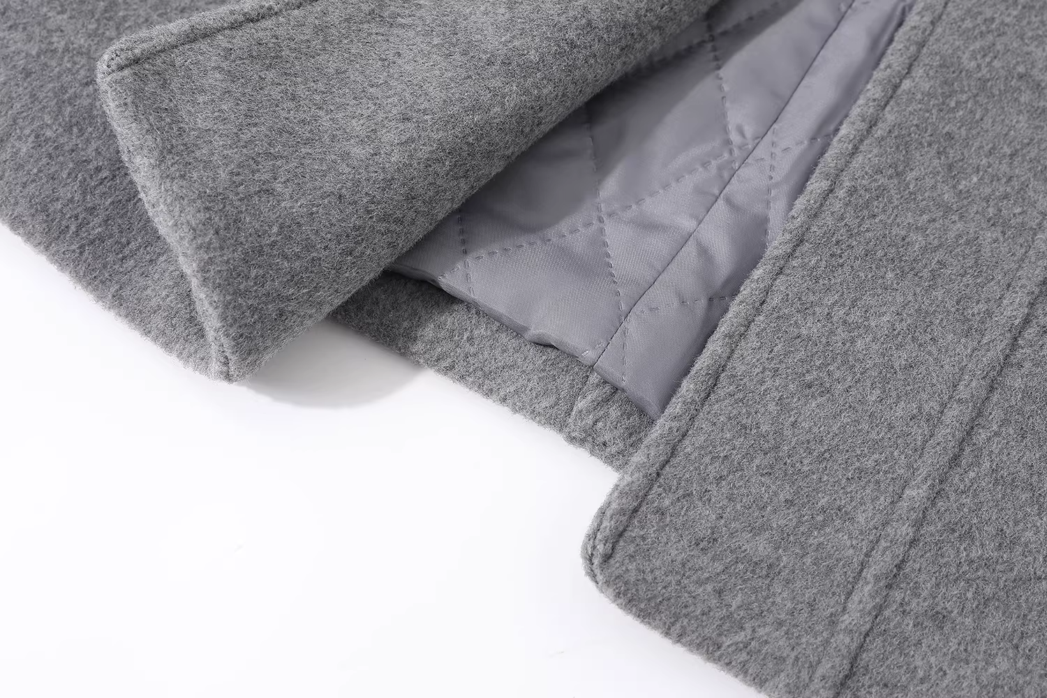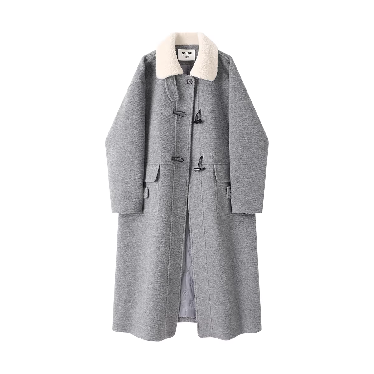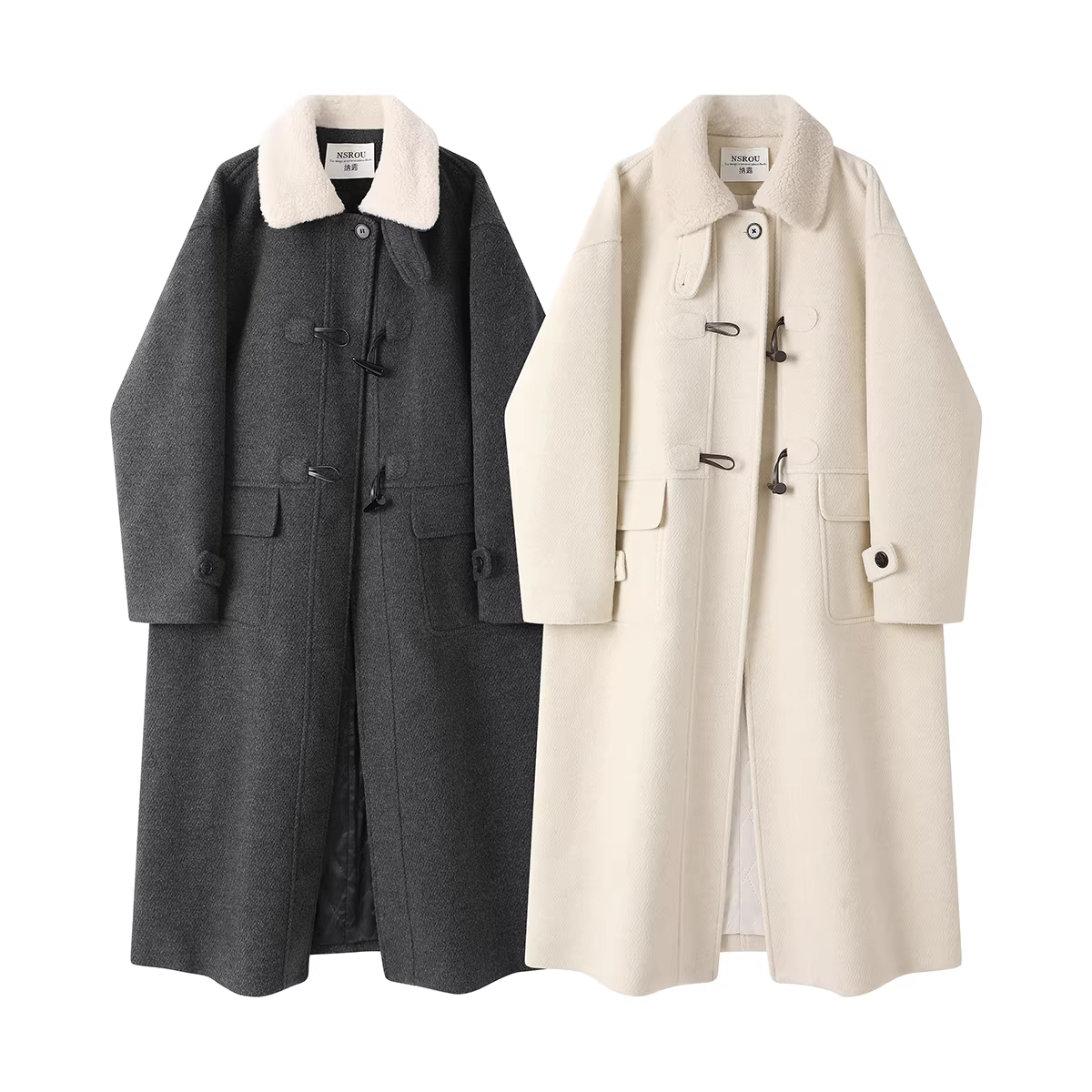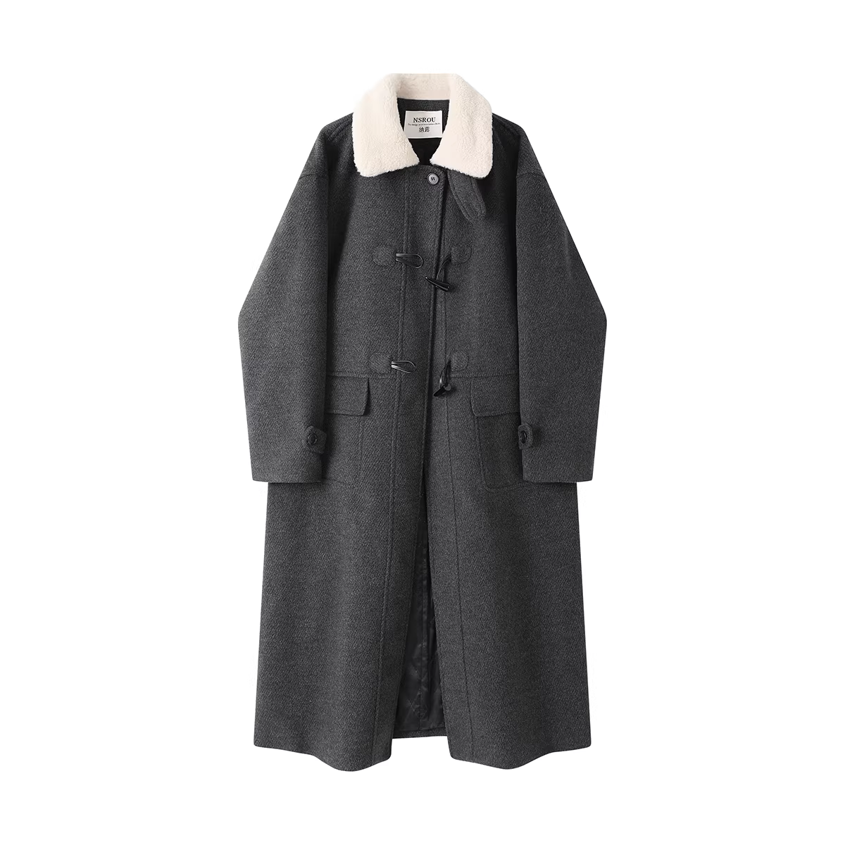 - Áo khoác len màu xám có nút bấm cao cấp phong cách NSROU có cổ đứng dành cho nữ, dài vừa phải cho mùa thu đông.