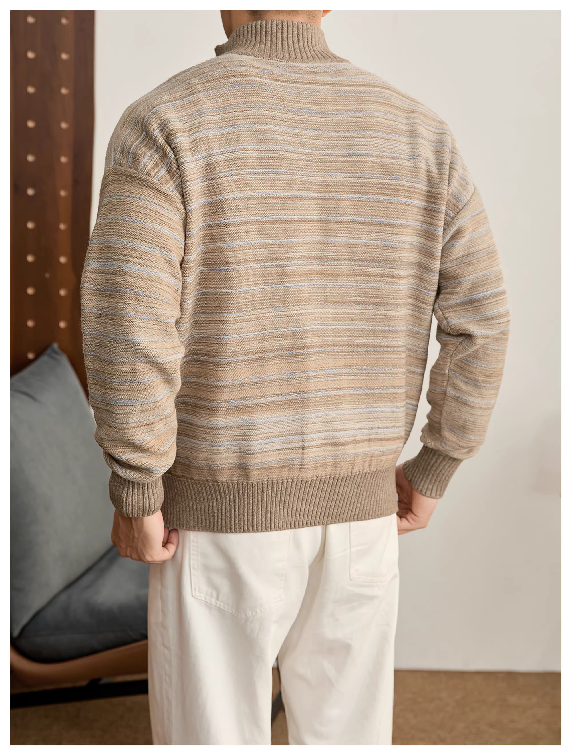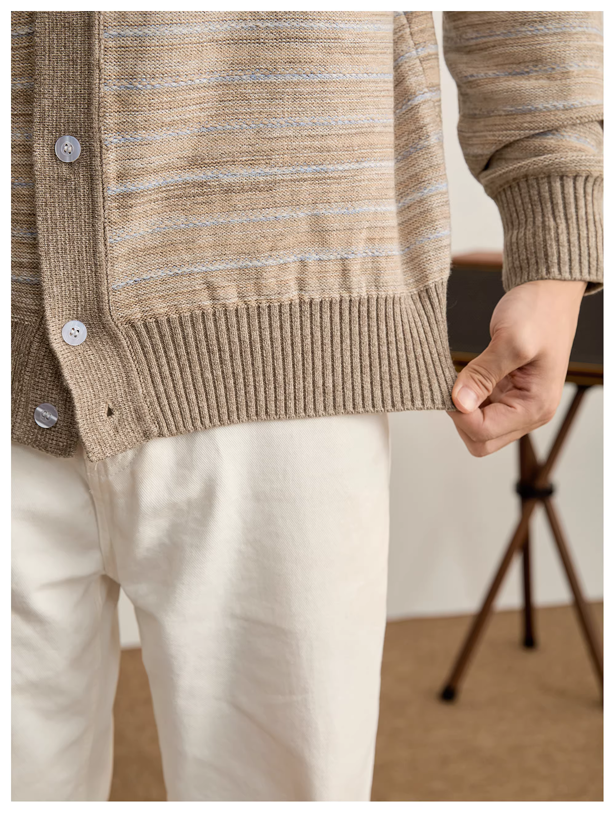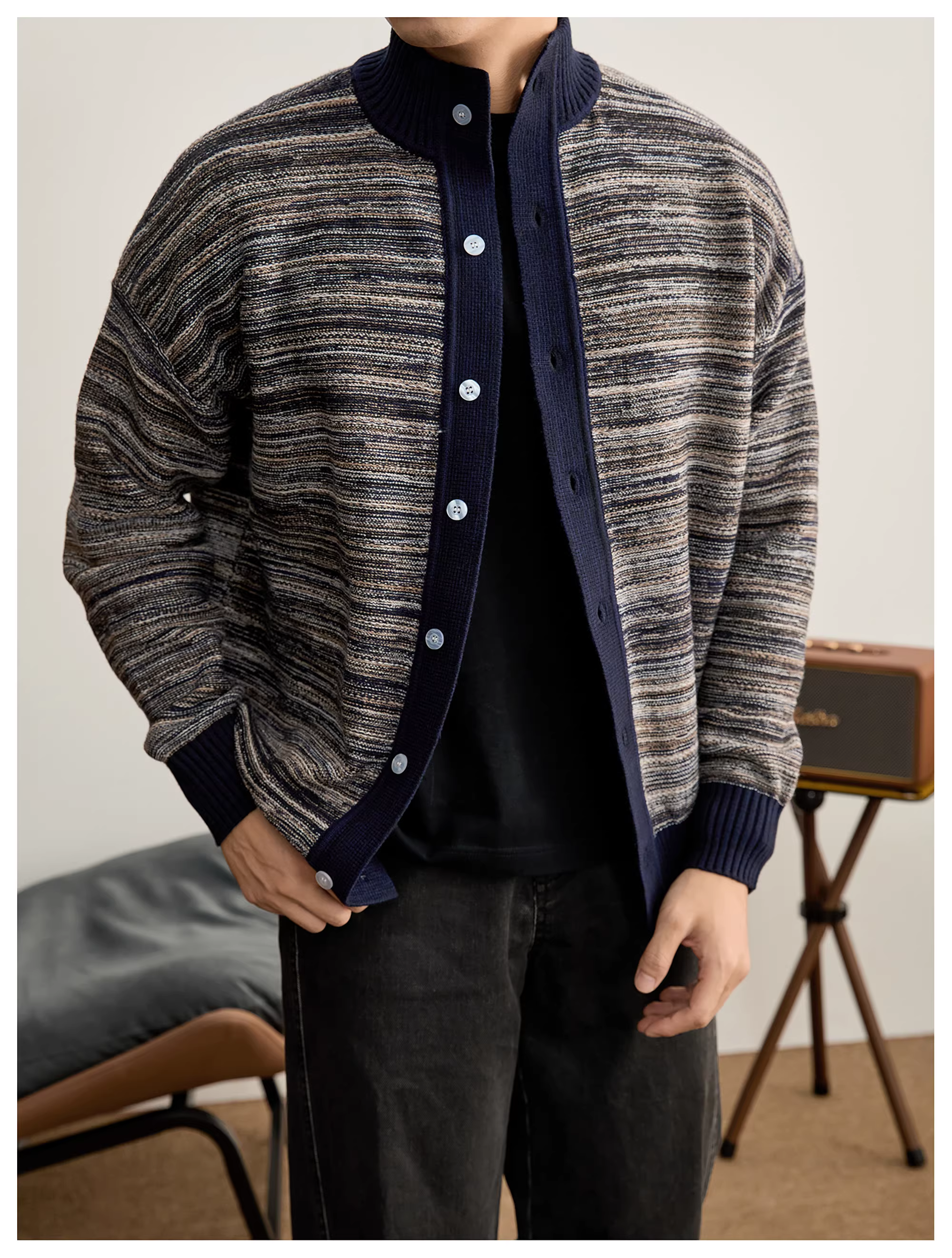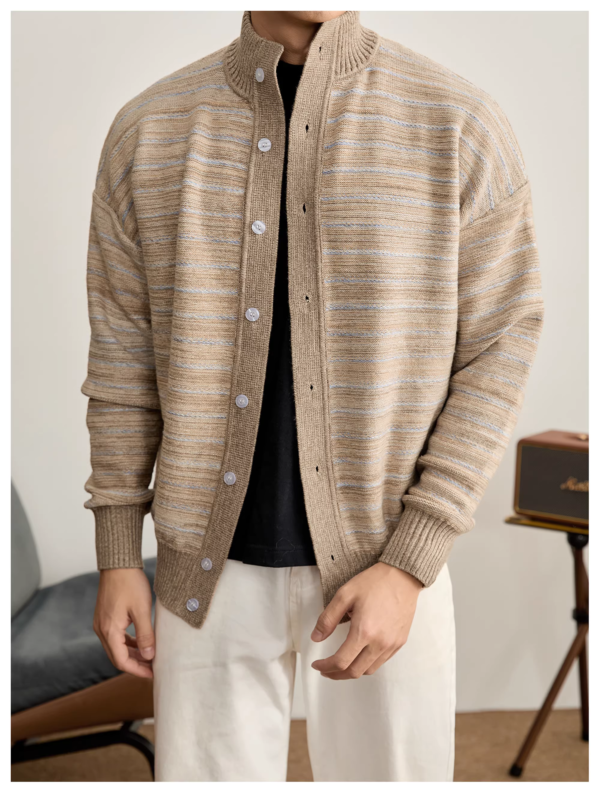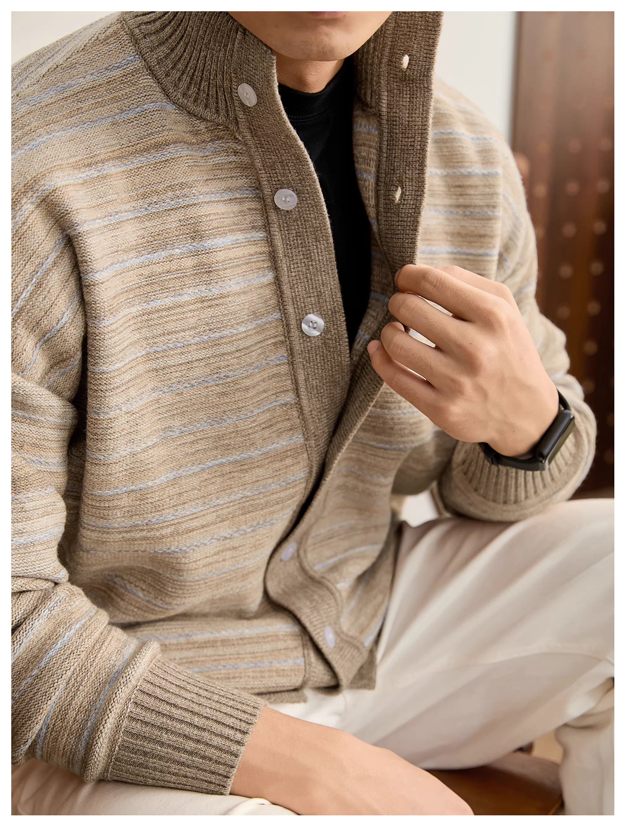 Áo khoác len nam kiểu dáng cổ điển LUUD, chất liệu sợi chống xù, phối màu sọc, cổ đứng, kiểu cardigan