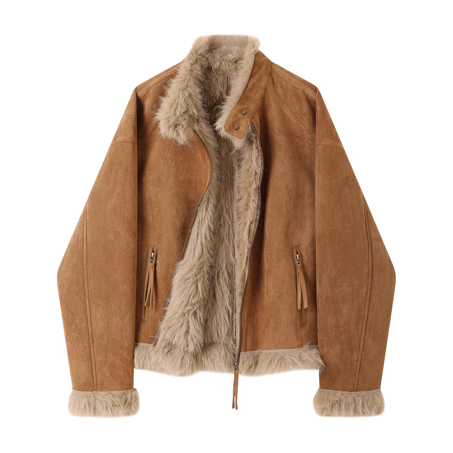 - Áo khoác lông cừu ngắn cổ tròn kiểu Mỹ cổ điển dành cho nữ, áo khoác lông cao cấp dáng ôm vừa vặn mùa đông