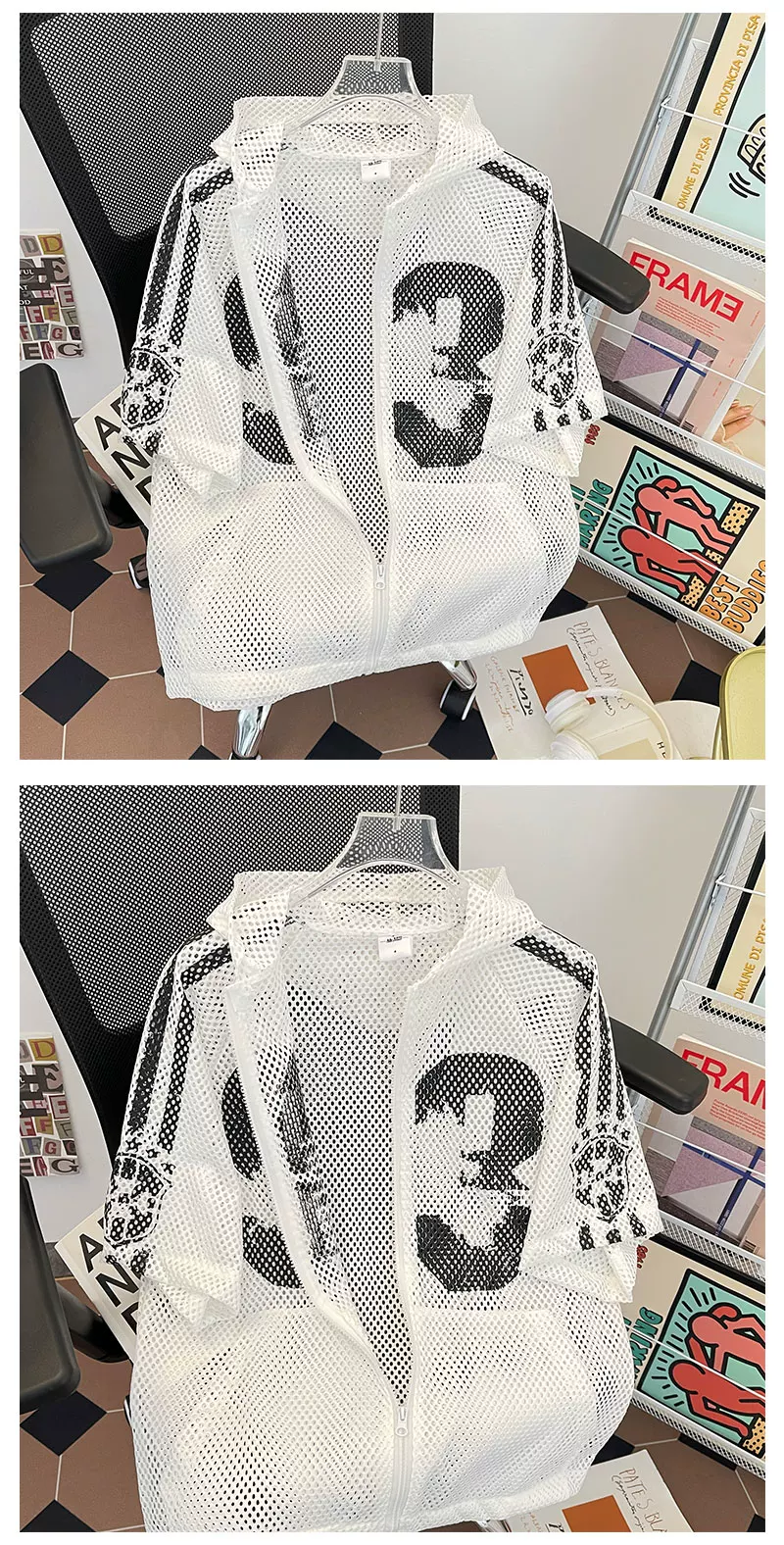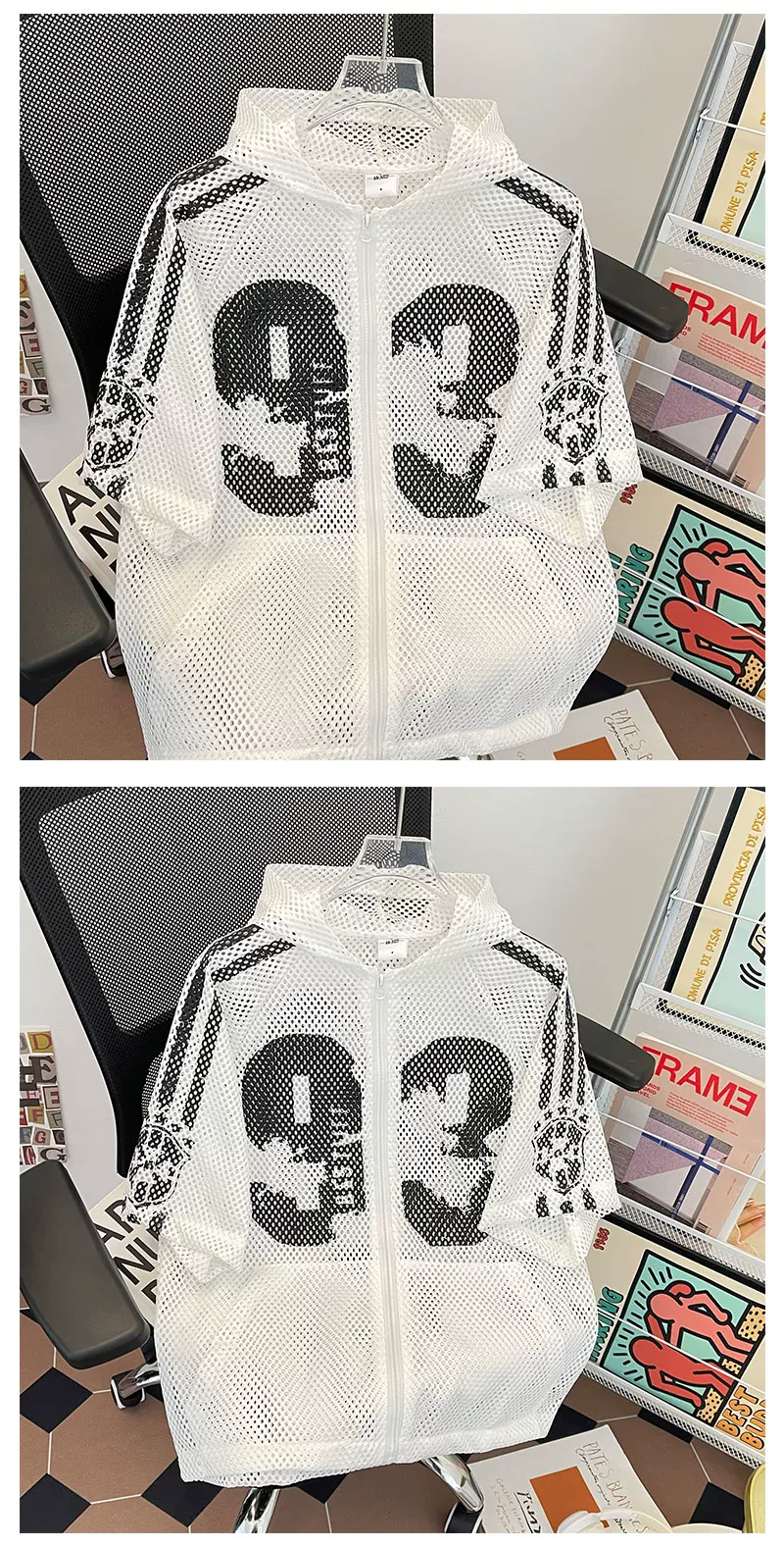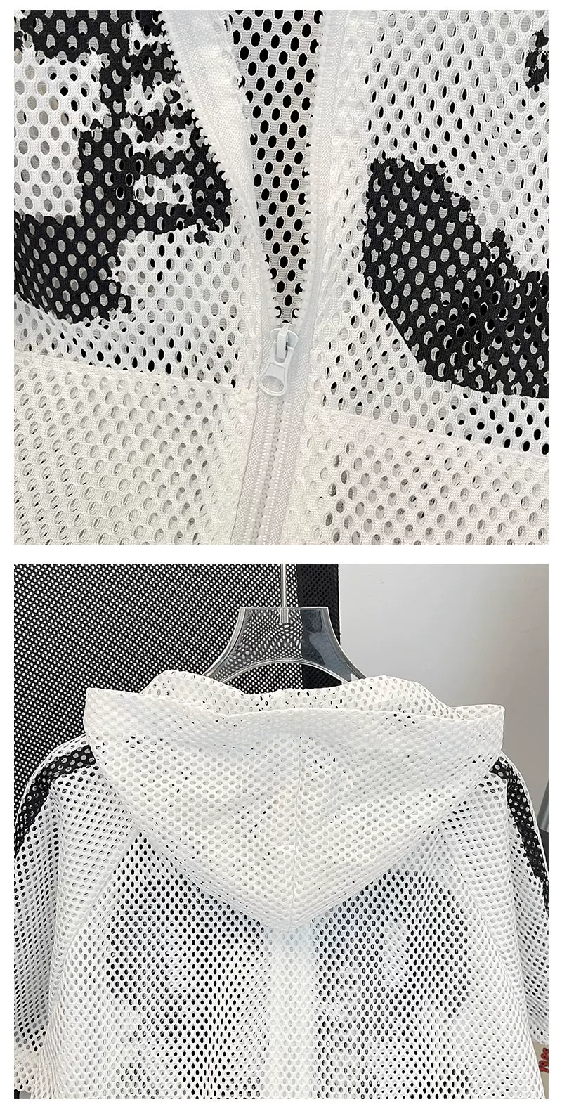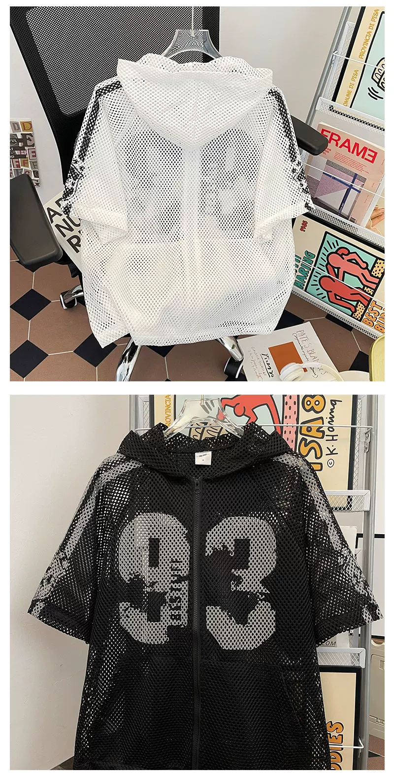 Áo khoác lưới ngắn tay mùa hè, kiểu dáng unisex, thời trang, rộng rãi, có mũ, phong cách Mỹ, áo chống nắng cho cặp đôi