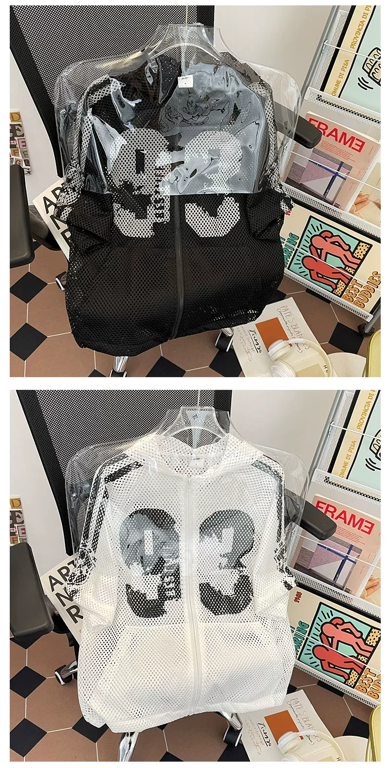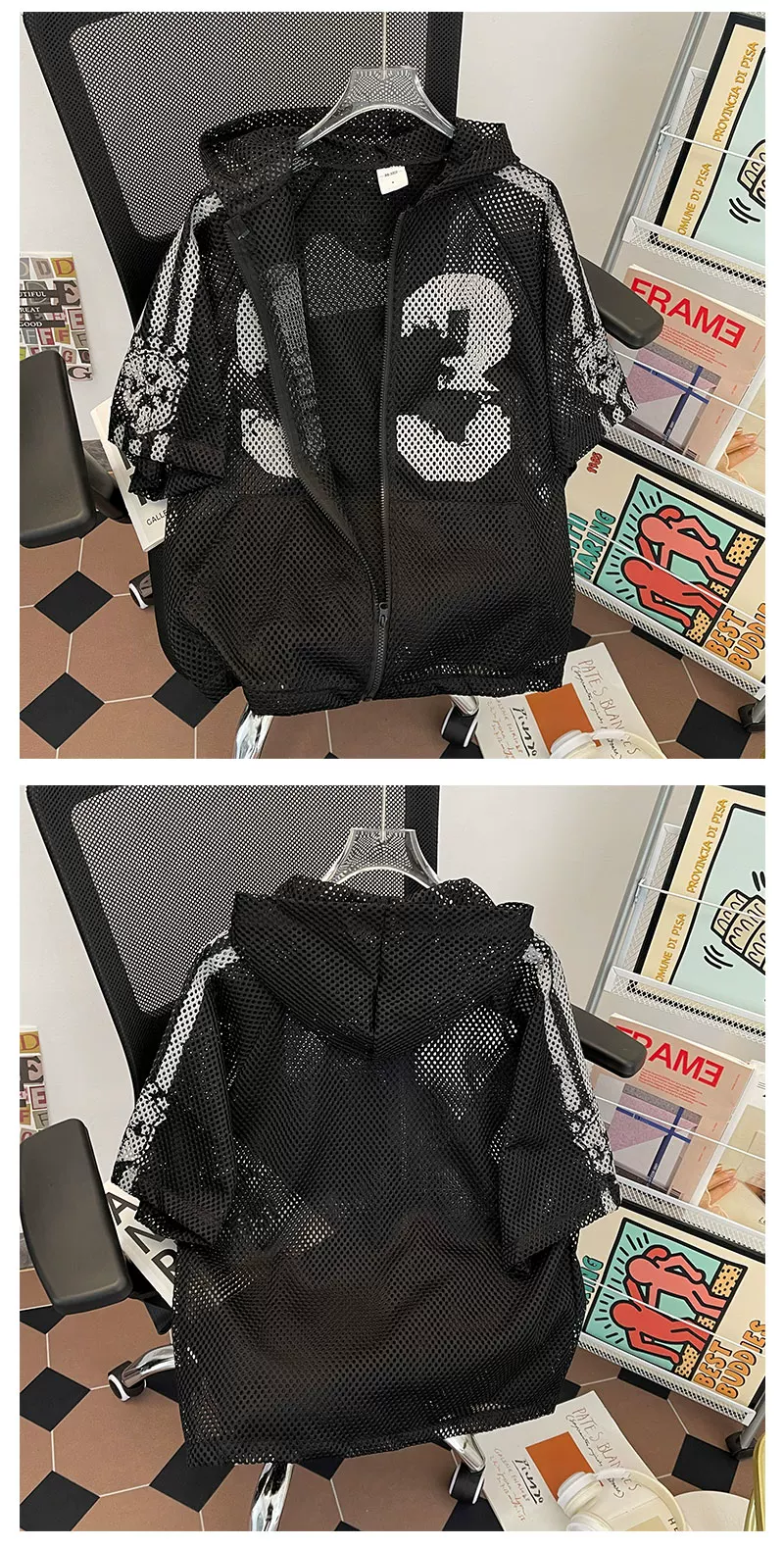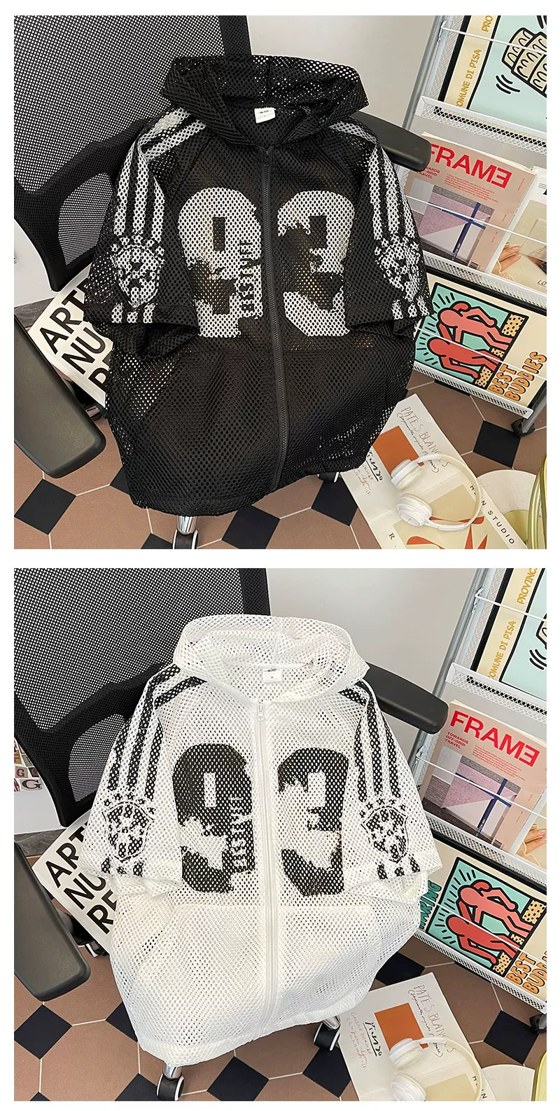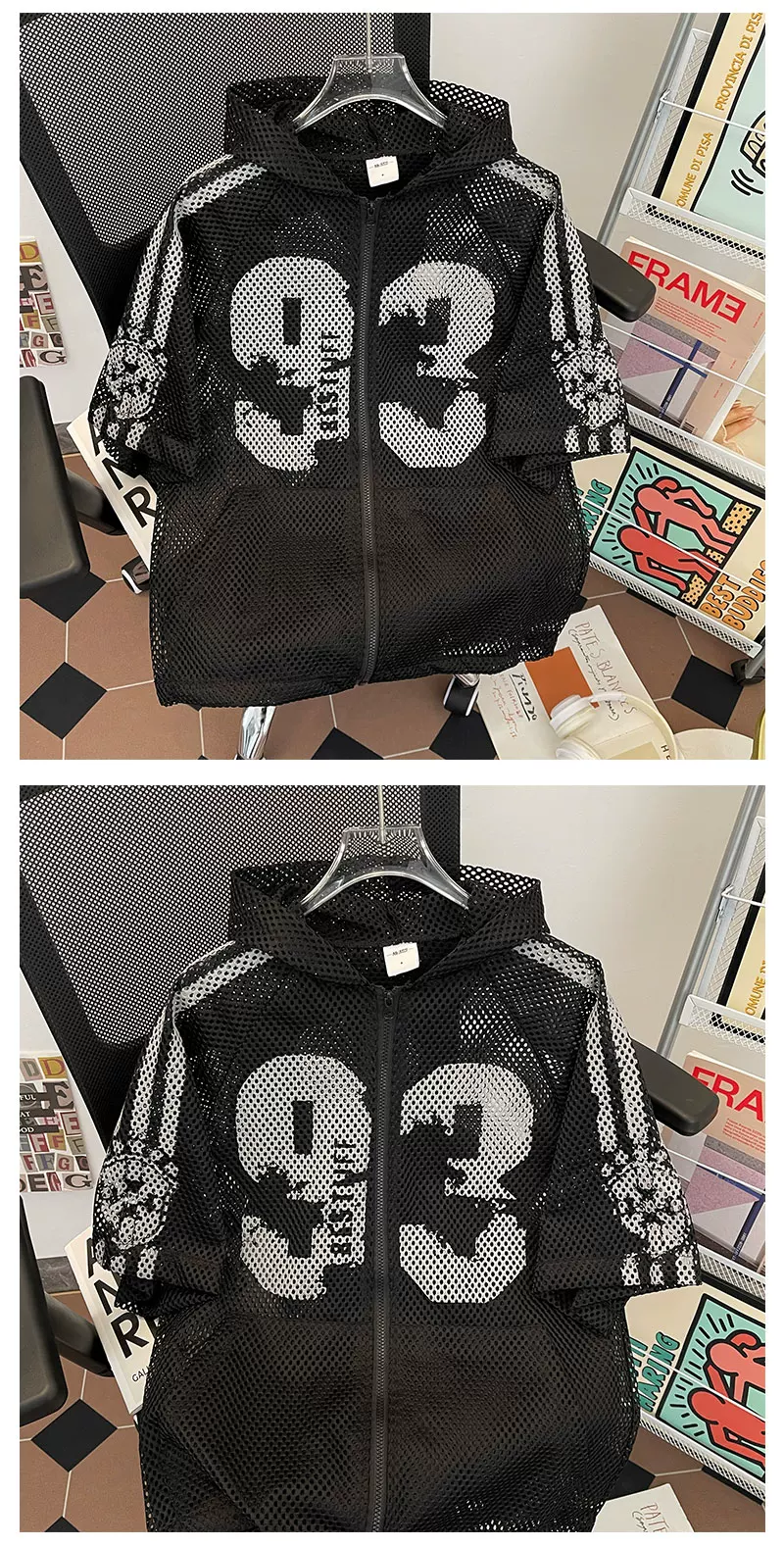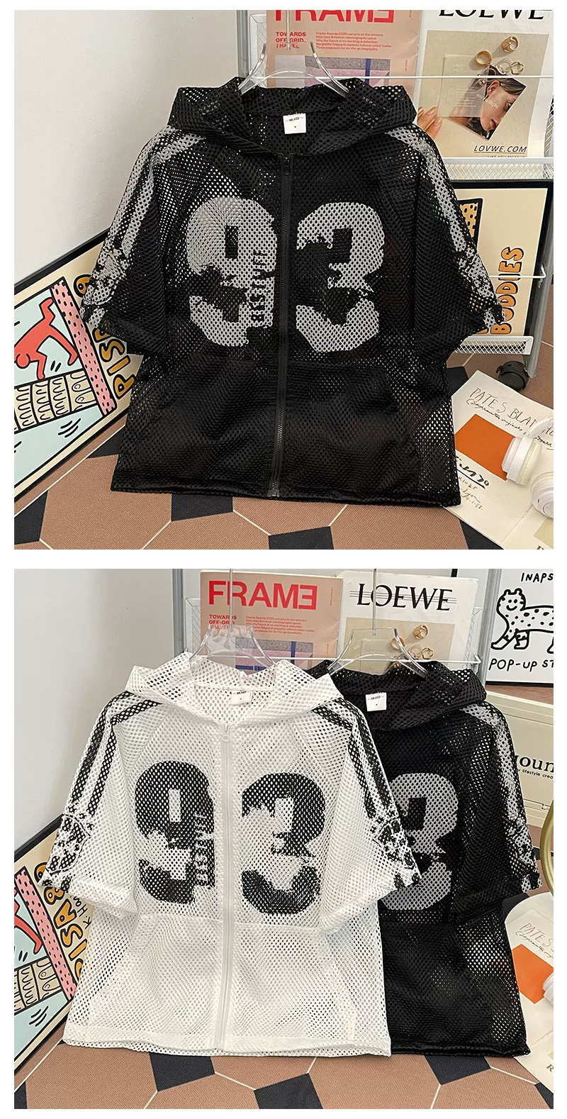 Áo khoác lưới ngắn tay mùa hè, kiểu dáng unisex, thời trang, rộng rãi, có mũ, phong cách Mỹ, áo chống nắng cho cặp đôi
