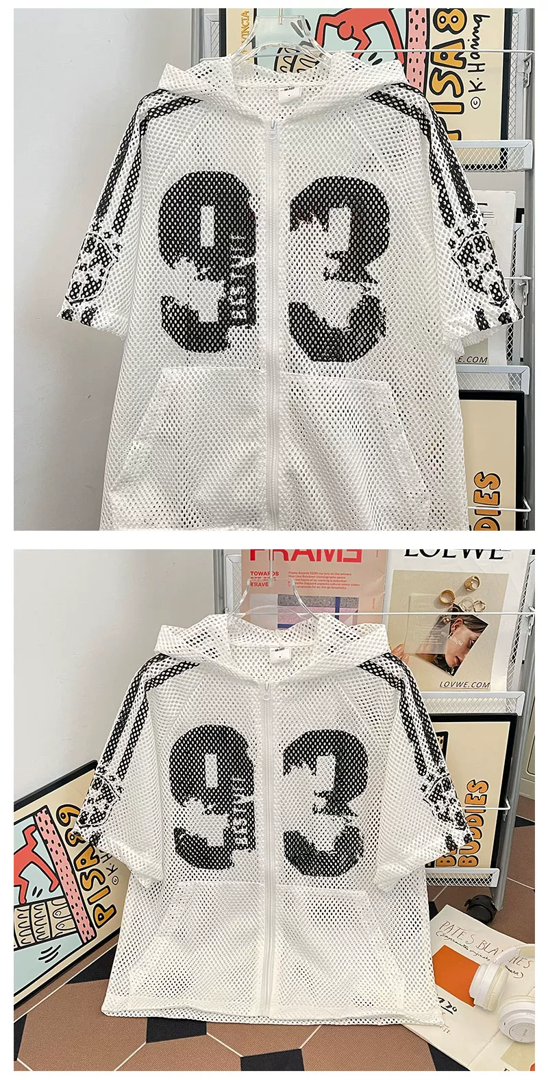 - Áo khoác lưới ngắn tay mùa hè, kiểu dáng unisex, thời trang, rộng rãi, có mũ, phong cách Mỹ, áo chống nắng cho cặp đôi