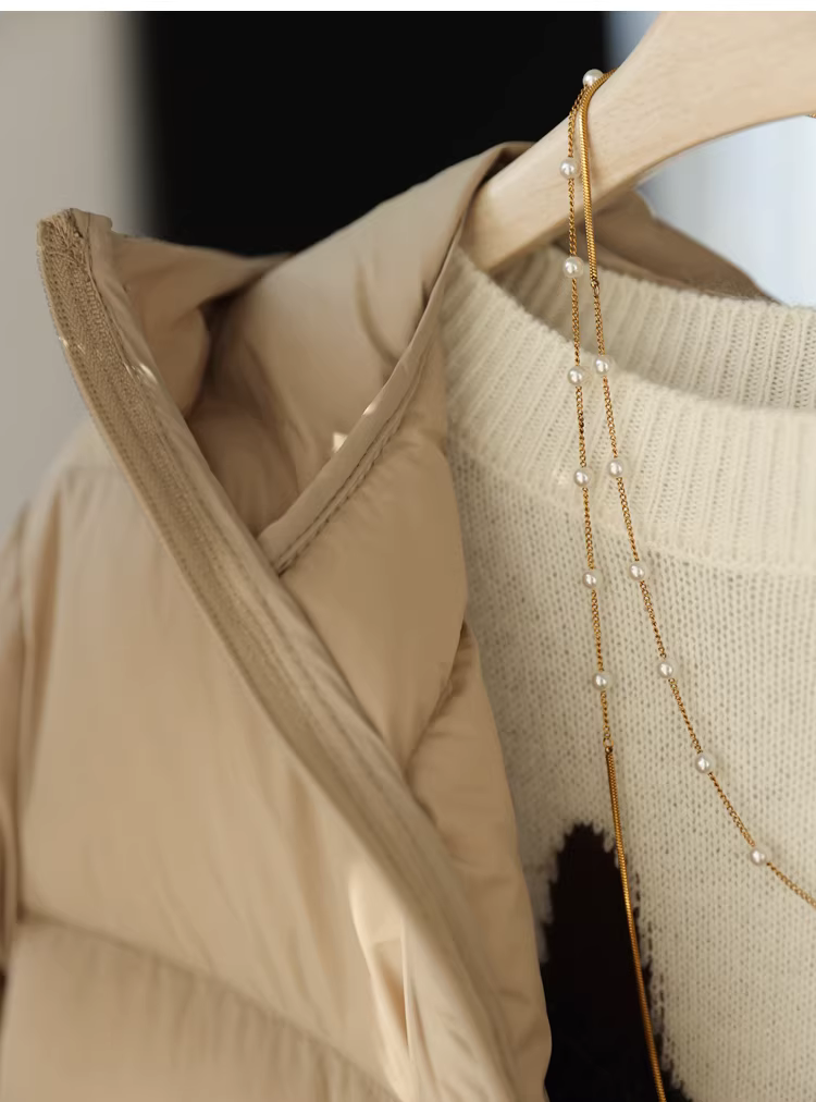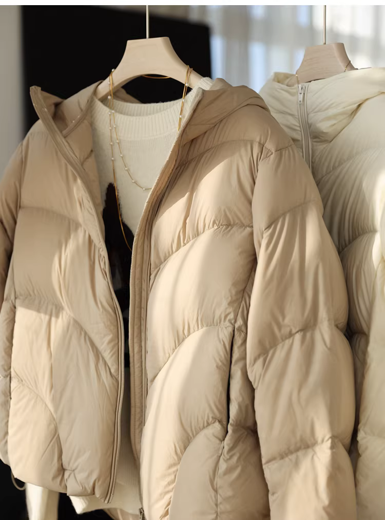 Áo khoác phao nữ mùa đông, dáng rộng, có mũ, chất liệu lông vũ trắng 90%, độ phồng cao 1700+, kiểu may cong.