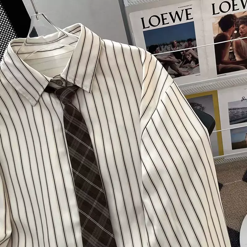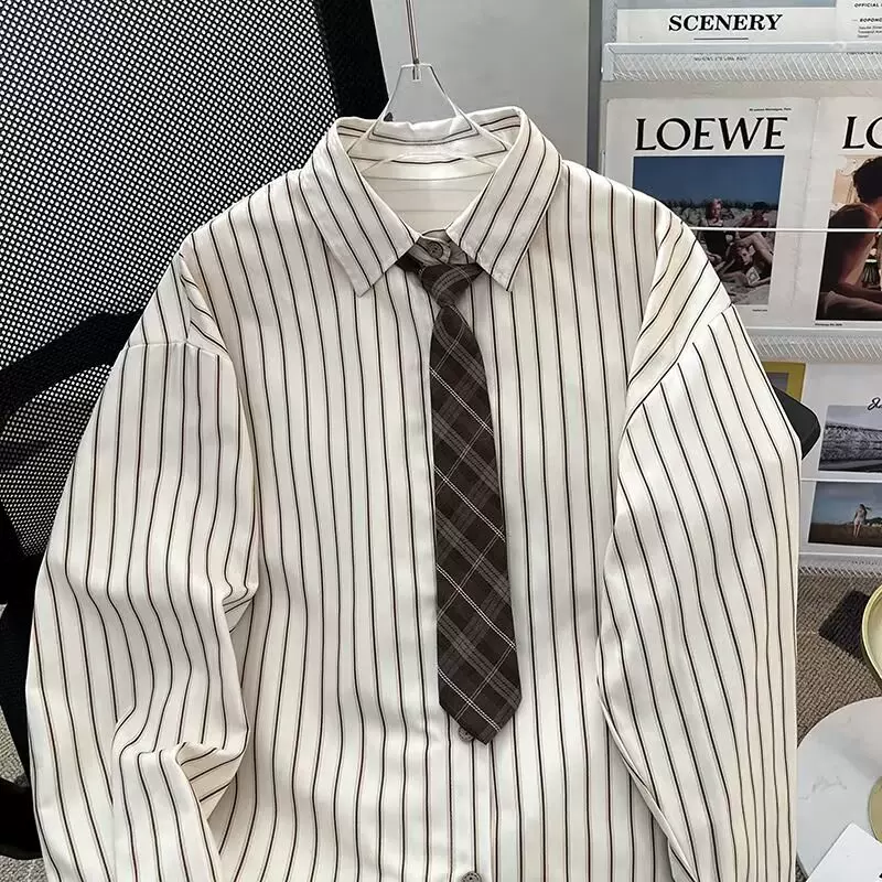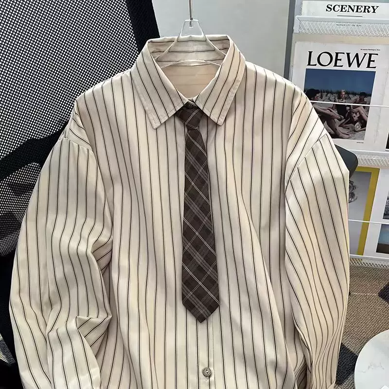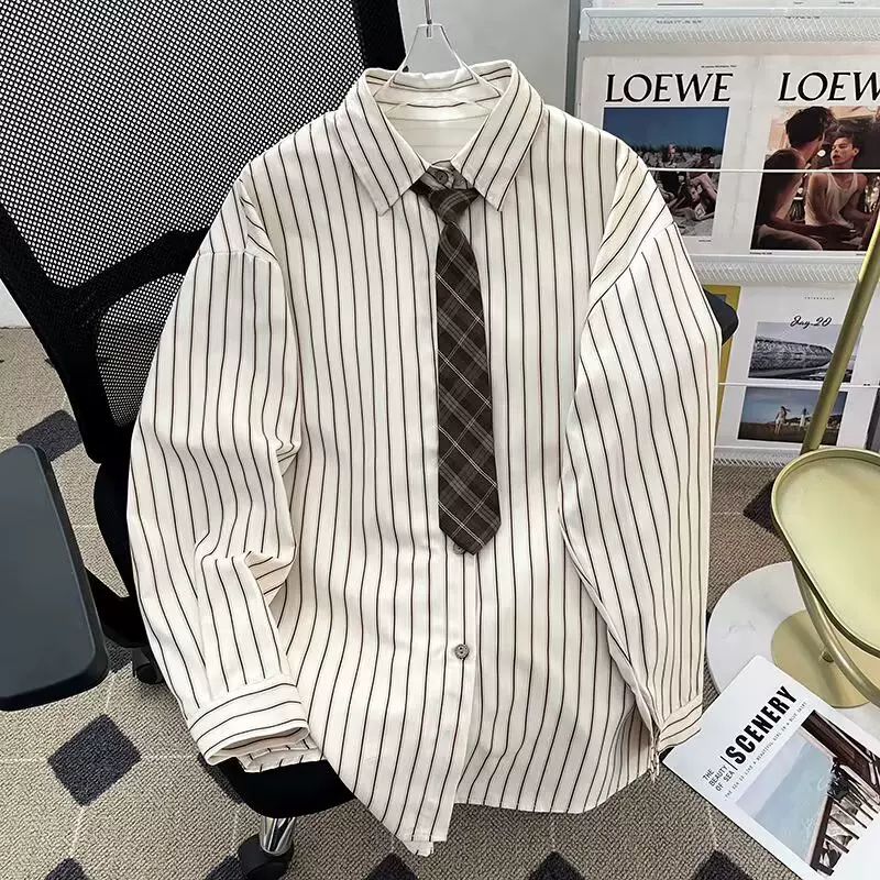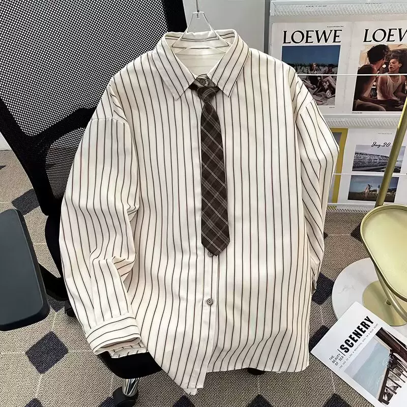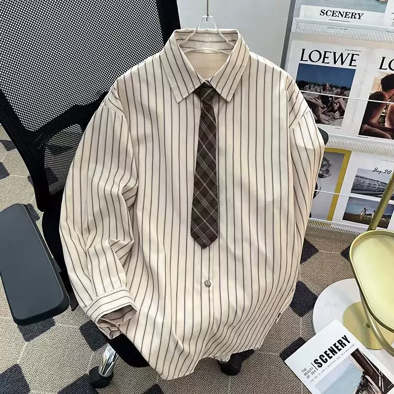 - Áo khoác sơ mi sọc cổ điển Nhật Bản dành cho nam, dáng rộng, áo sơ mi dài tay sành điệu có cà vạt, thiết kế xuân thu.