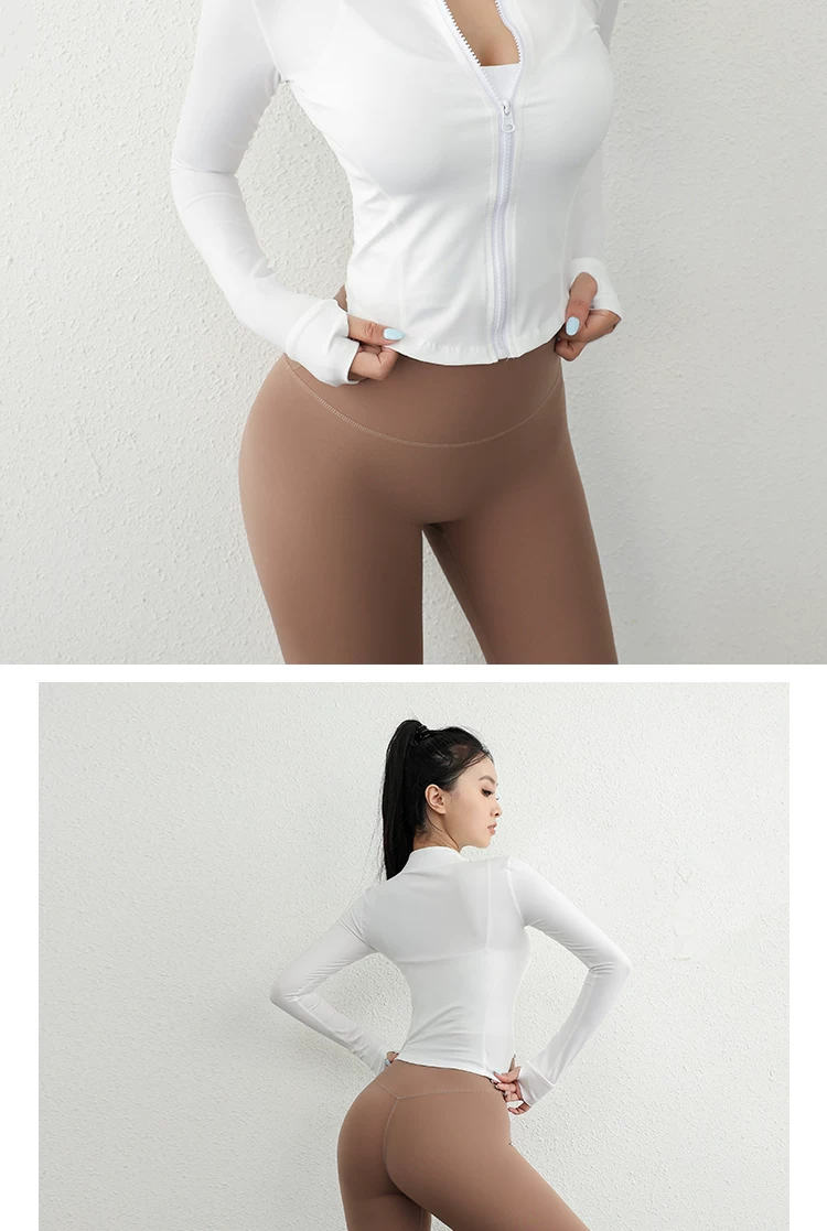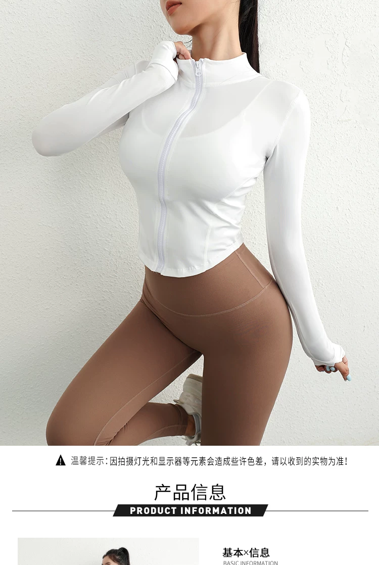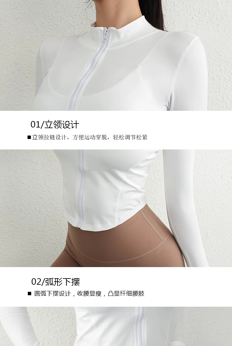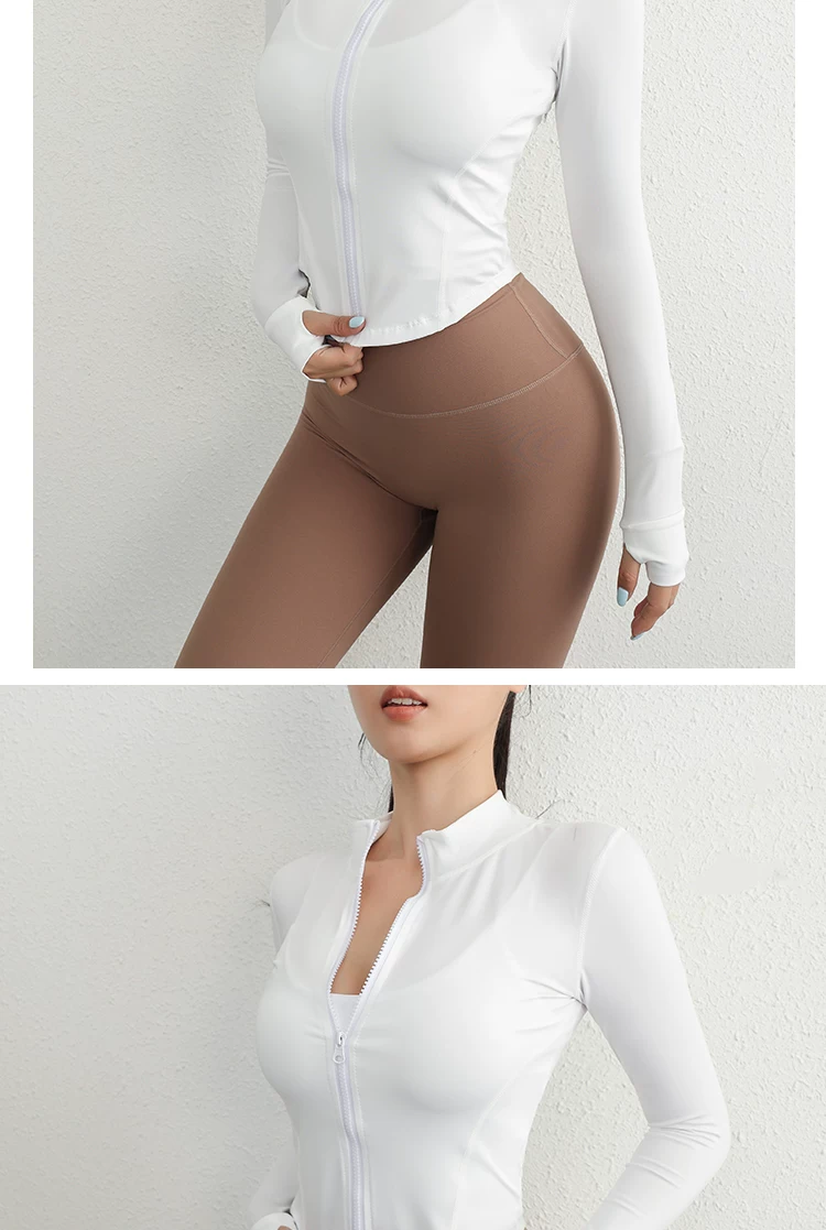 - Áo khoác thể thao cổ đứng dành cho nữ, áo tập gym màu trắng ôm sát, áo yoga dài tay nhanh khô, kiểu dáng ôm sát có khóa kéo.