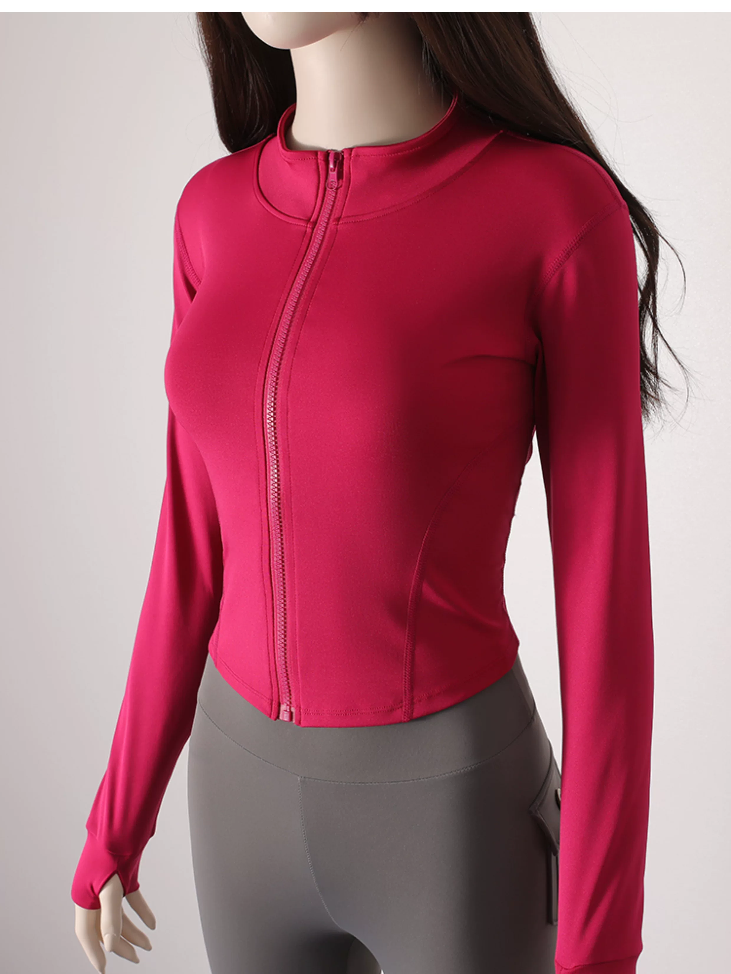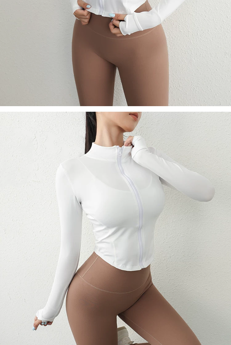 Áo khoác thể thao cổ đứng dành cho nữ, áo tập gym màu trắng ôm sát, áo yoga dài tay nhanh khô, kiểu dáng ôm sát có khóa kéo.