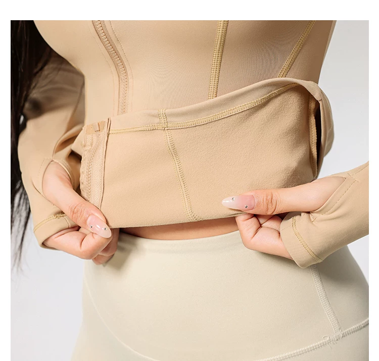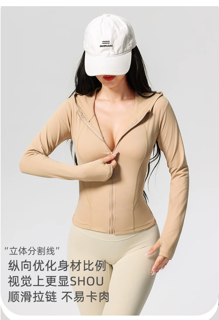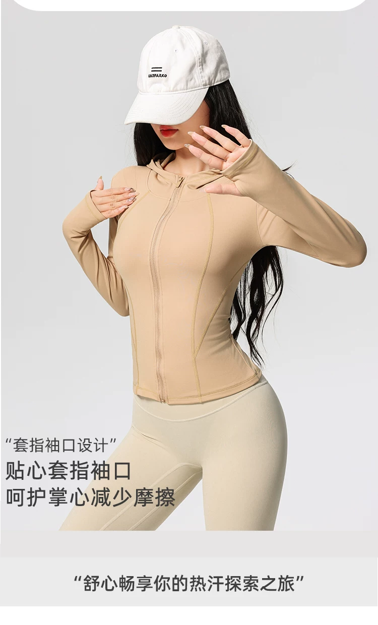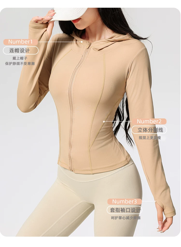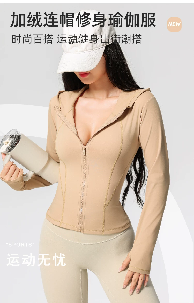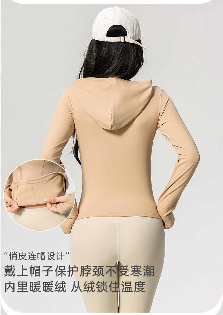 Áo khoác thể thao nhung mỏng dành cho nữ, trang phục tập yoga, áo khoác chạy bộ lót lông cừu tập thể dục, áo khoác dài tay mùa thu đông, áo có mũ trùm đầu tập luyện ngoài trời