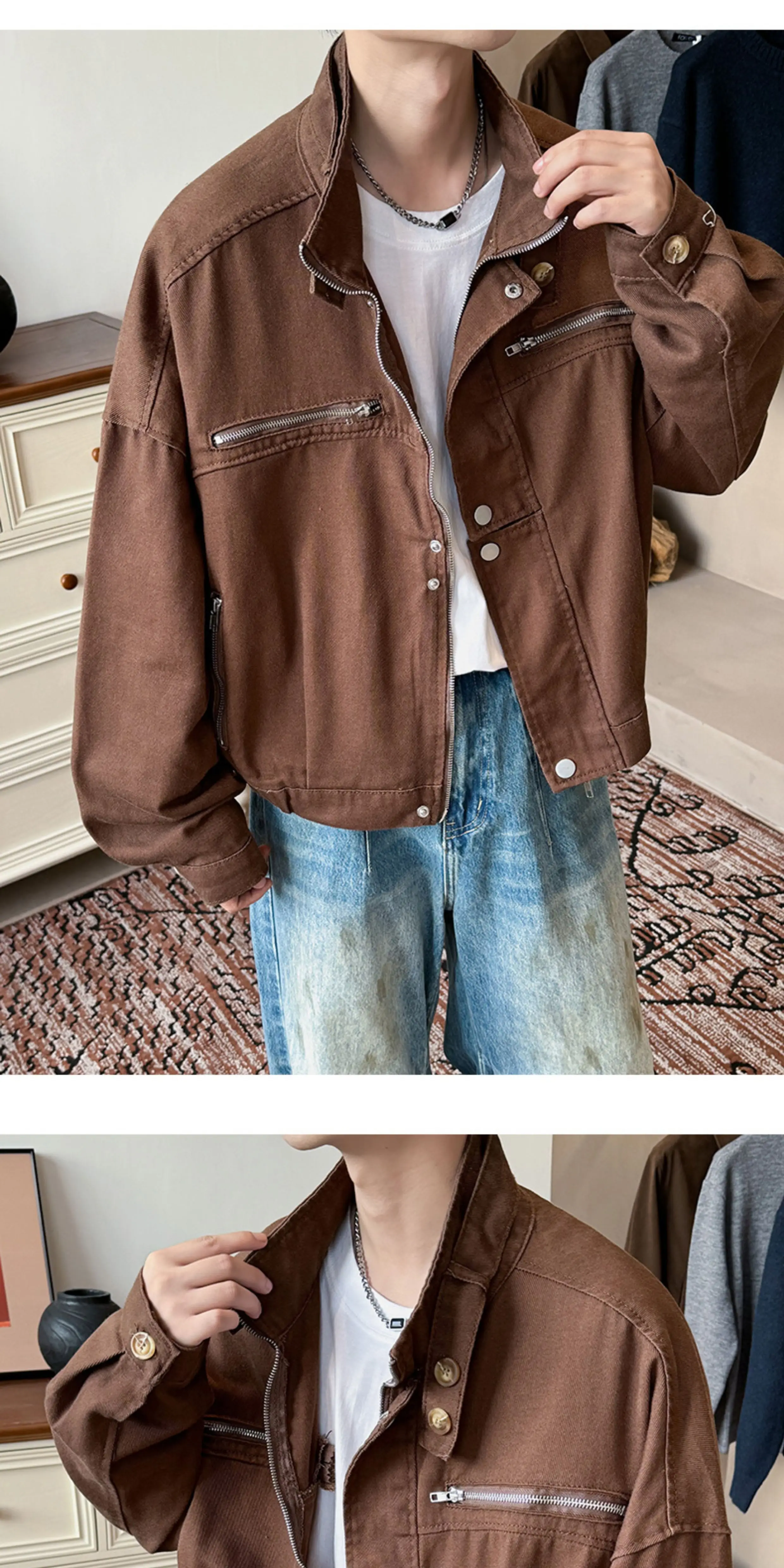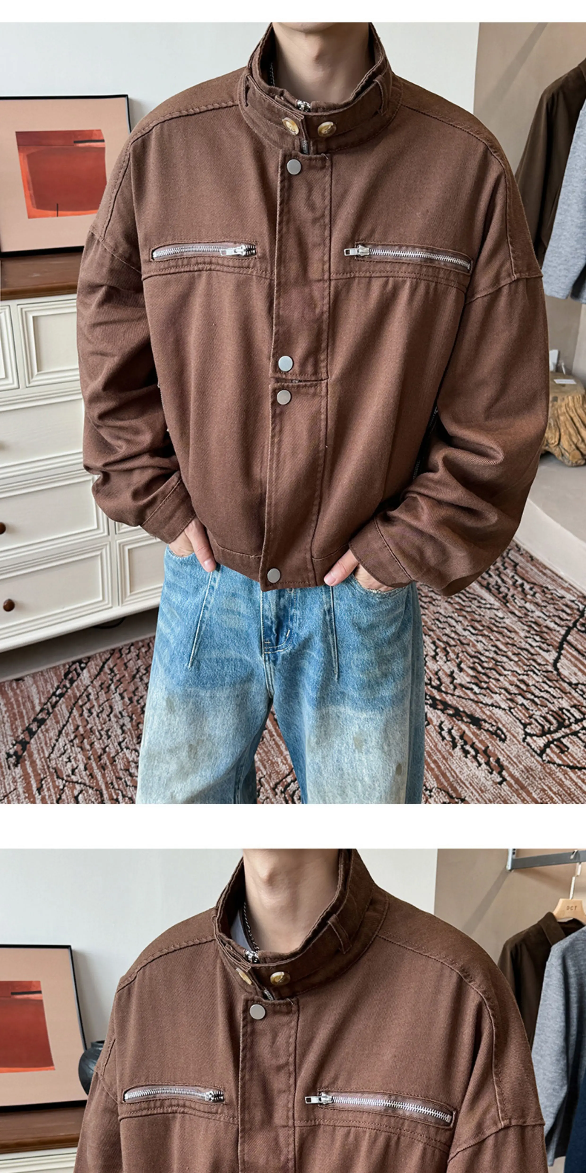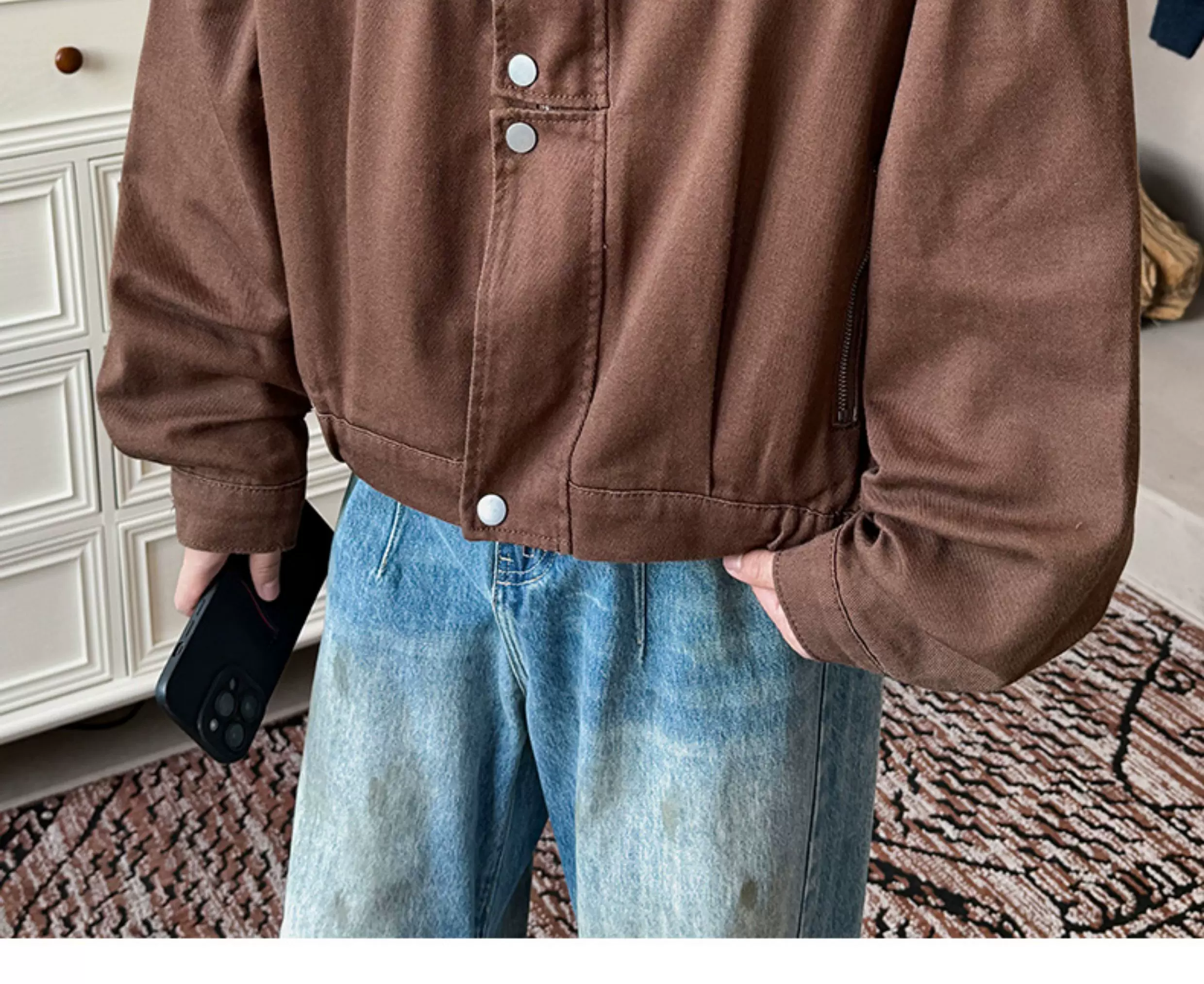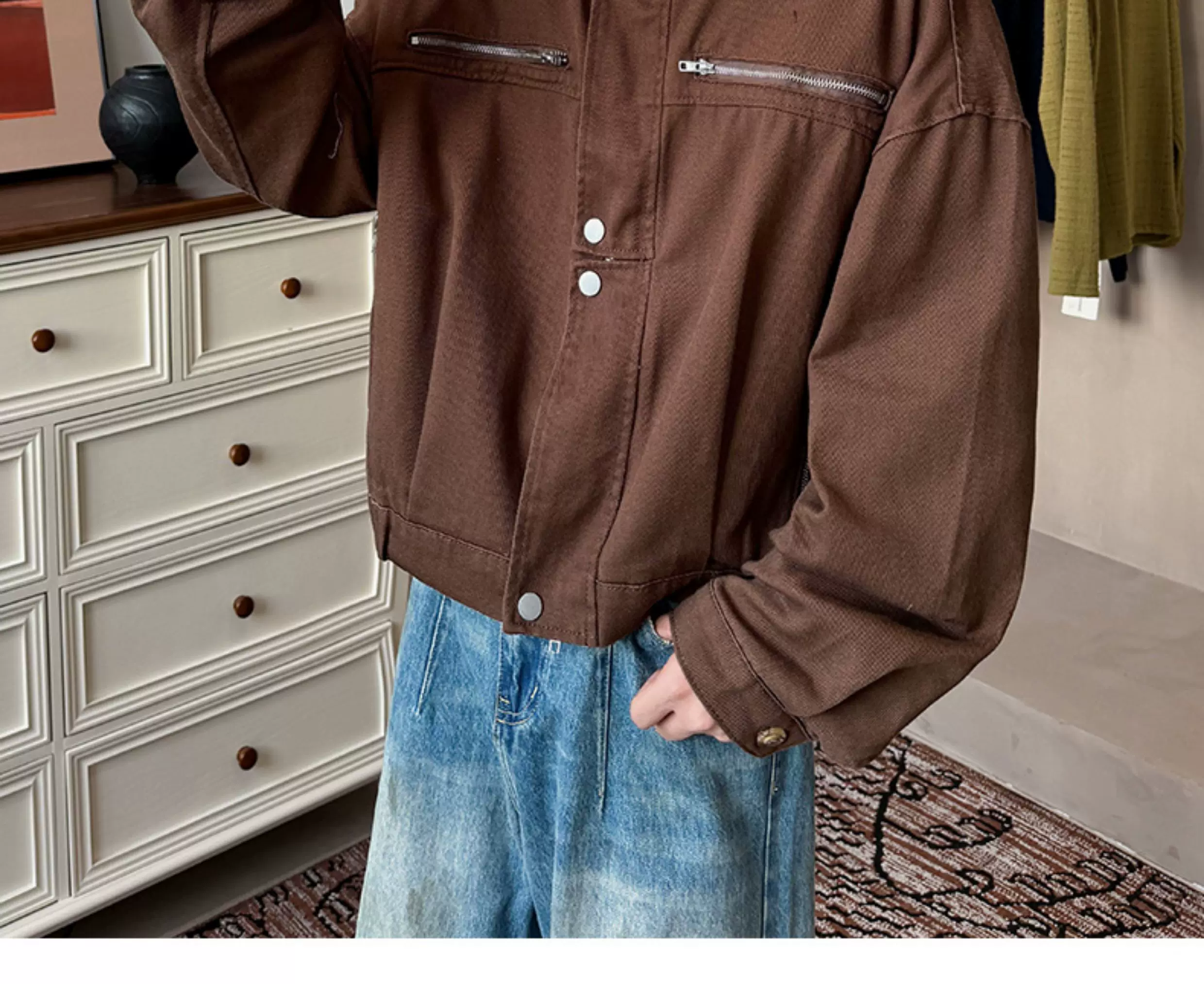 - Áo khoác workwear nam kiểu Mỹ cổ điển, phong cách retro, chất liệu dày dặn, dáng rộng, thời trang thu đông, kiểu biker ngắn.
