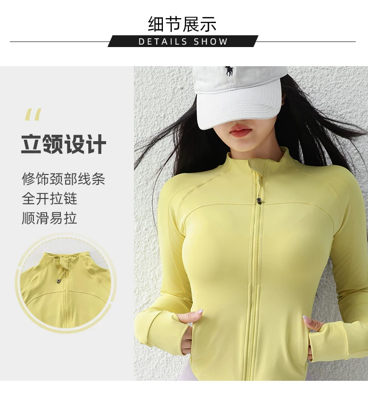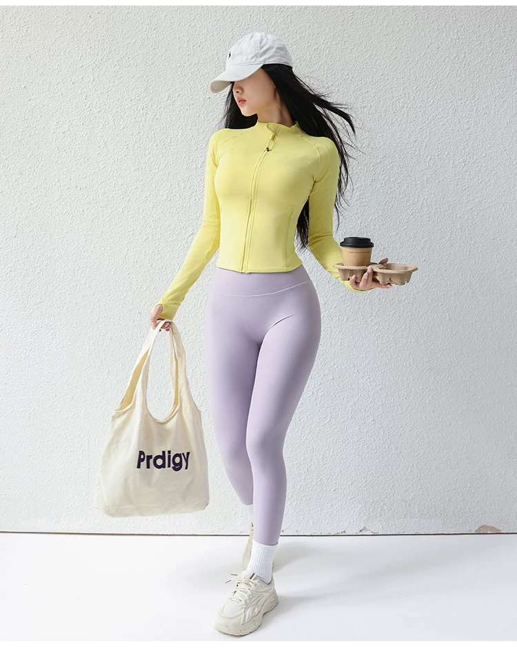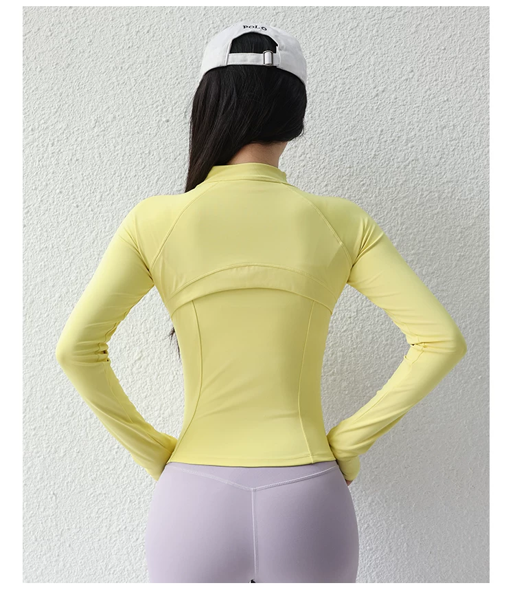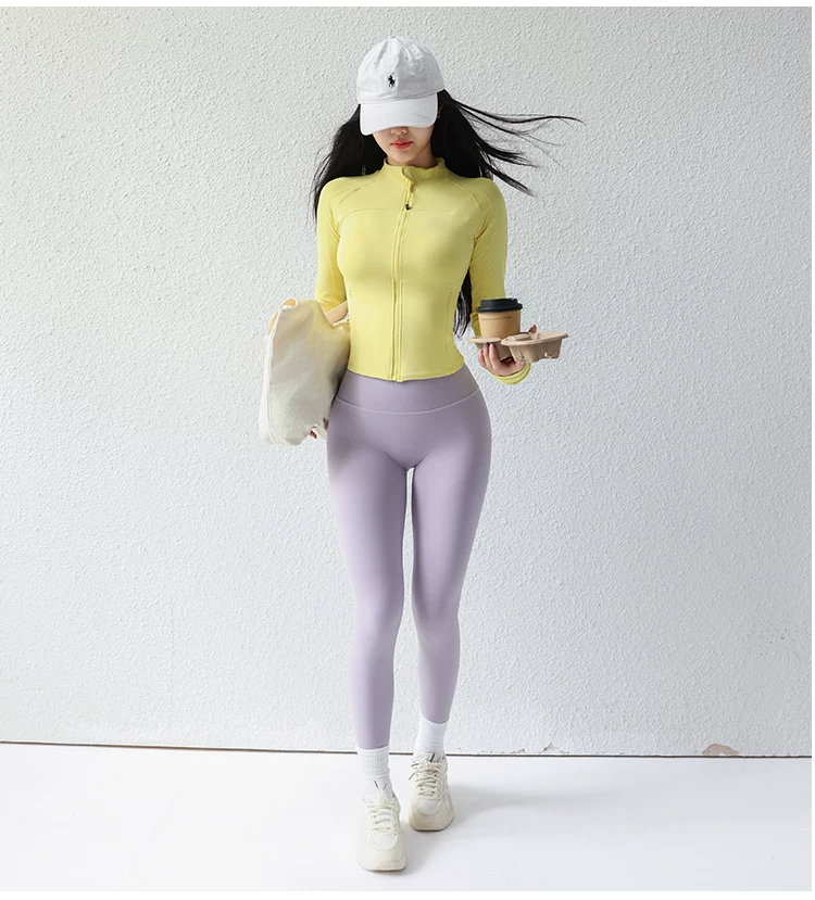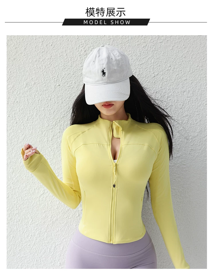- Áo khoác yoga cổ đứng ngắn cho nữ, áo thể thao ôm sát có gân, trang phục tập luyện Pilates, tay áo dài.