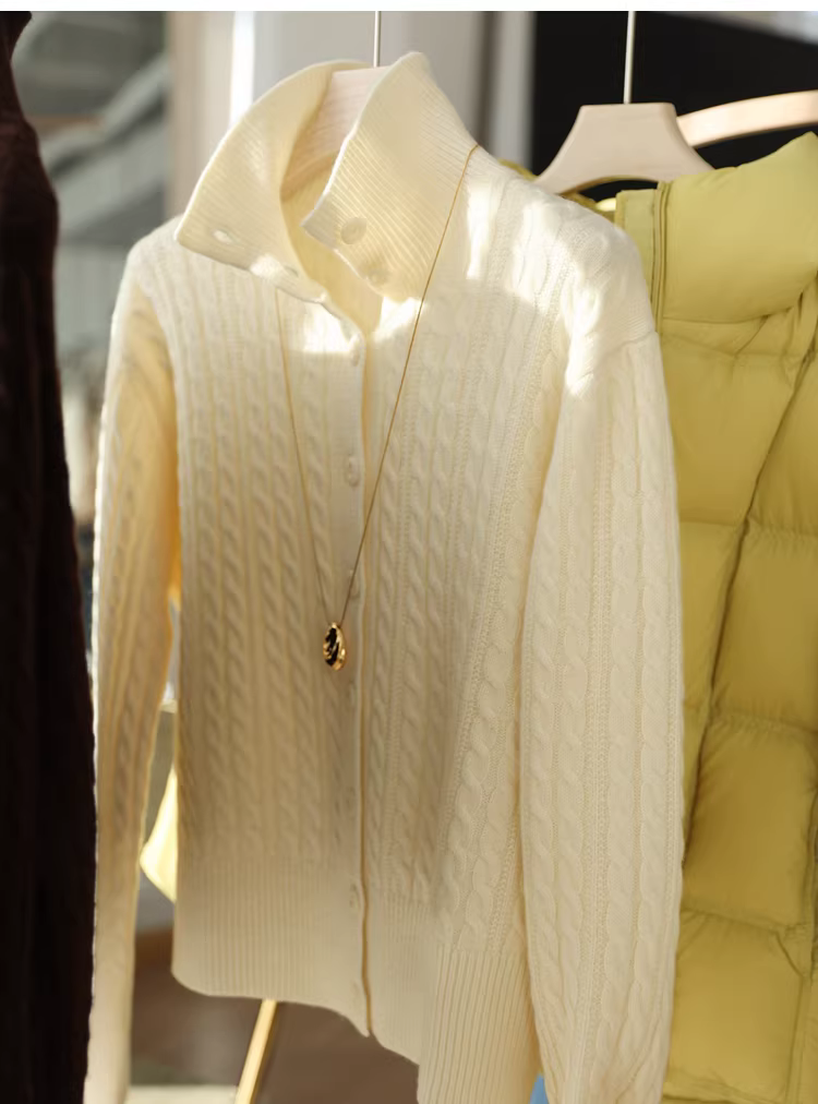 Áo len dày 380g chất liệu len nguyên chất, kiểu dệt cáp cổ điển, cổ cao, cài khuy đơn, kiểu dáng cardigan có ve áo dành cho nữ, mùa thu đông.