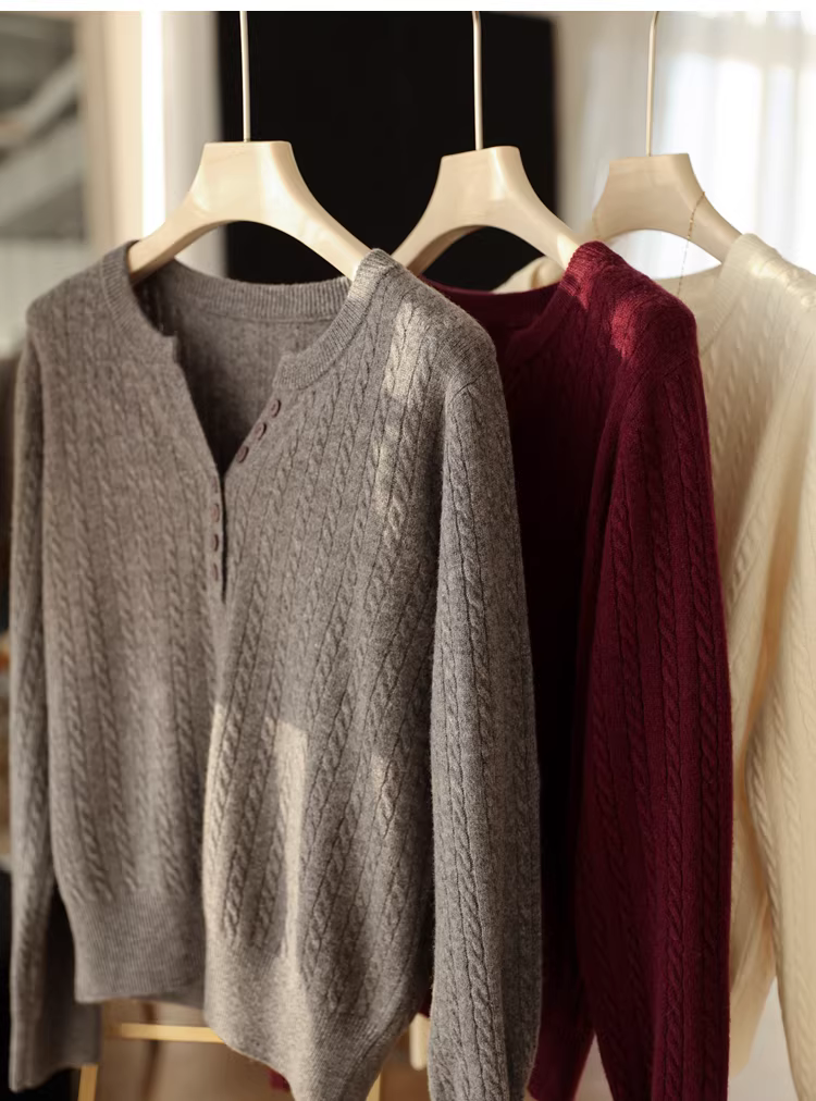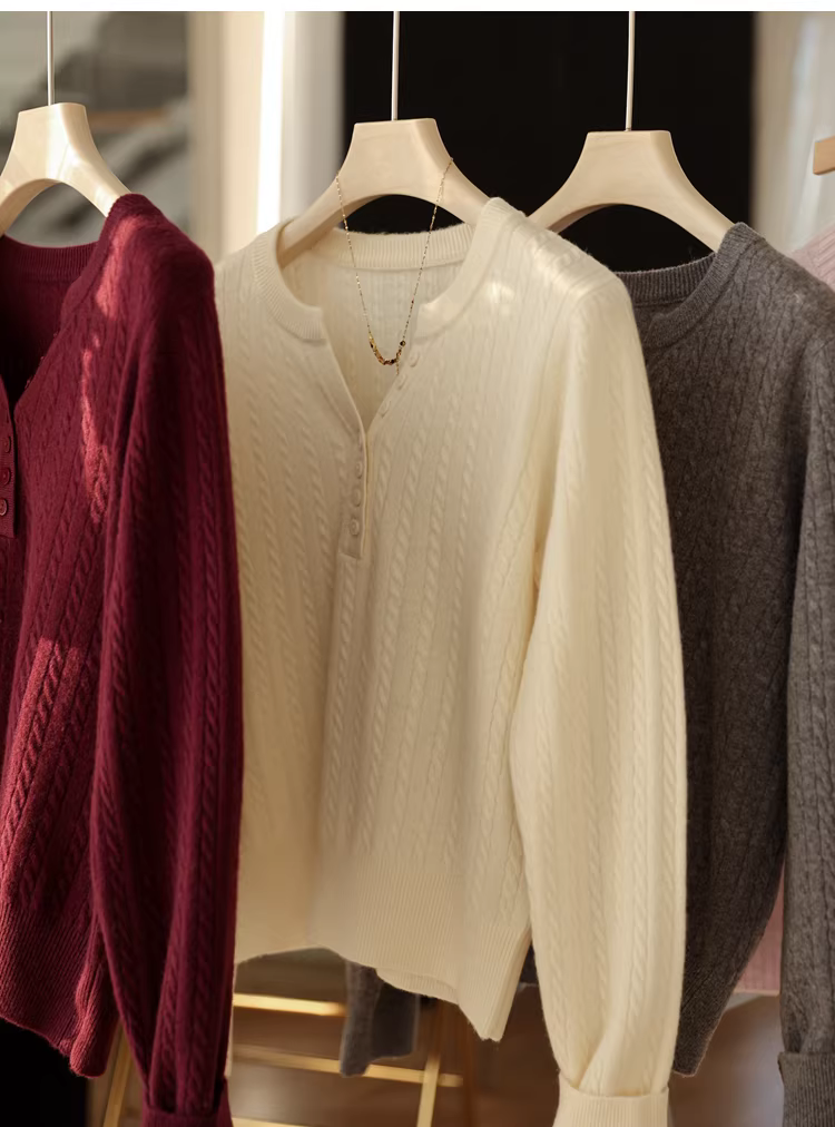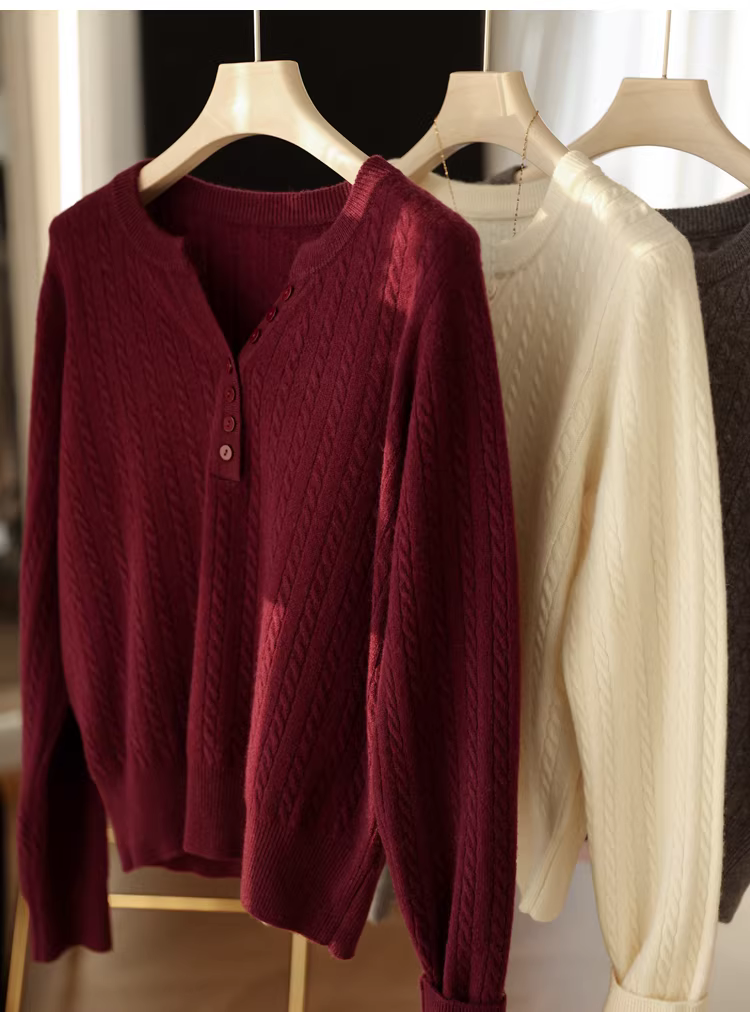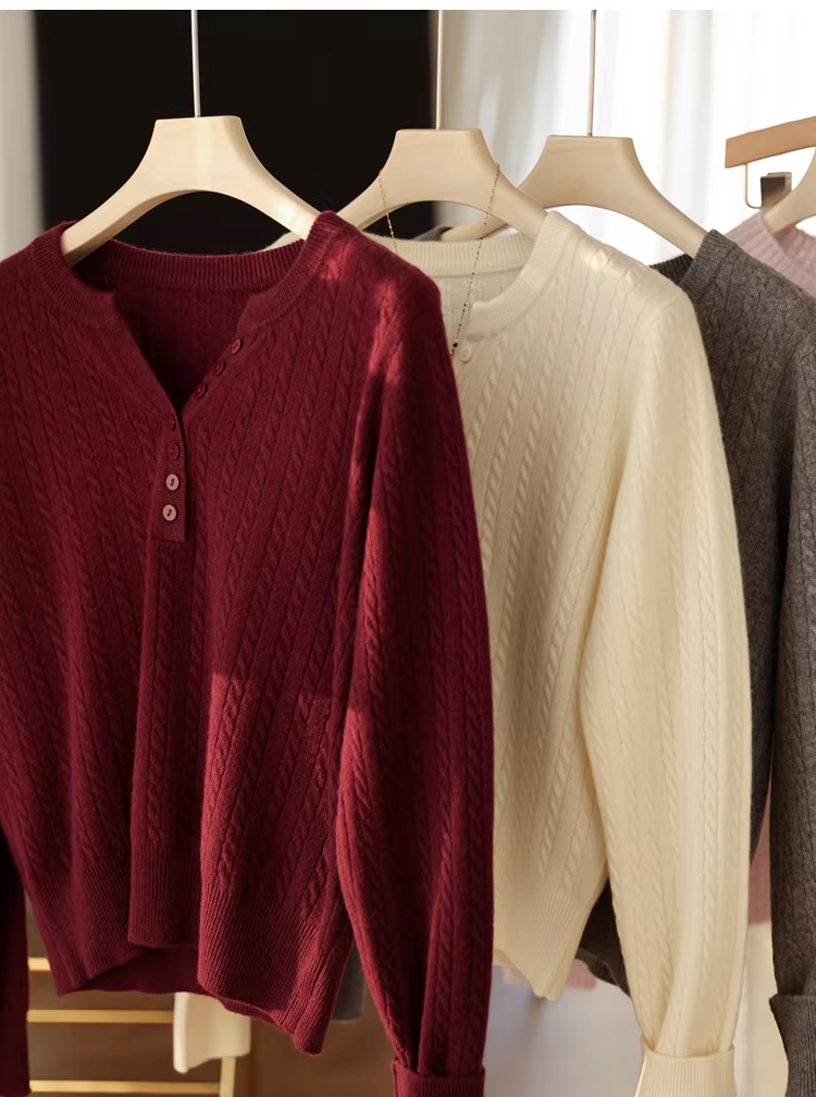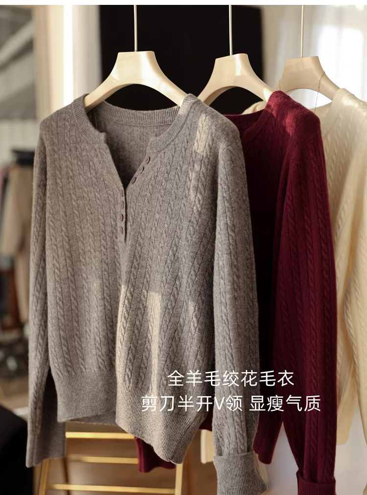 Áo len dệt kim cổ điển 100% len, cổ chữ V, dáng rộng, tôn dáng, áo len chui đầu cổ tròn ngắn dành cho nữ, mùa thu đông.