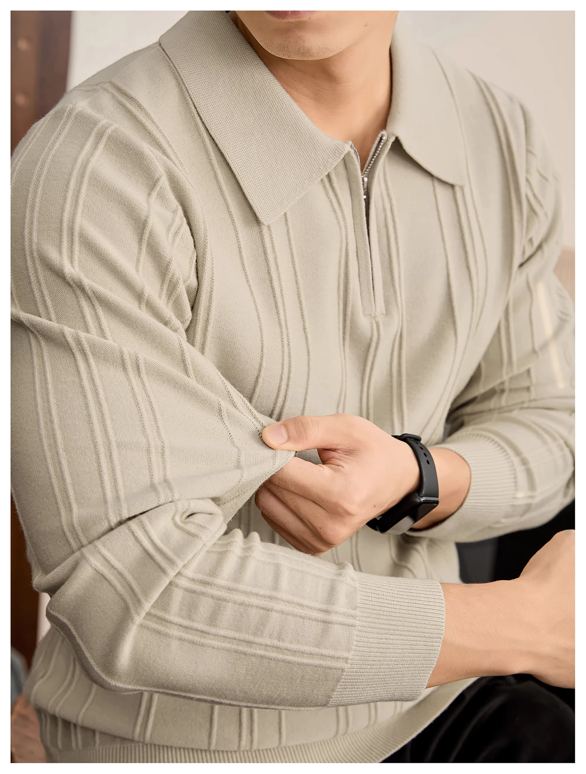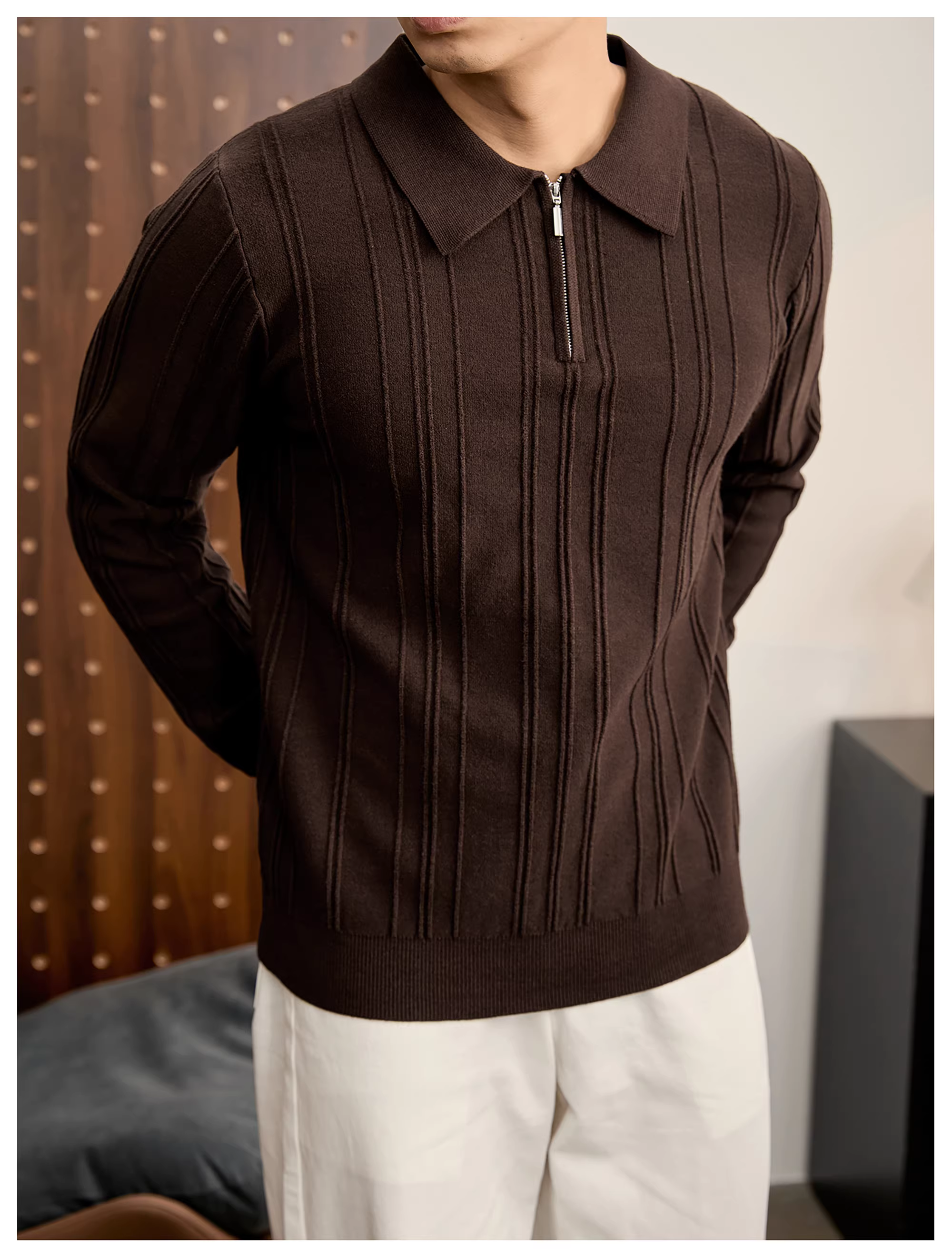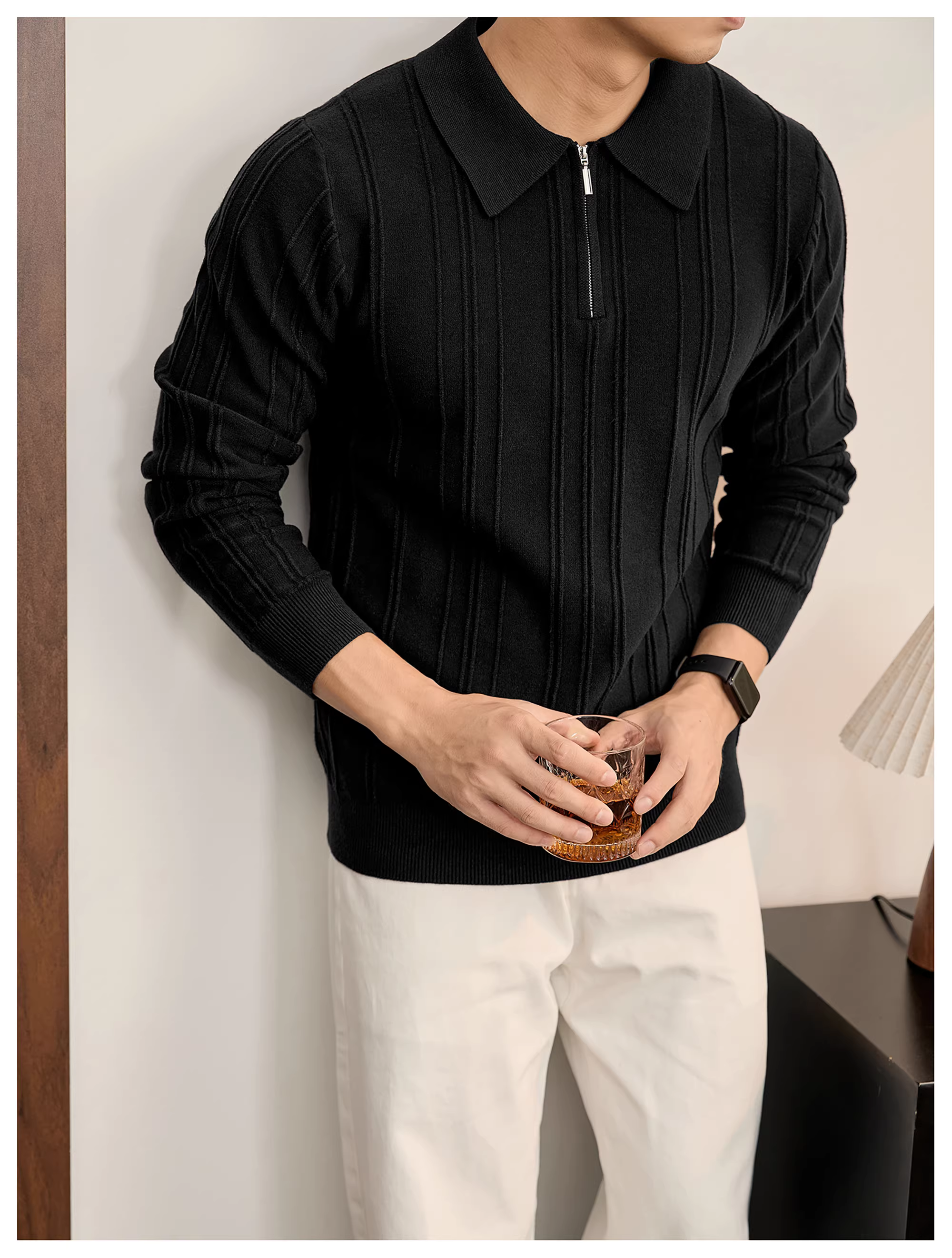 - Áo len dệt kim jacquard có họa tiết dọc LUUD chống xù dành cho nam, áo sơ mi POLO tối giản màu trơn có cổ nửa khóa kéo mùa thu đông