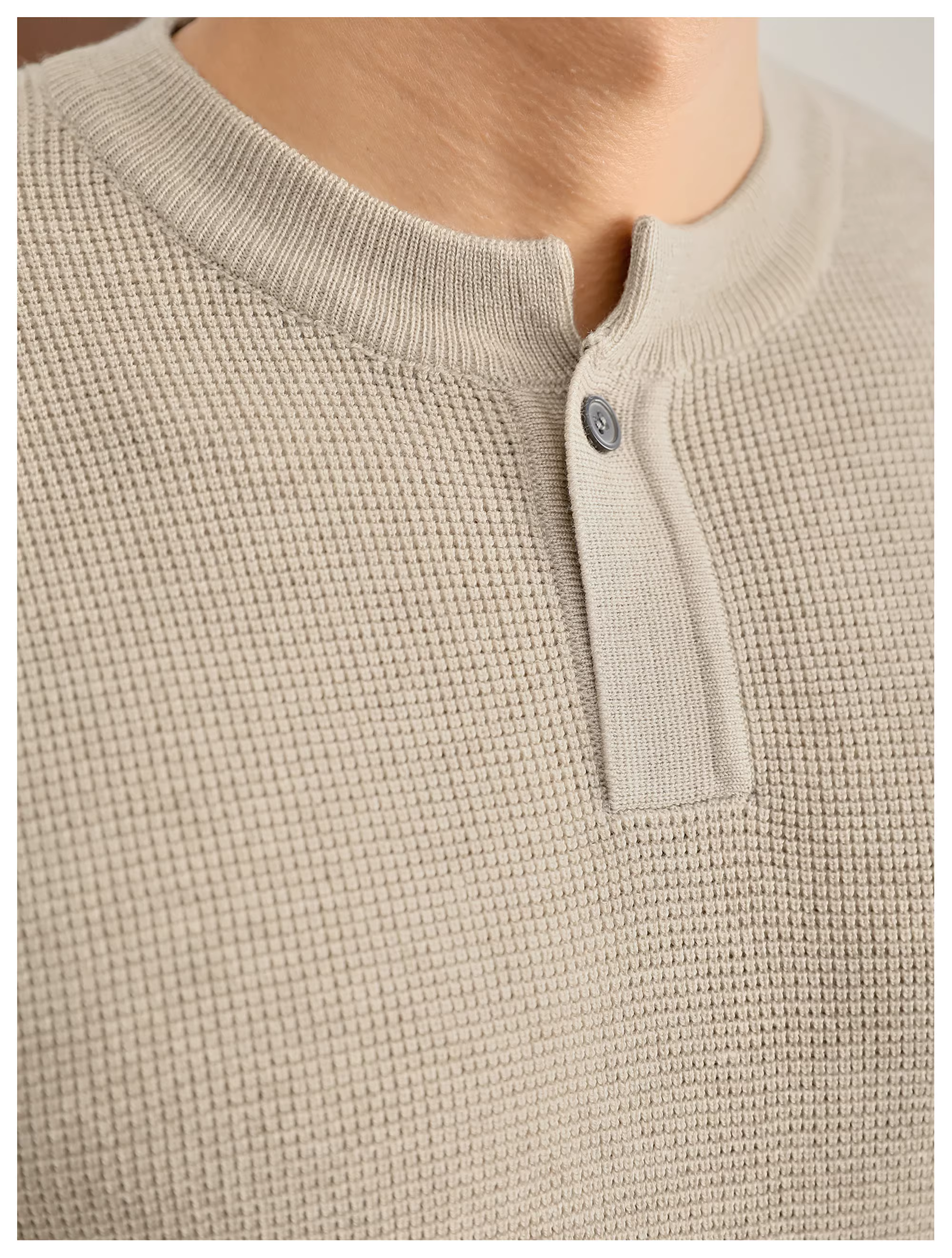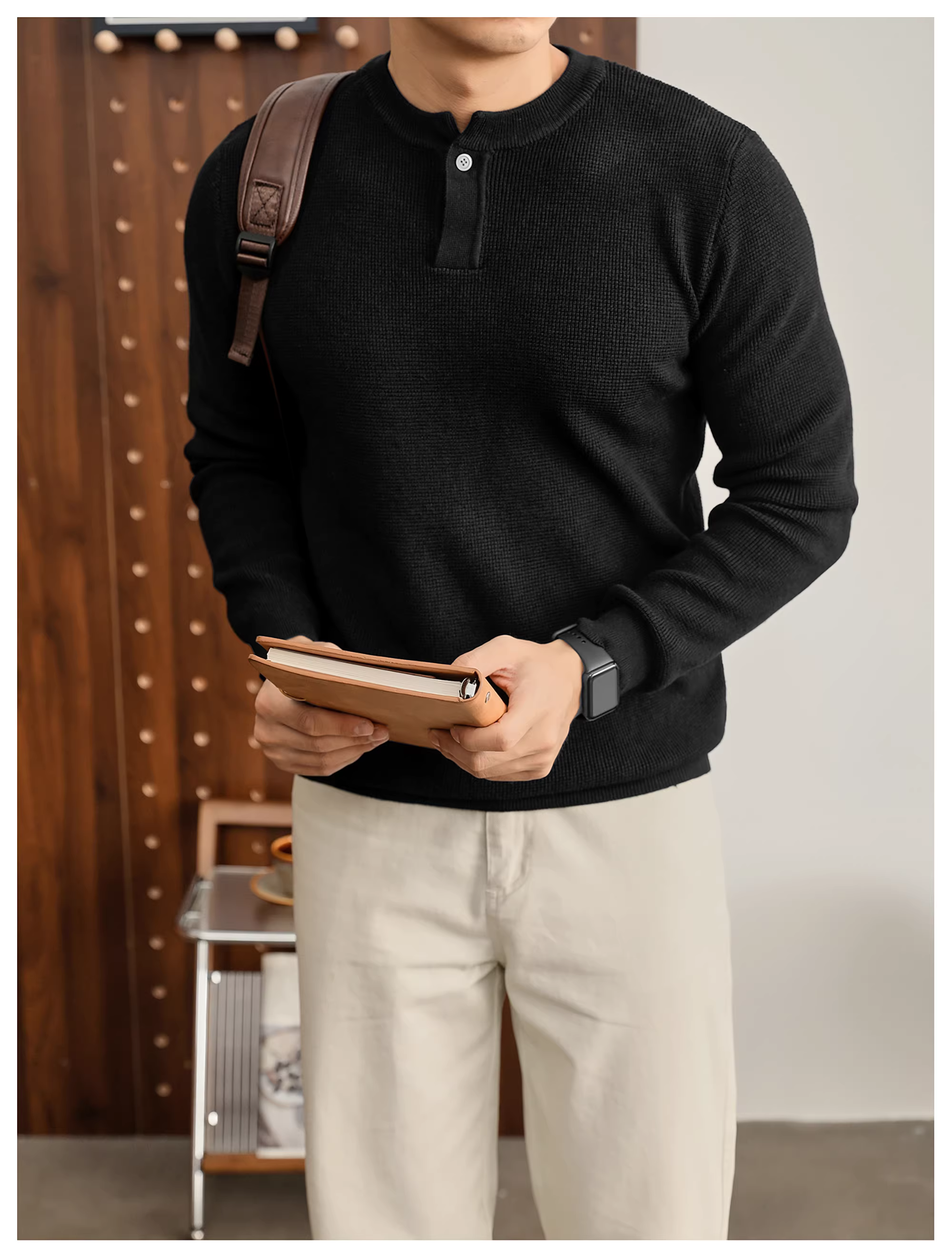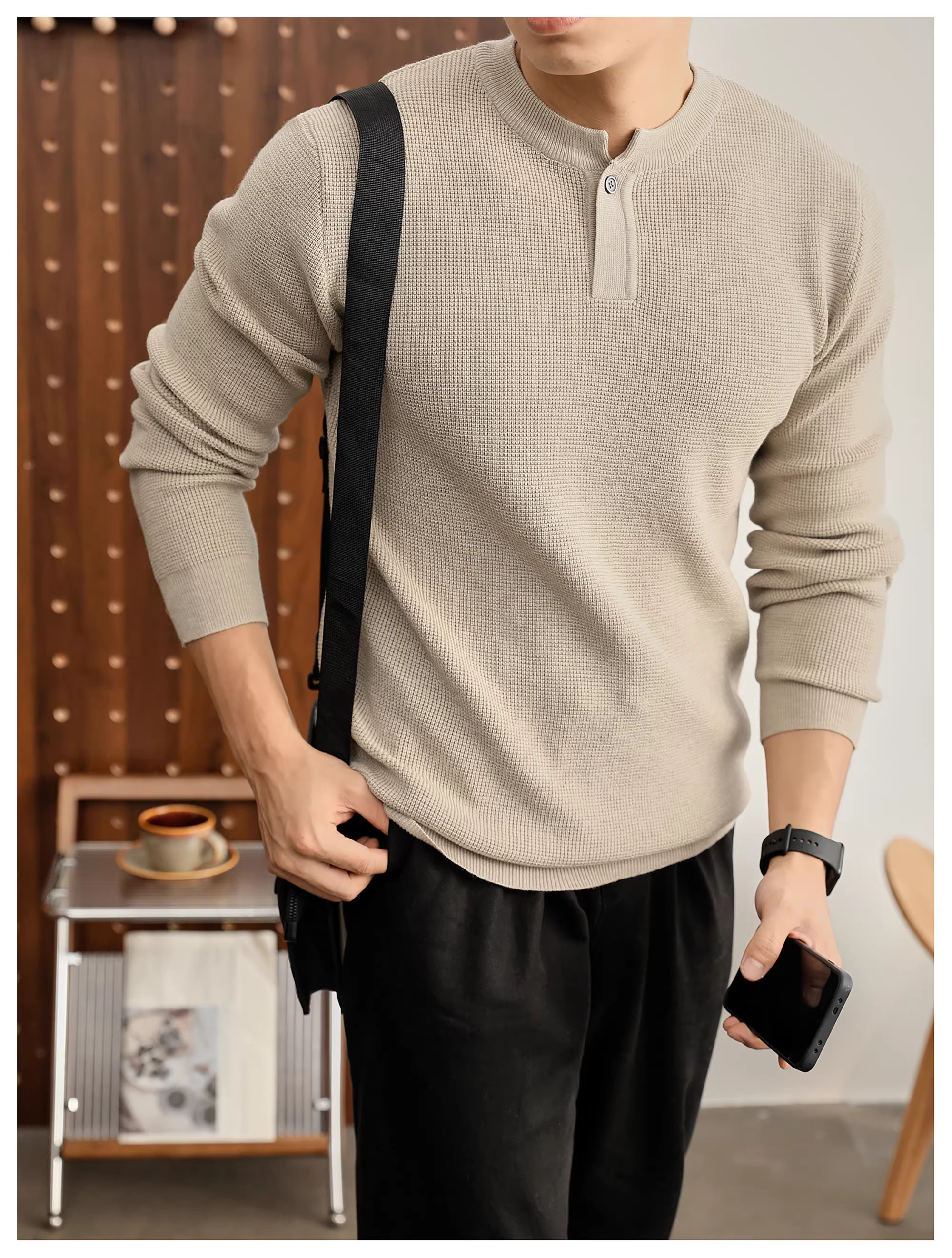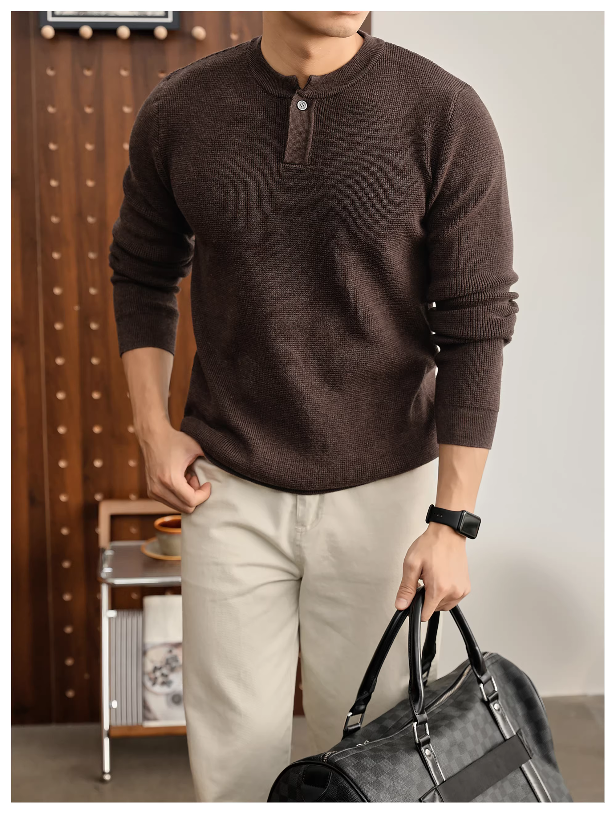 Áo len nam dáng ôm chất liệu len pha, dệt kim, kiểu dáng đơn giản phong cách cổ điển, cổ henley, tay dài, mùa thu đông.