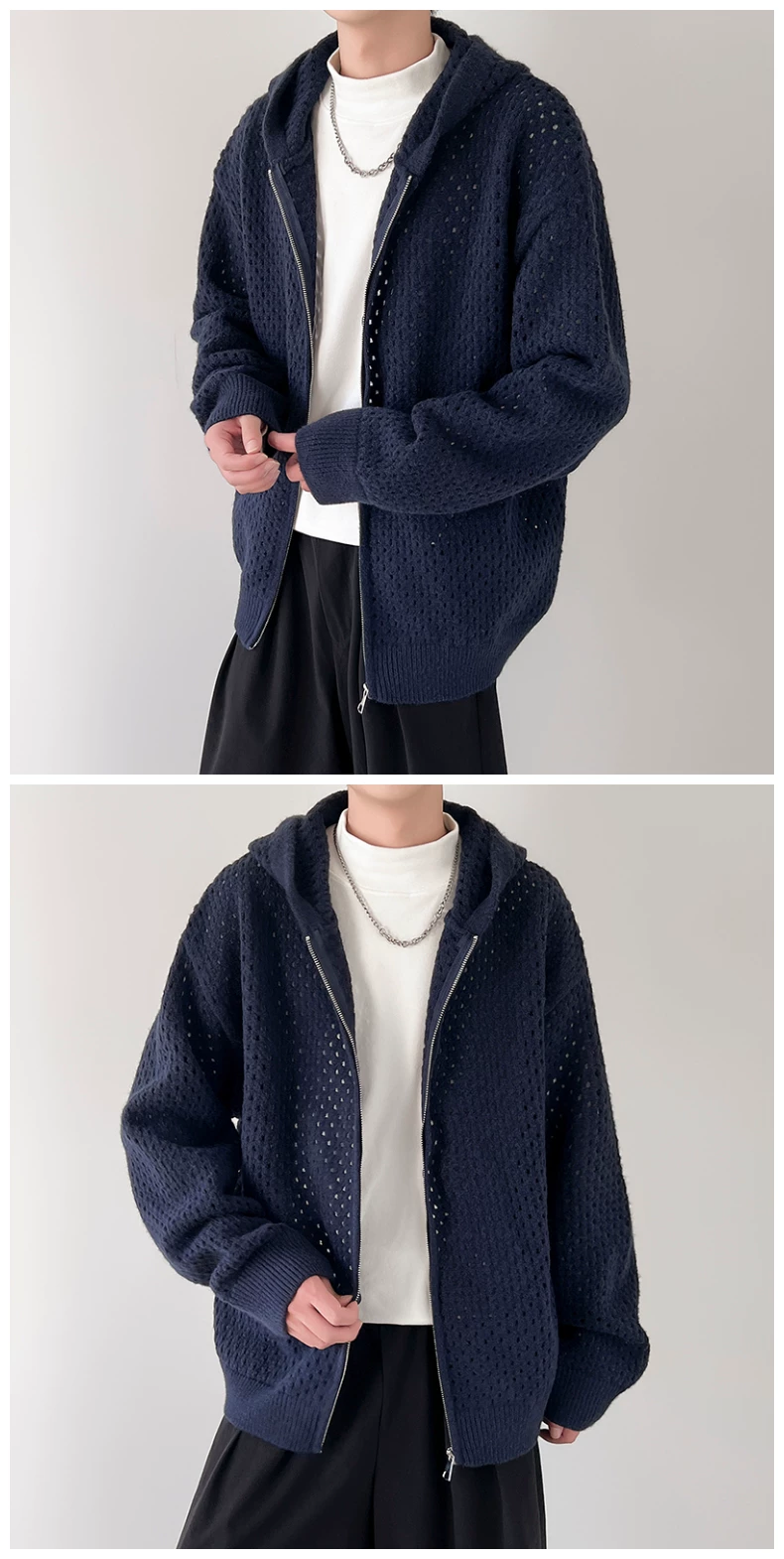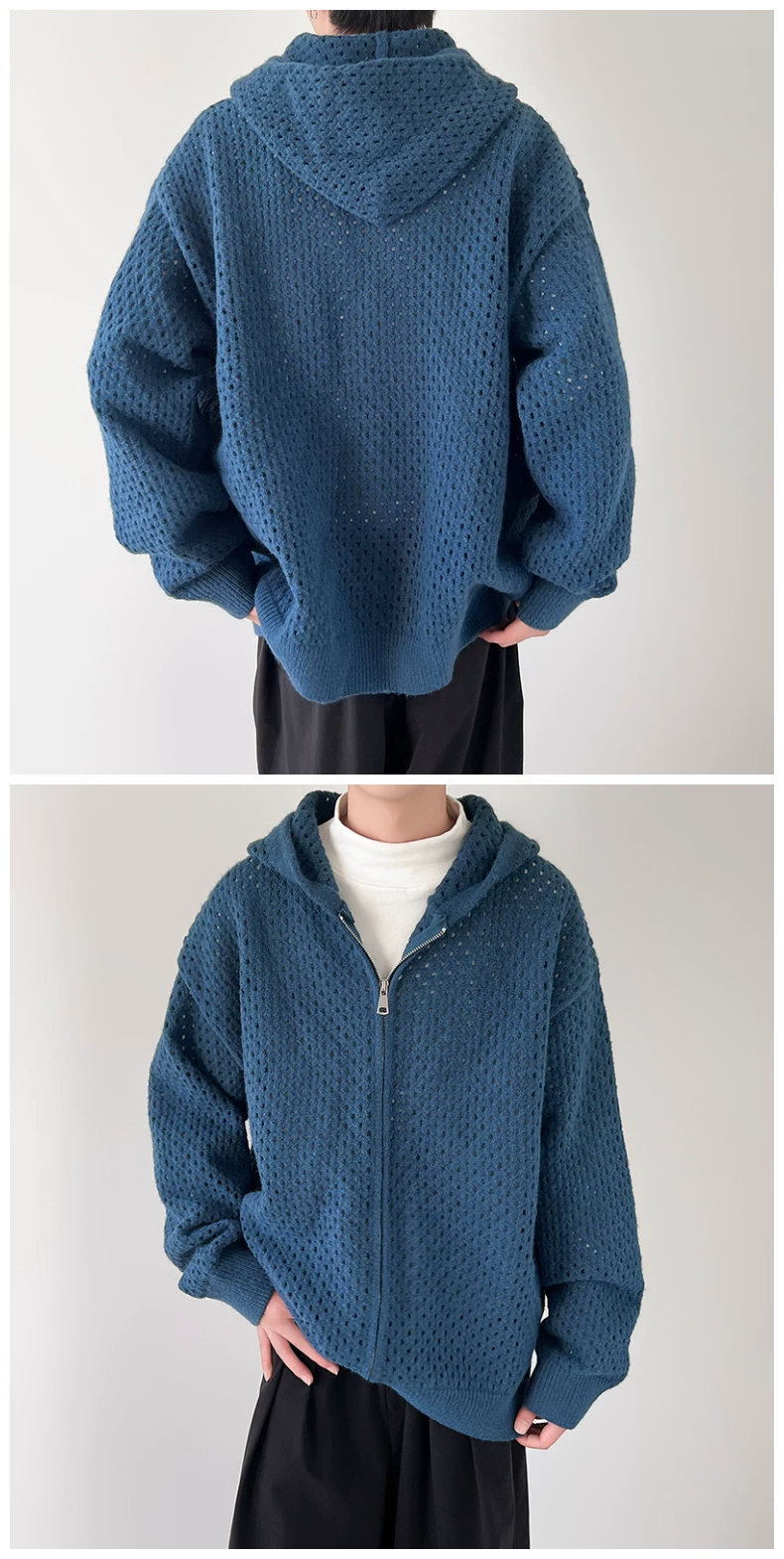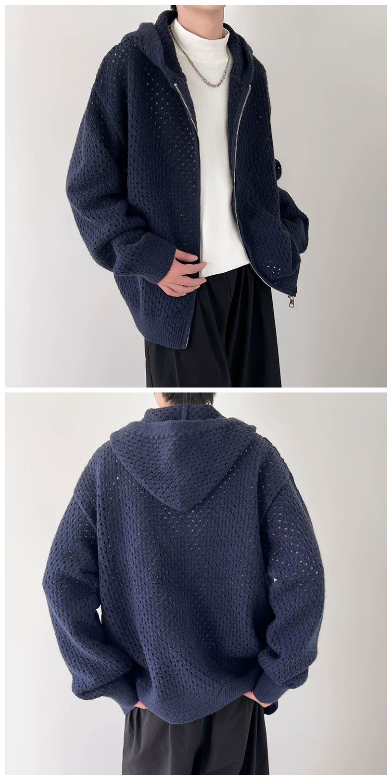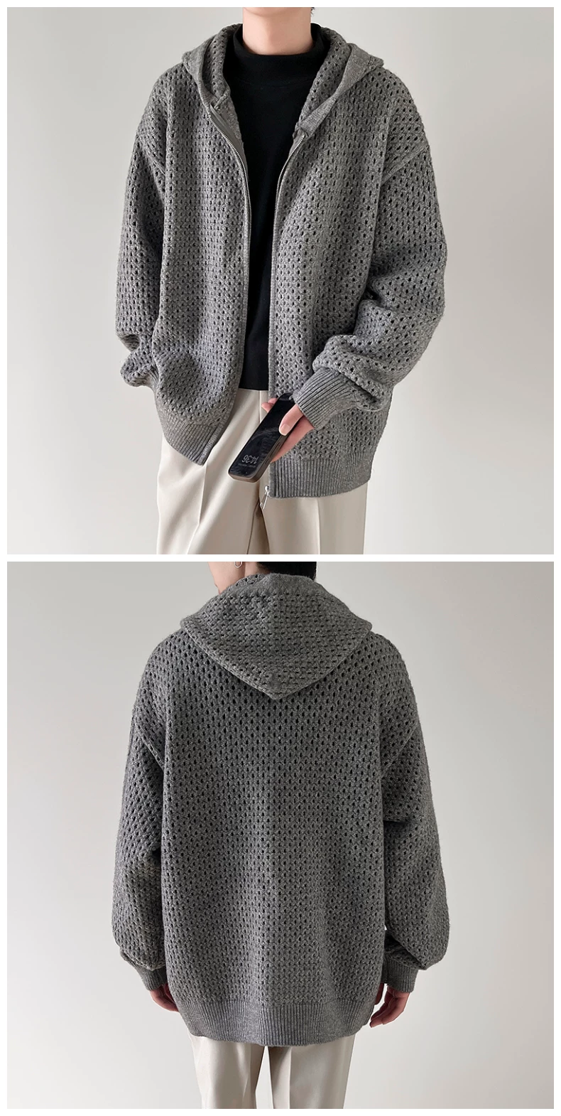 - Áo len thiết kế khoét lỗ dành cho nam, áo cardigan có mũ rộng rãi, phong cách Mỹ thời thượng mùa xuân thu, kiểu dáng thoải mái dành cho cặp đôi.