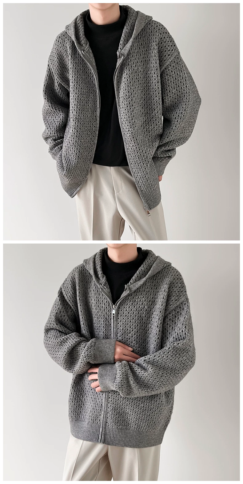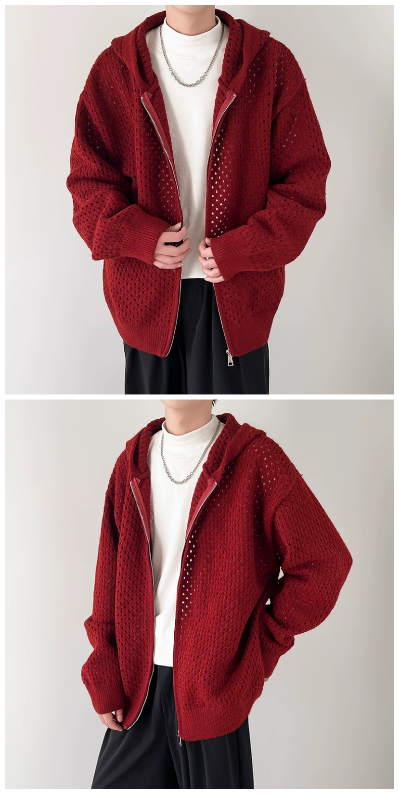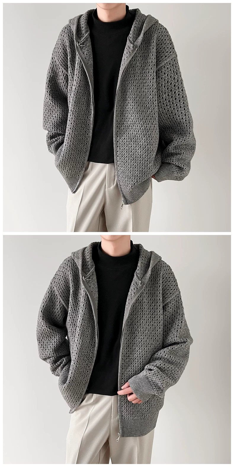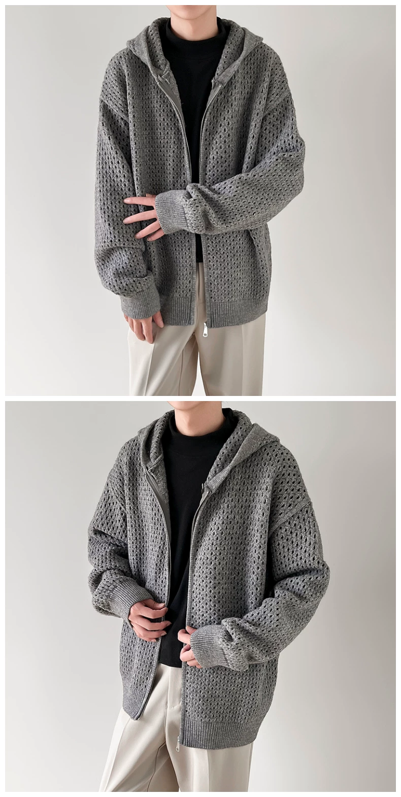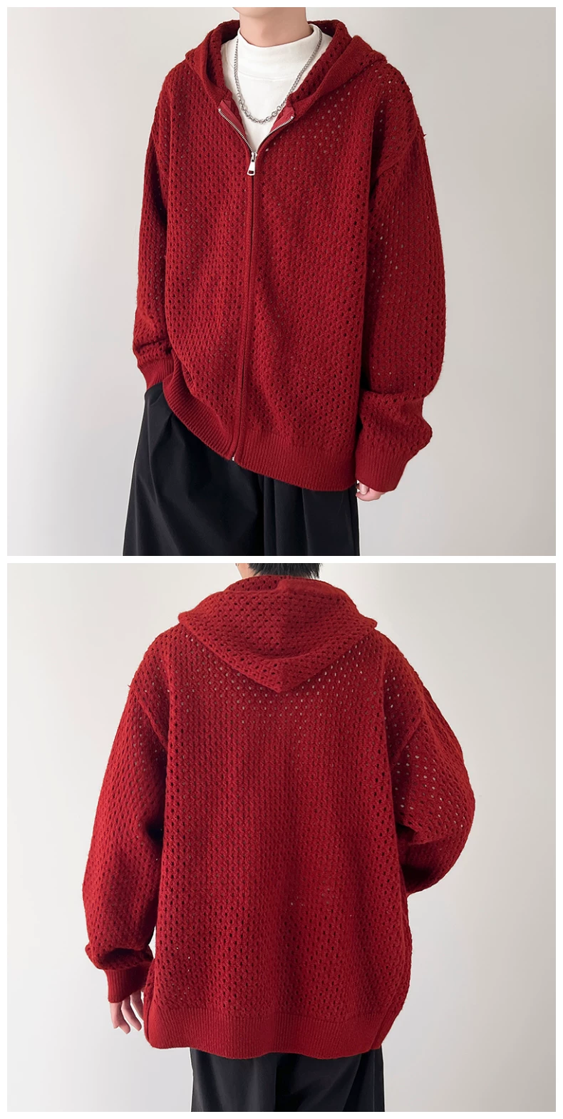 - Áo len thiết kế khoét lỗ dành cho nam, áo cardigan có mũ rộng rãi, phong cách Mỹ thời thượng mùa xuân thu, kiểu dáng thoải mái dành cho cặp đôi.
