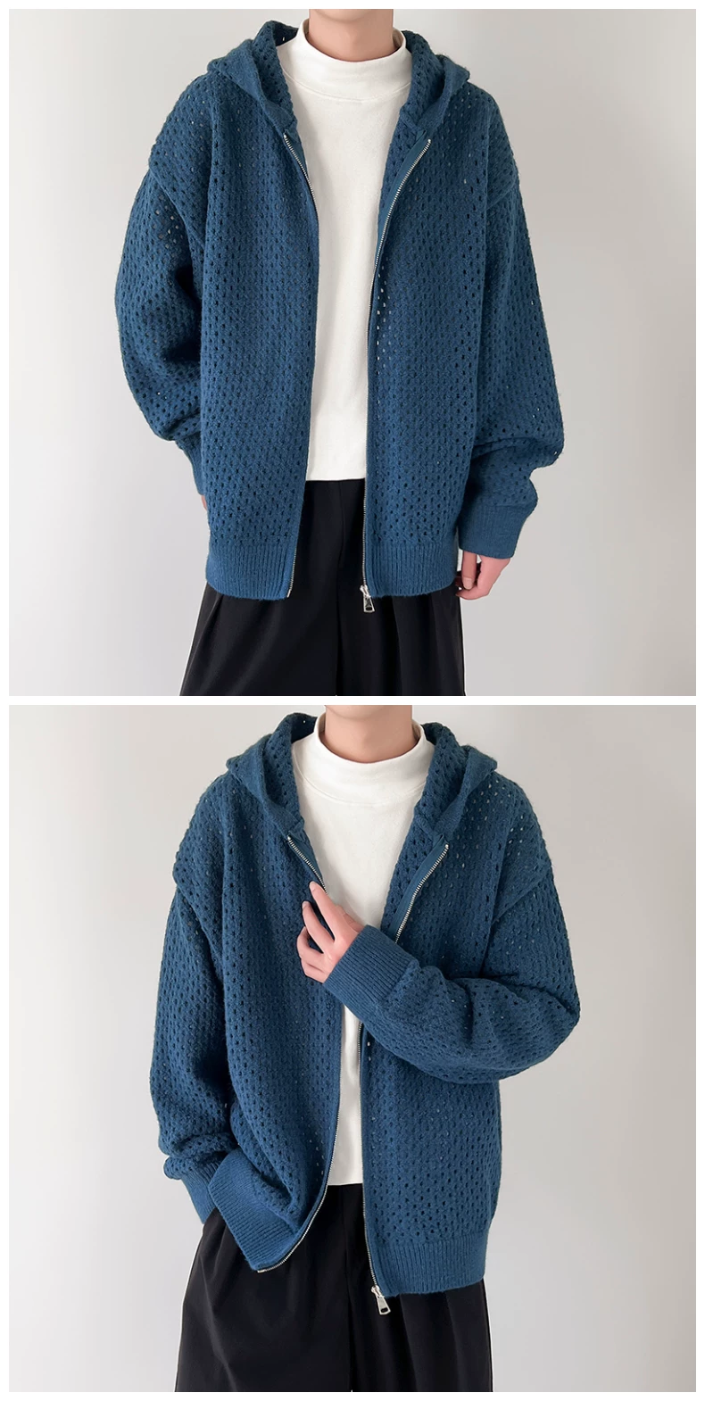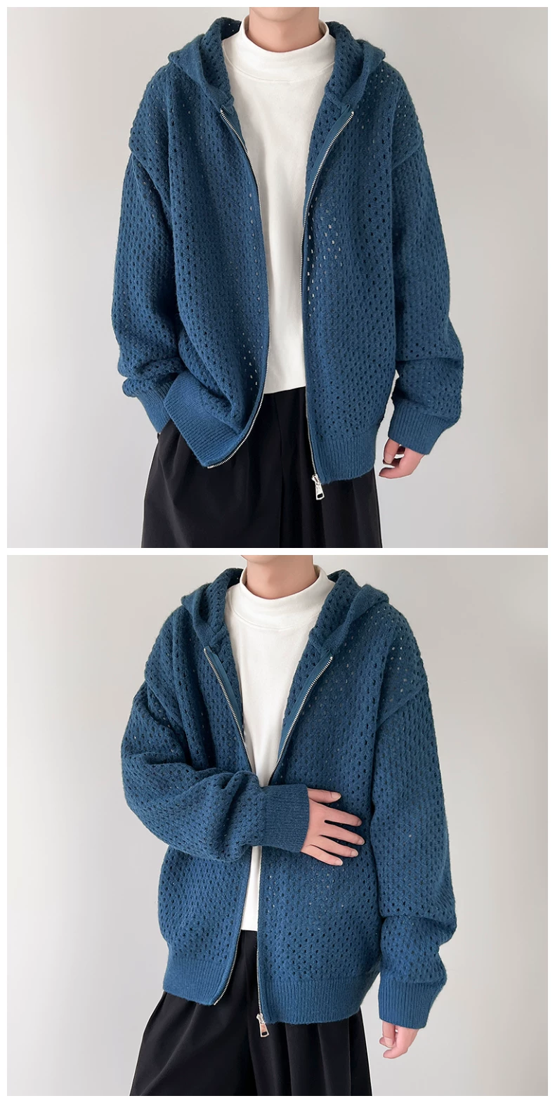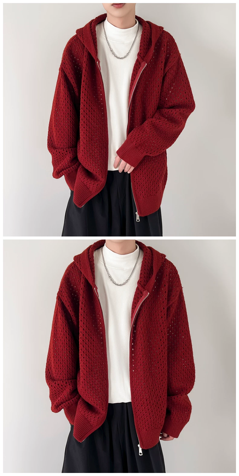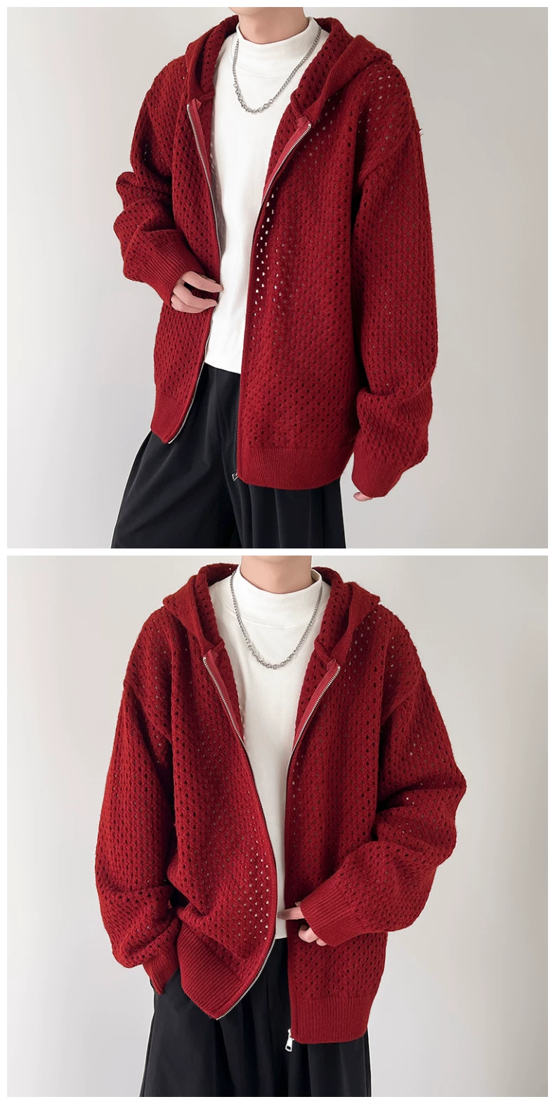- Áo len thiết kế khoét lỗ dành cho nam, áo cardigan có mũ rộng rãi, phong cách Mỹ thời thượng mùa xuân thu, kiểu dáng thoải mái dành cho cặp đôi.