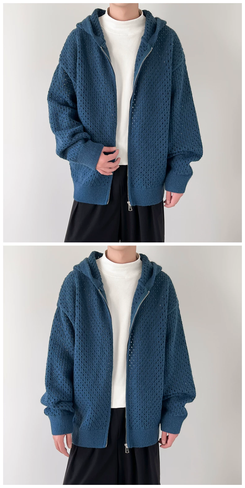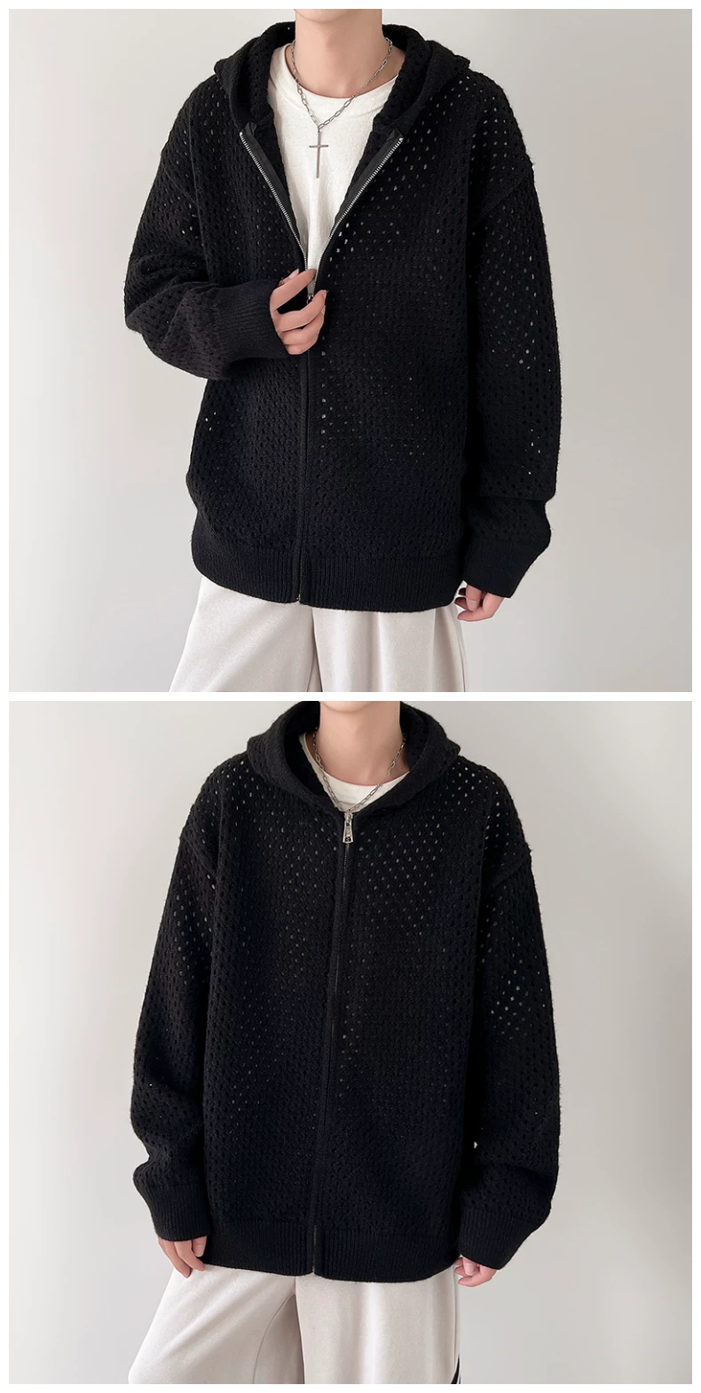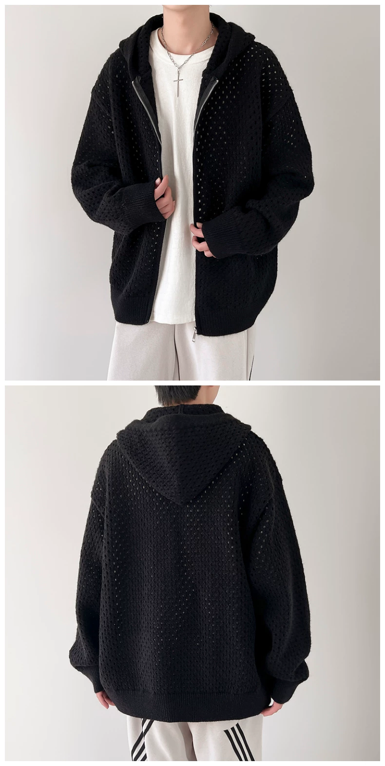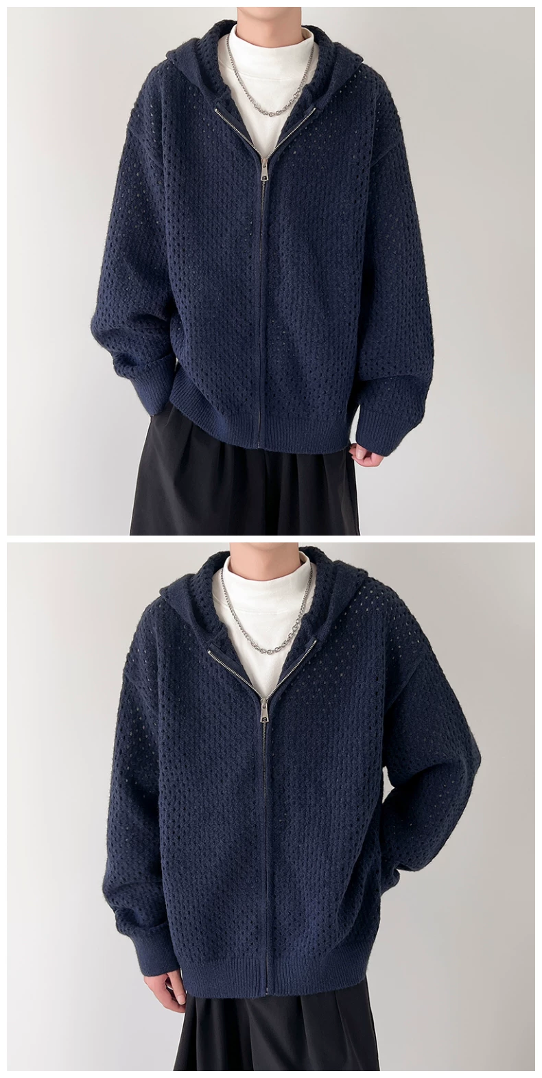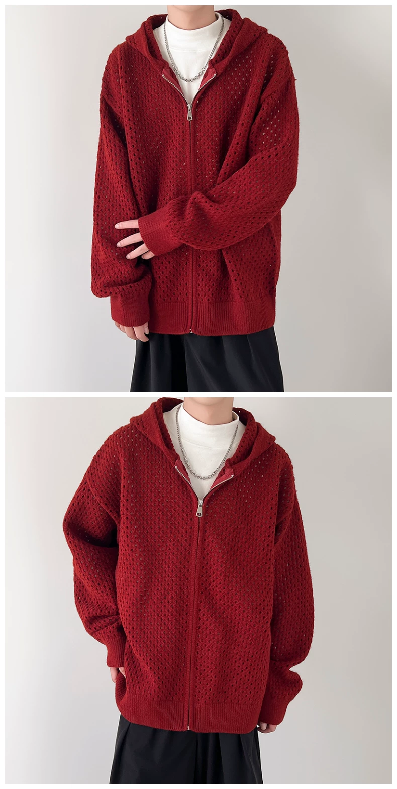 - Áo len thiết kế khoét lỗ dành cho nam, áo cardigan có mũ rộng rãi, phong cách Mỹ thời thượng mùa xuân thu, kiểu dáng thoải mái dành cho cặp đôi.