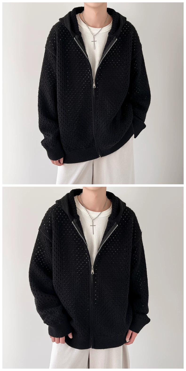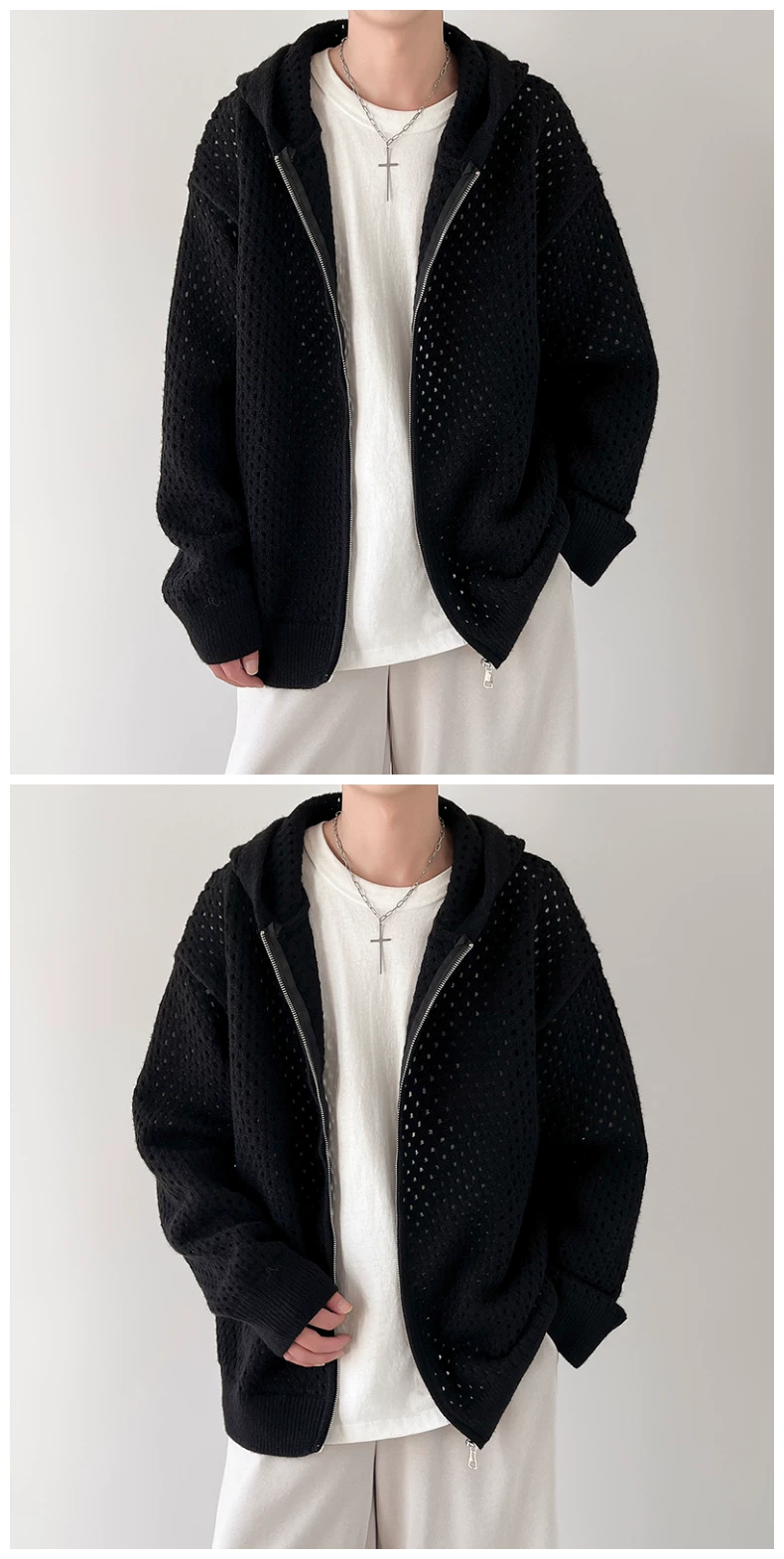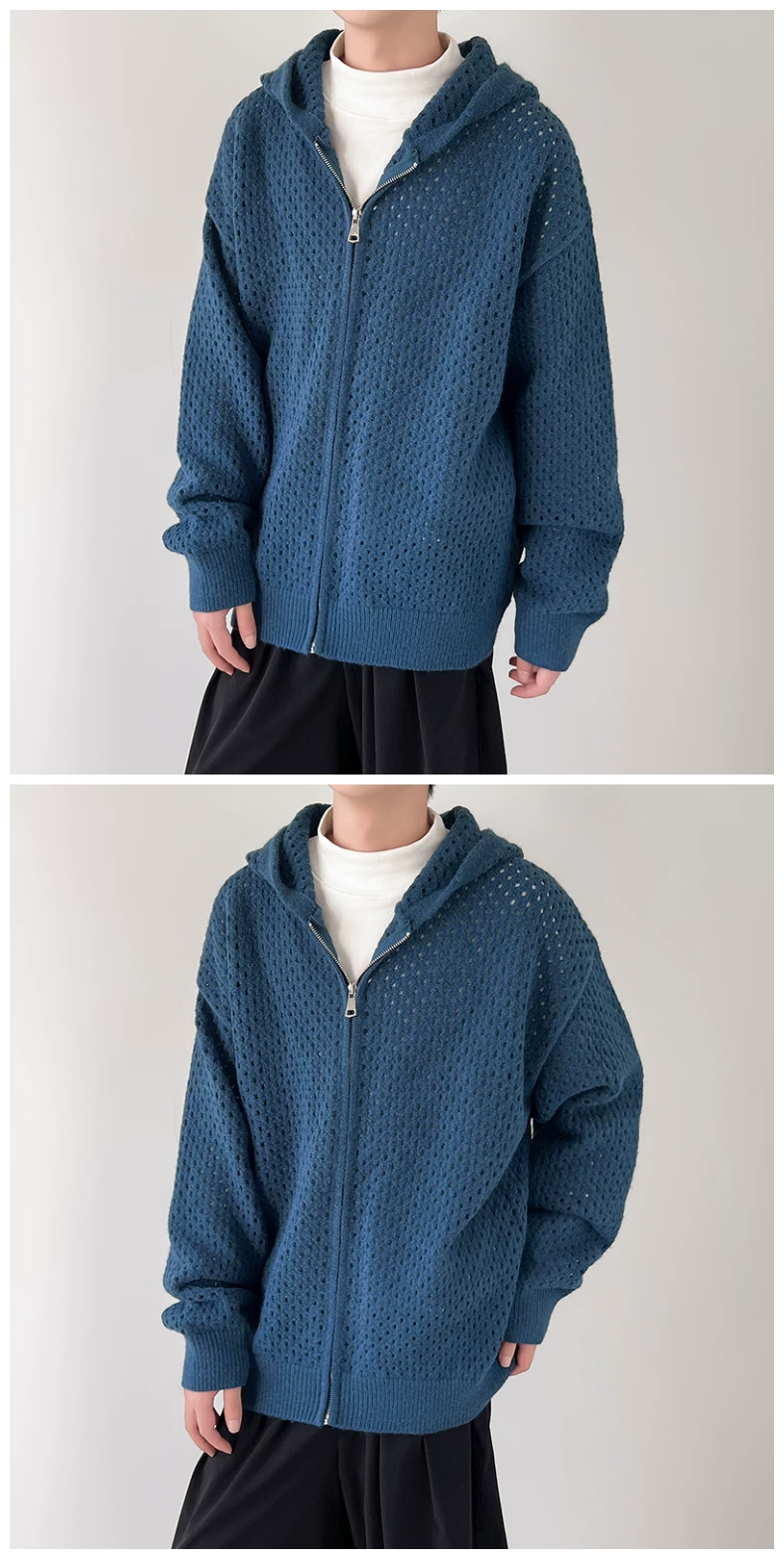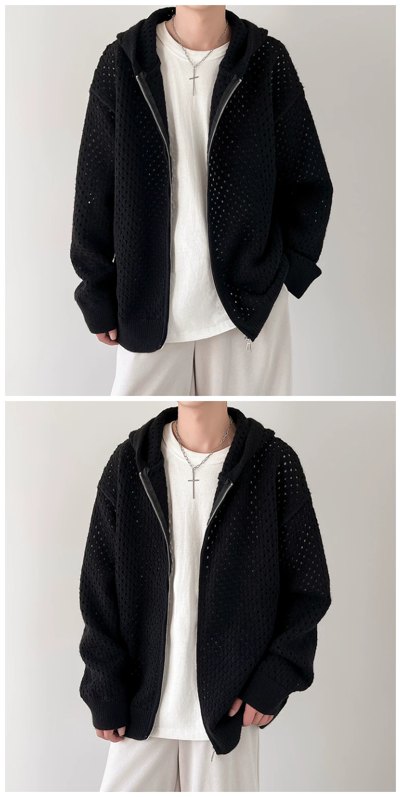 - Áo len thiết kế khoét lỗ dành cho nam, áo cardigan có mũ rộng rãi, phong cách Mỹ thời thượng mùa xuân thu, kiểu dáng thoải mái dành cho cặp đôi.