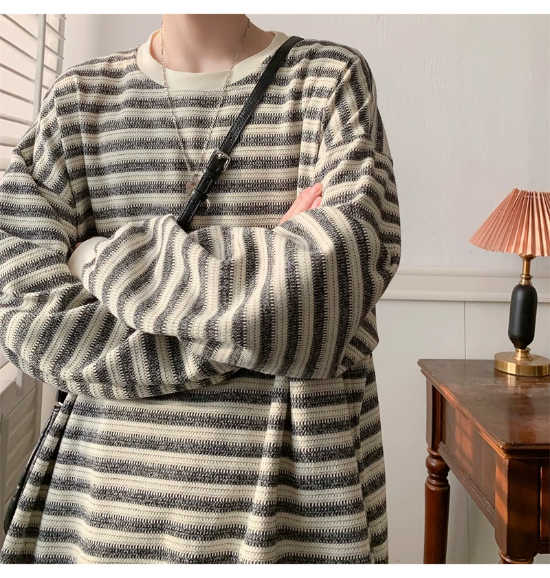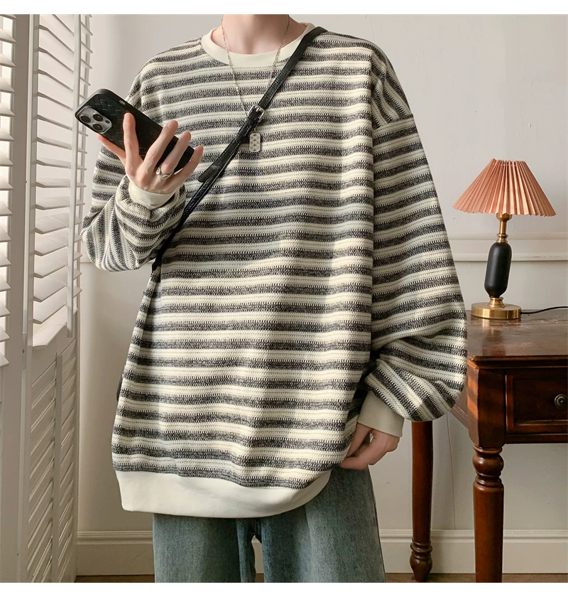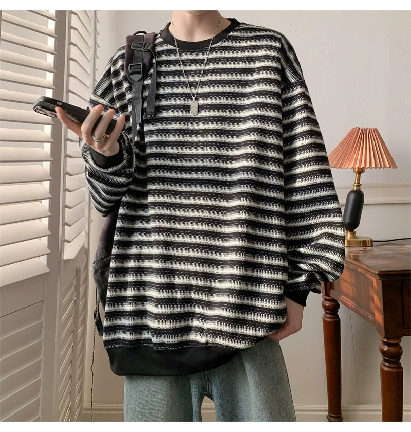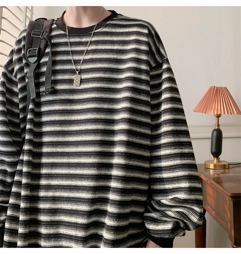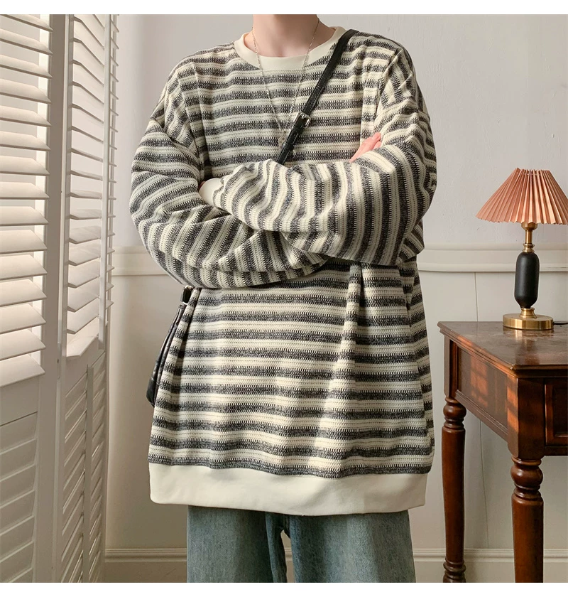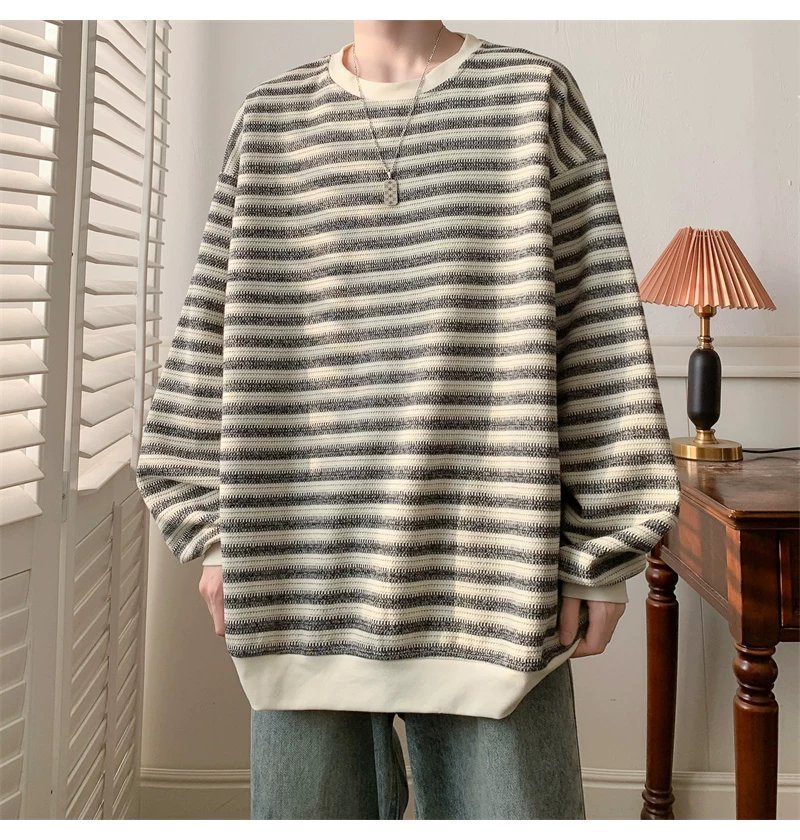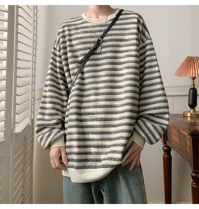 - Áo nỉ cổ tròn kẻ sọc dày dặn dành cho nam, áo thun cơ bản kiểu Mỹ mùa thu, áo thun dài tay dáng rộng hợp thời trang dành cho cặp đôi.