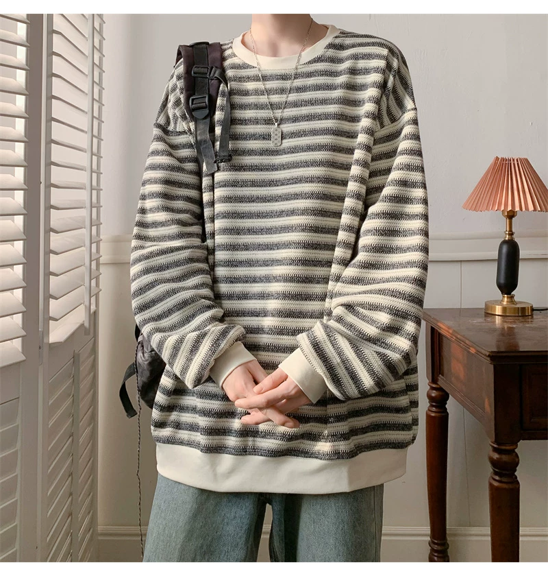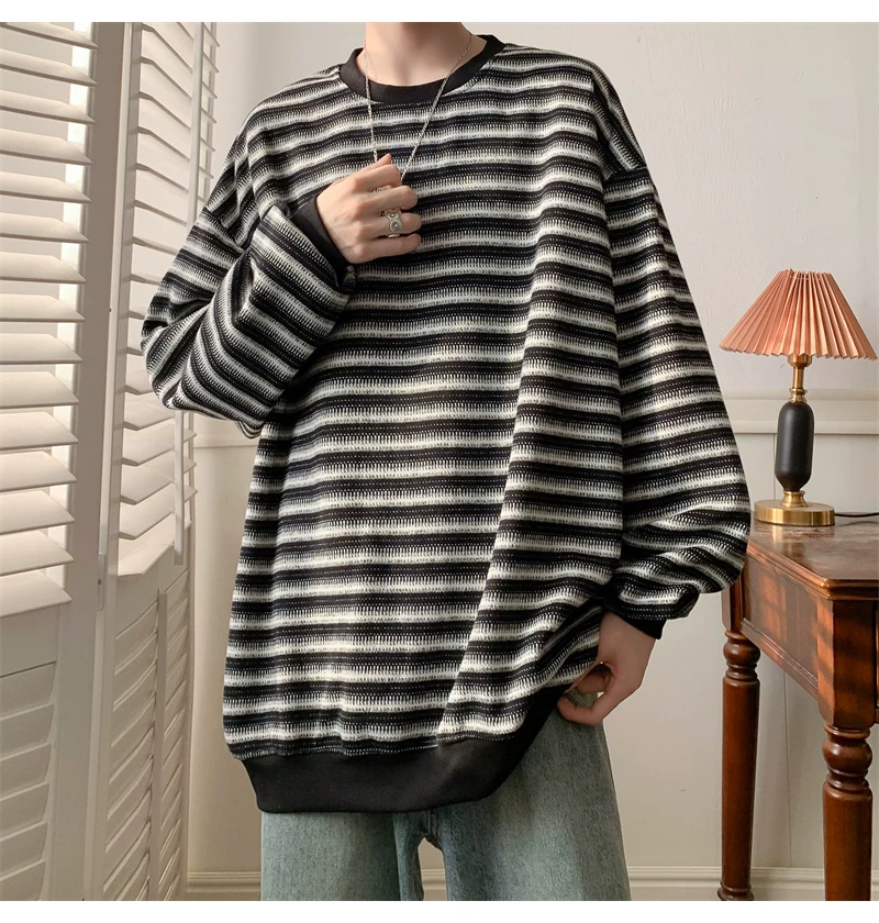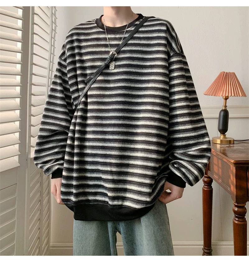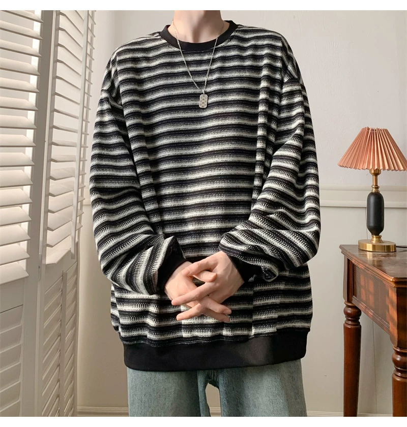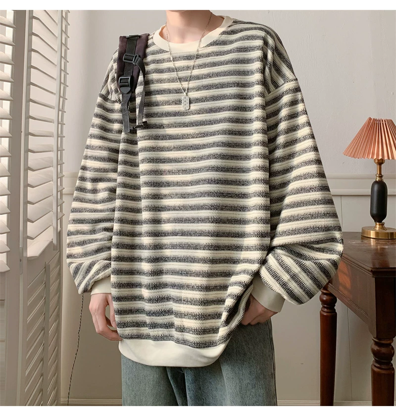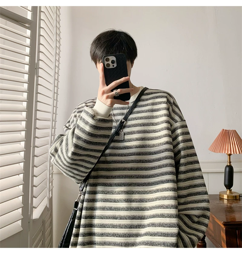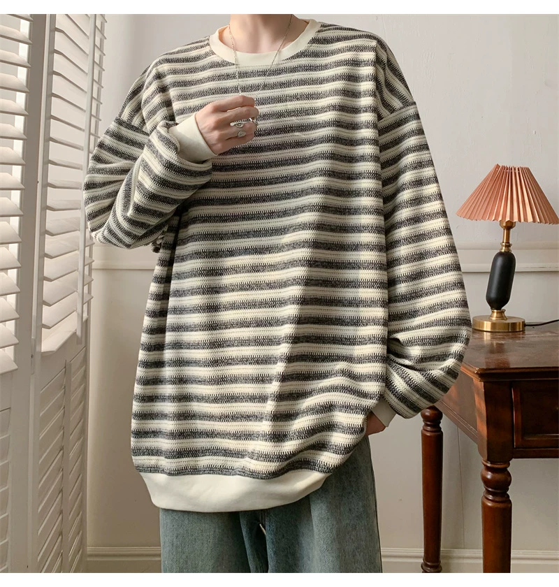 - Áo nỉ cổ tròn kẻ sọc dày dặn dành cho nam, áo thun cơ bản kiểu Mỹ mùa thu, áo thun dài tay dáng rộng hợp thời trang dành cho cặp đôi.
