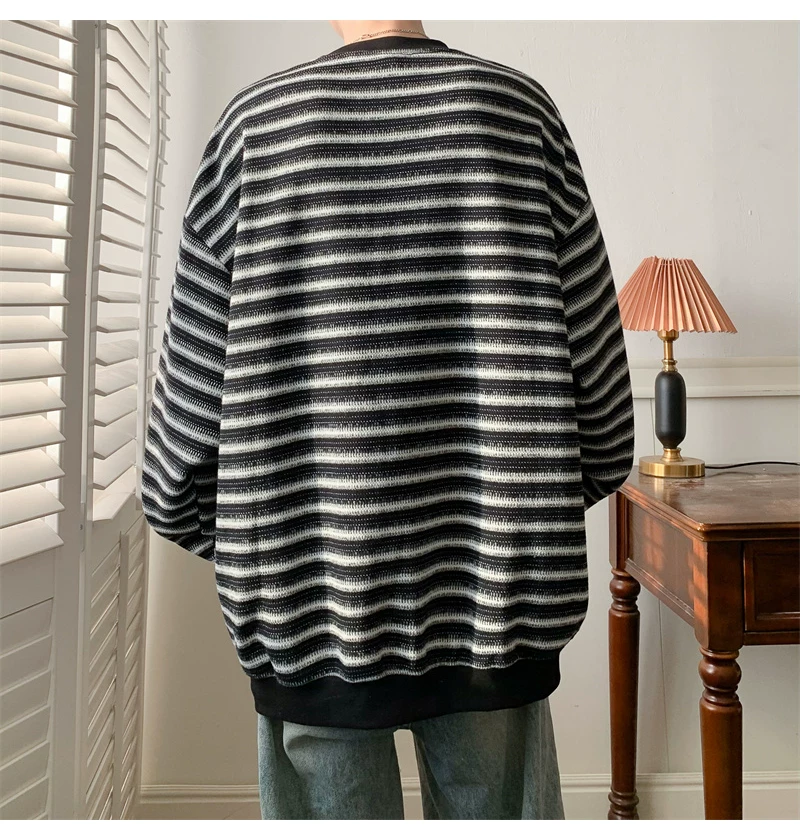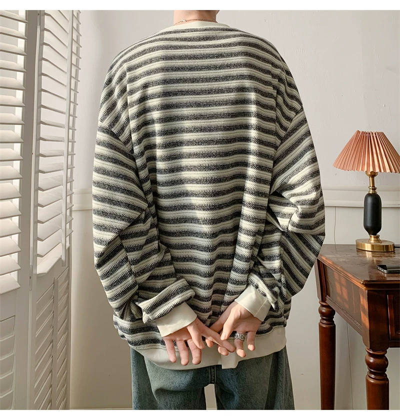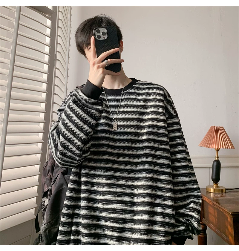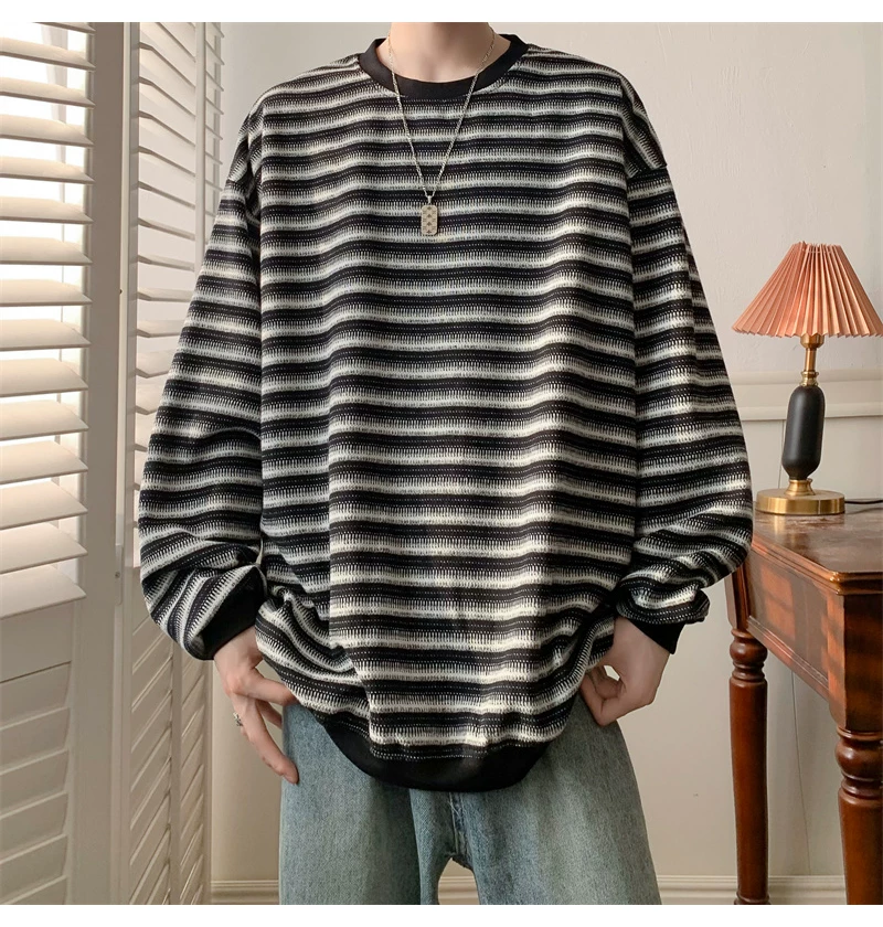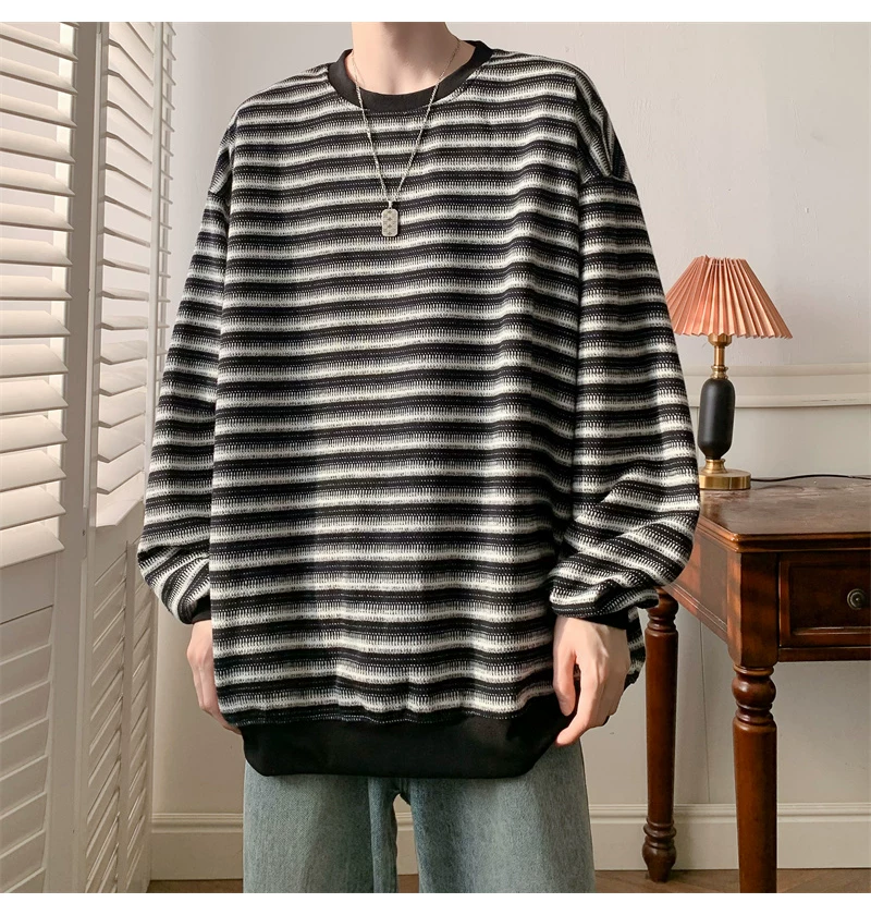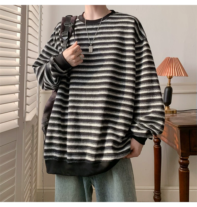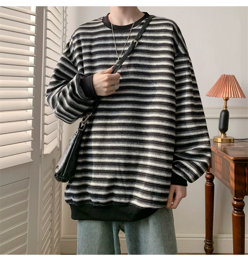- Áo nỉ cổ tròn kẻ sọc dày dặn dành cho nam, áo thun cơ bản kiểu Mỹ mùa thu, áo thun dài tay dáng rộng hợp thời trang dành cho cặp đôi.