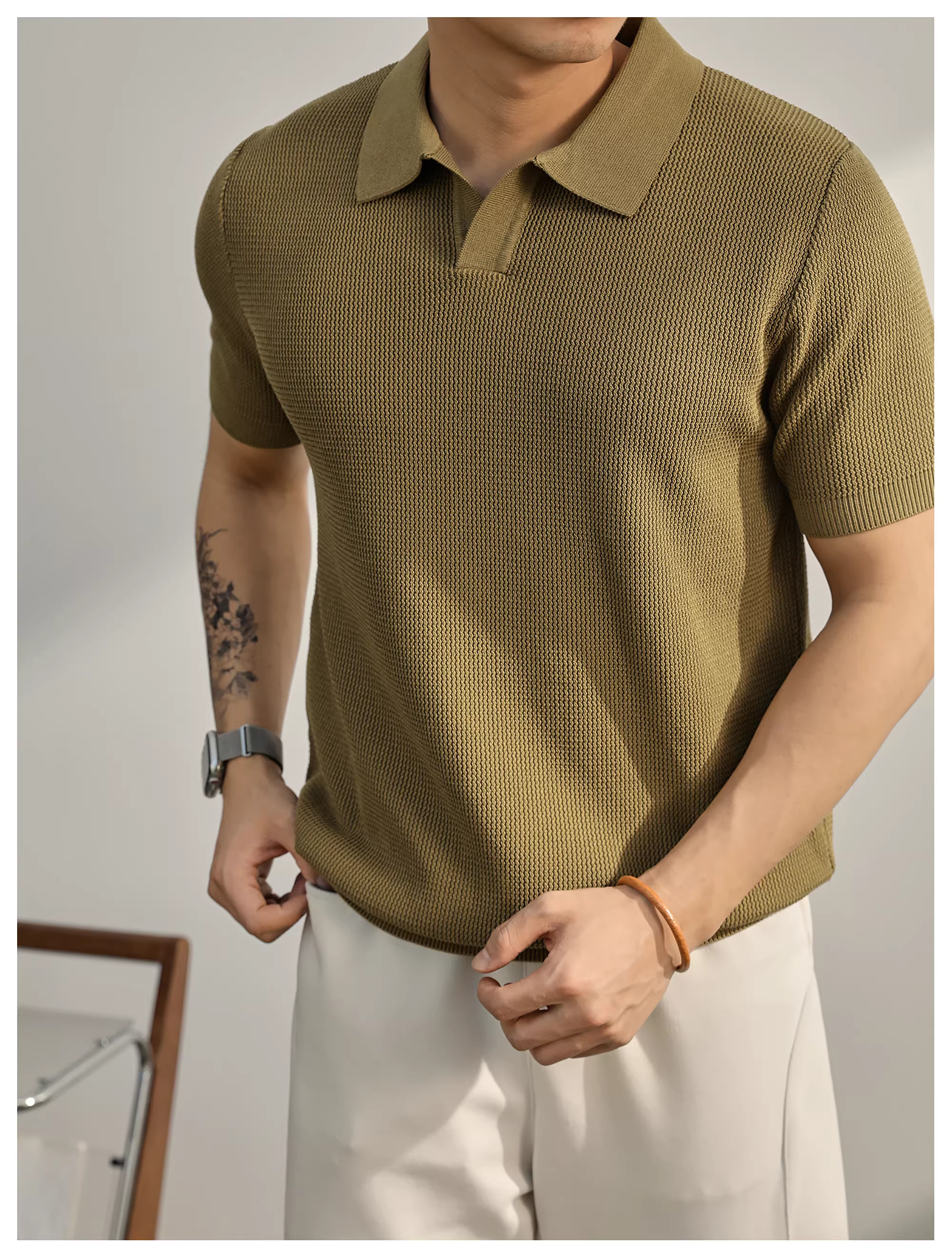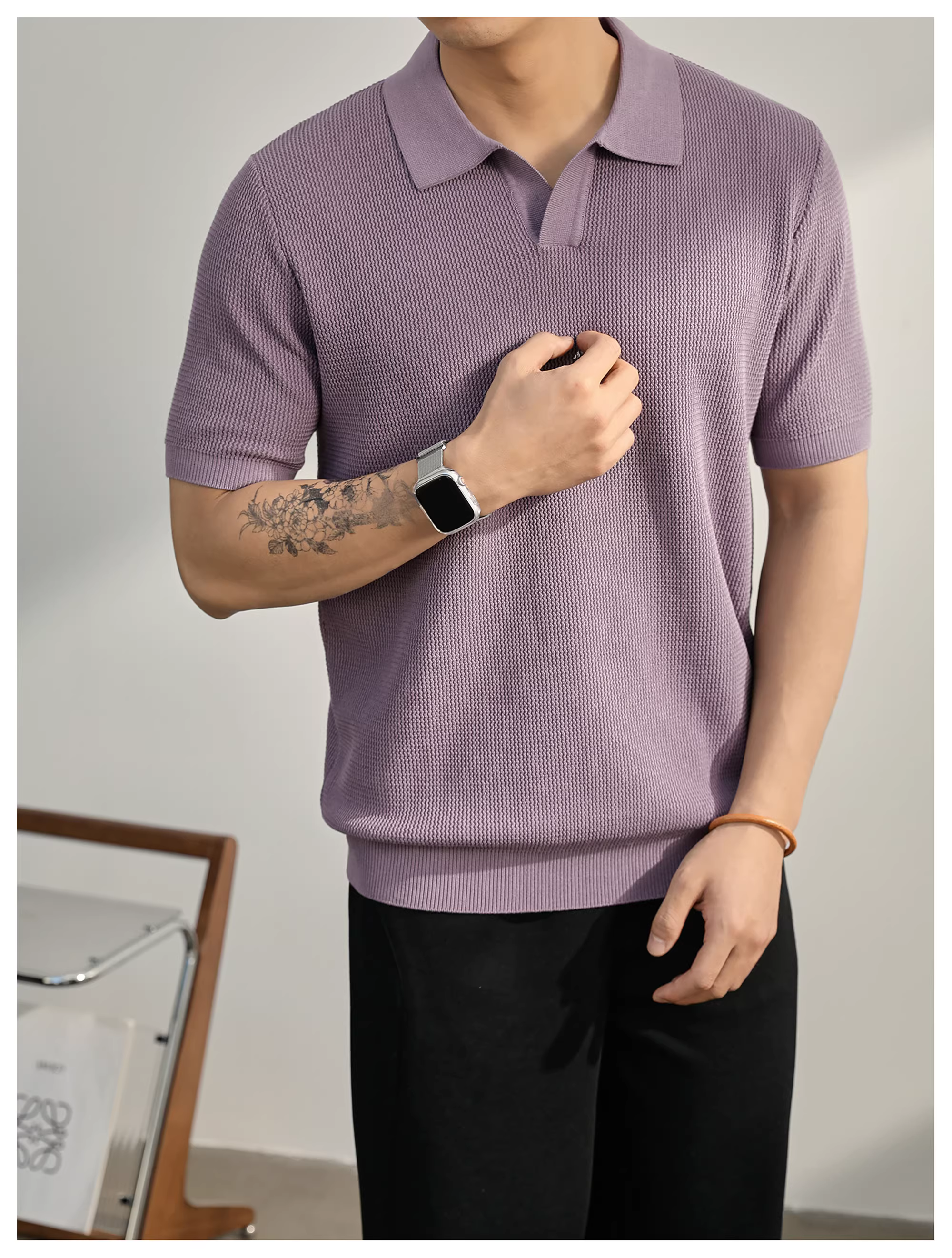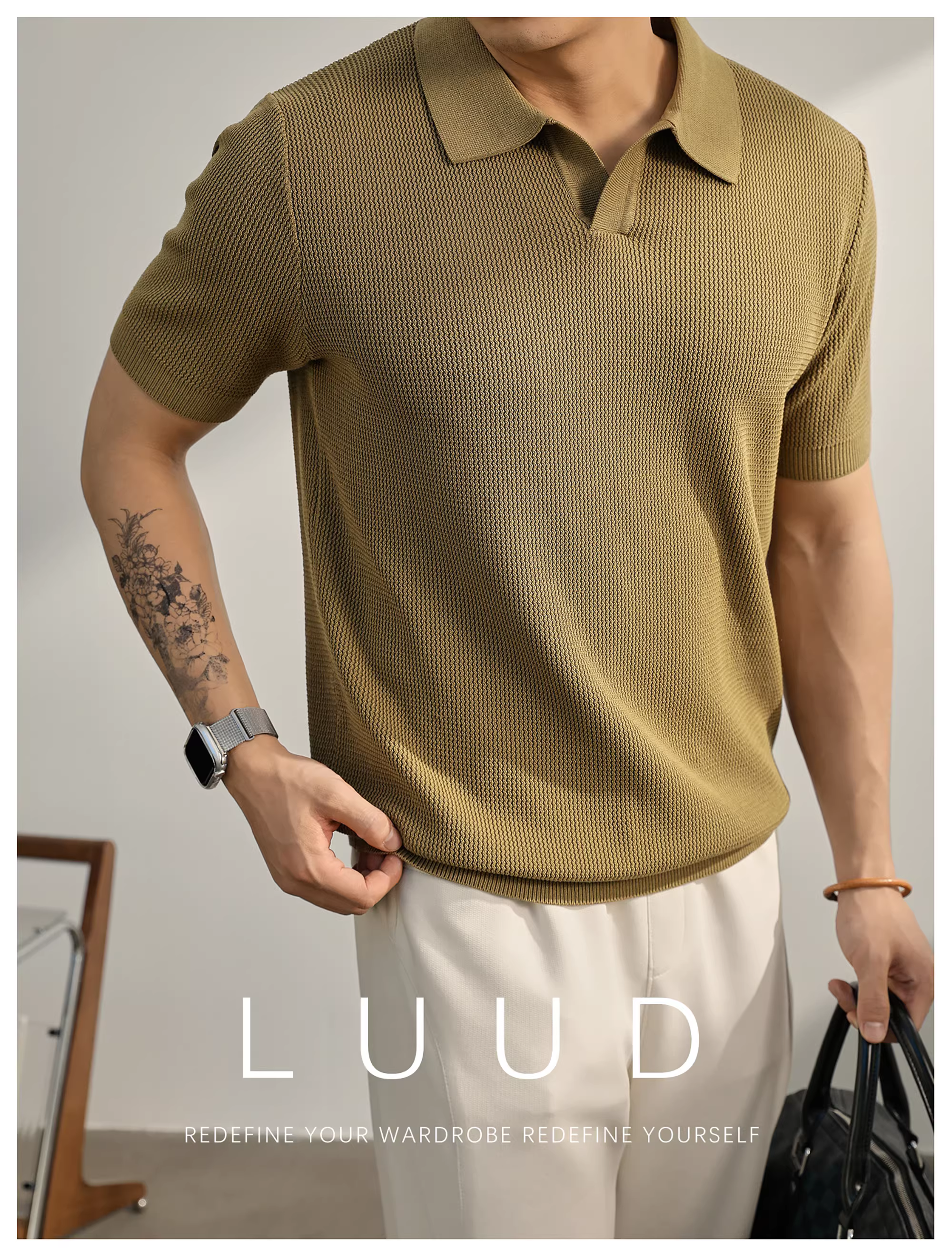Áo polo cổ chữ V nhỏ, chất liệu thoáng mát LUUD dành cho nam, áo thun dệt kim jacquard mùa hè, mang lại cảm giác cao cấp và cổ áo có thể gấp xuống.