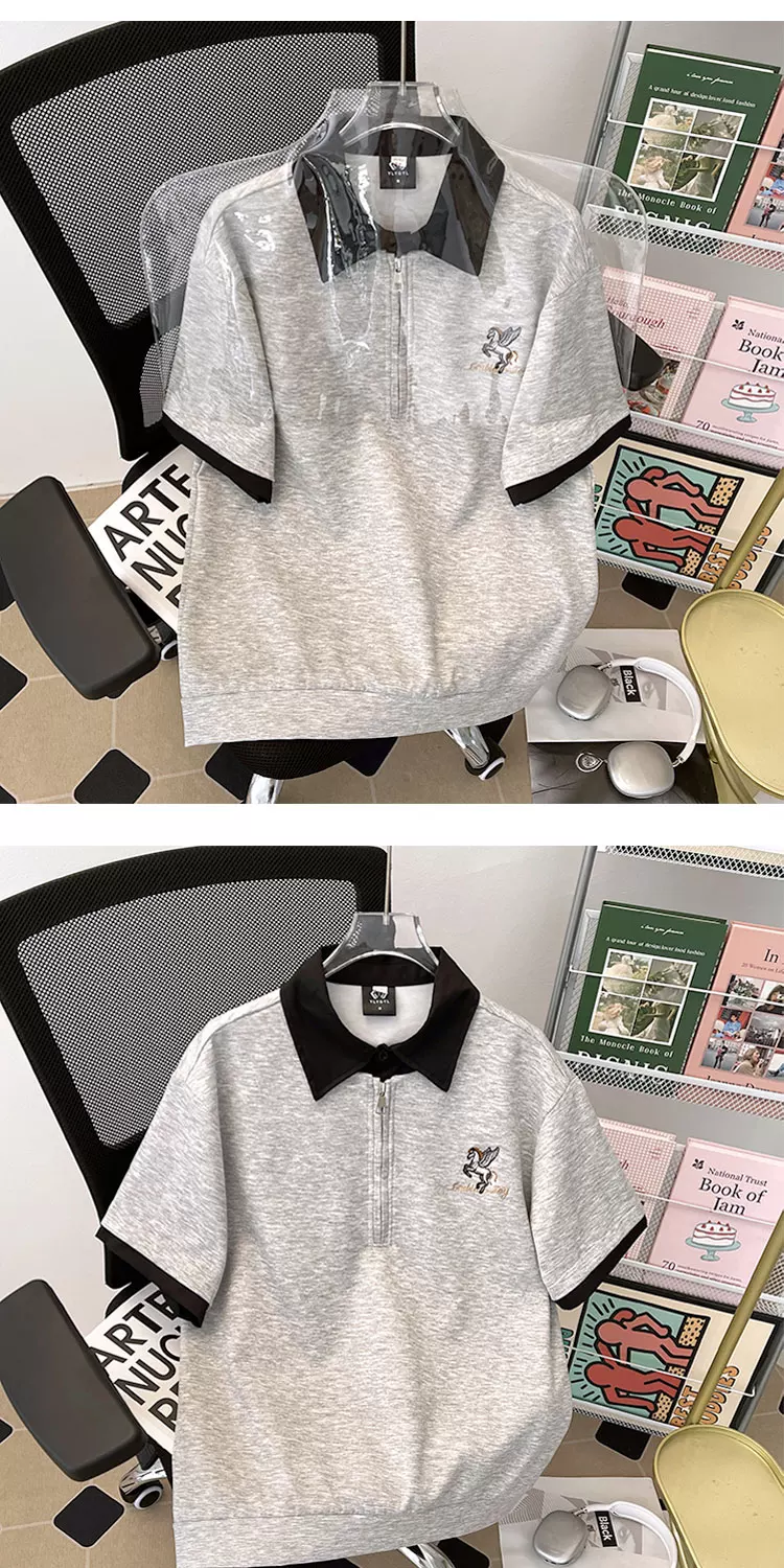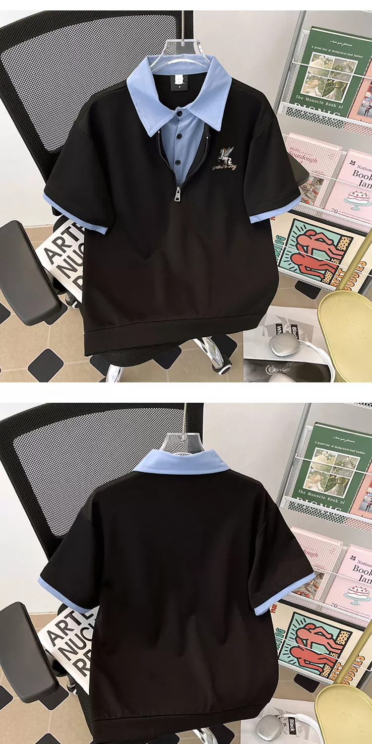- Áo Polo giả hai mảnh kiểu Mỹ dành cho nam, áo thêu nửa khóa kéo mùa hè, áo thun cặp đôi dáng rộng thời trang