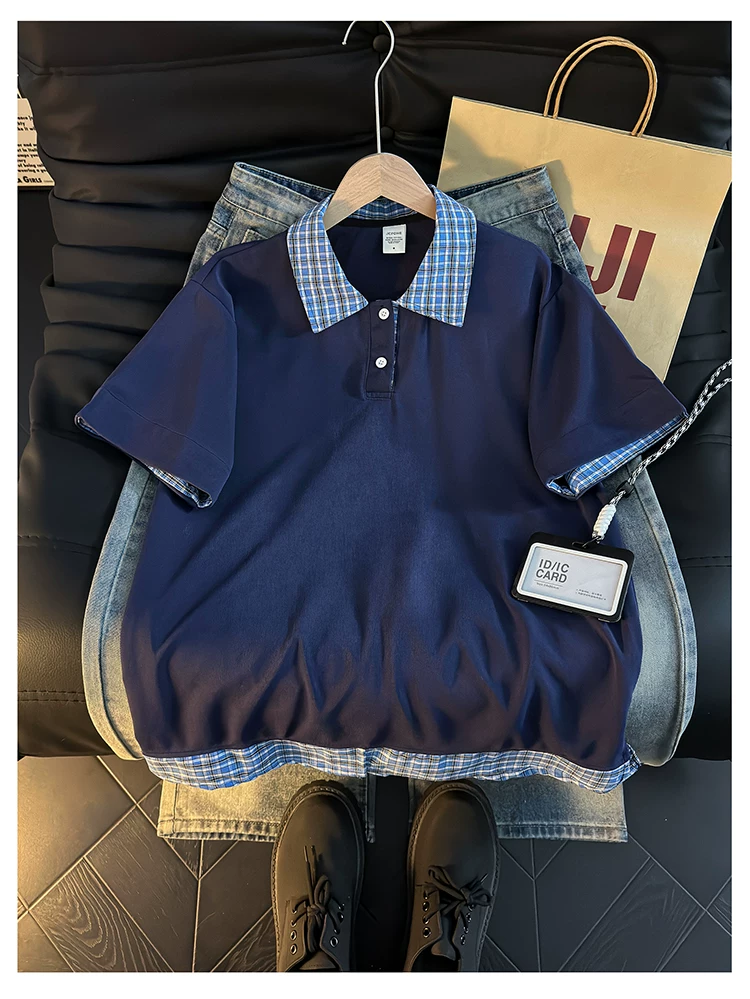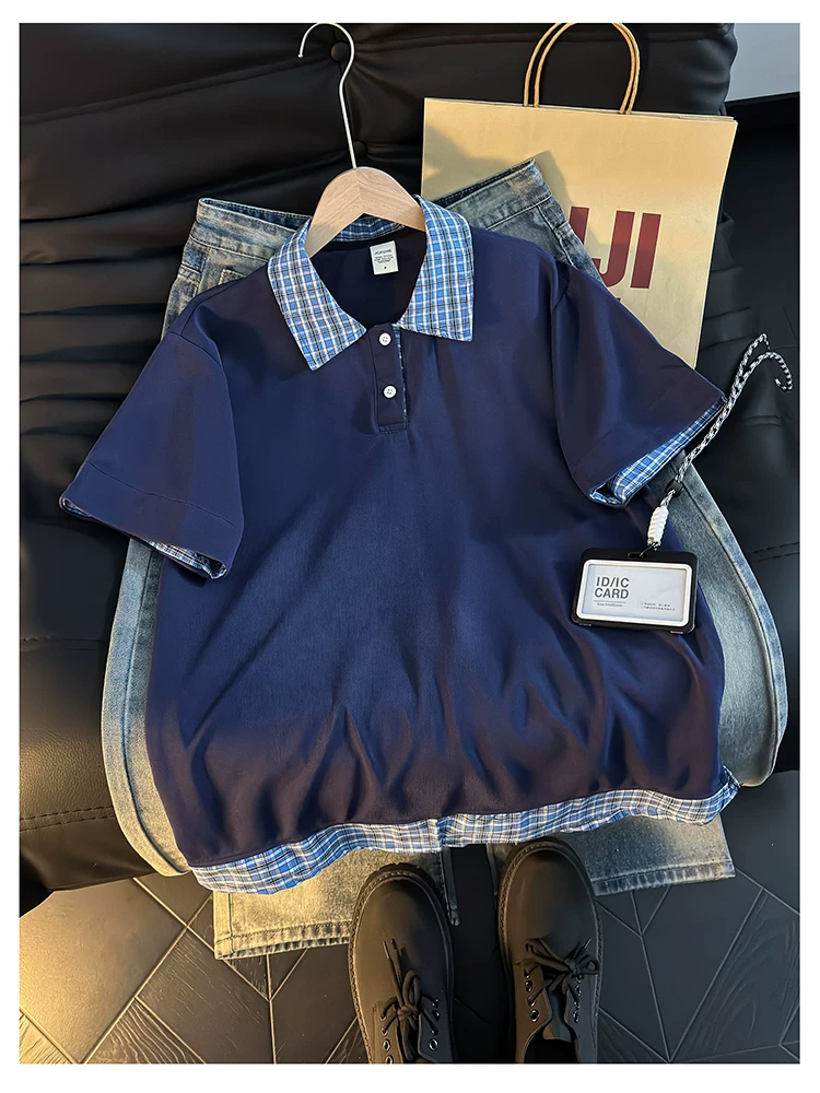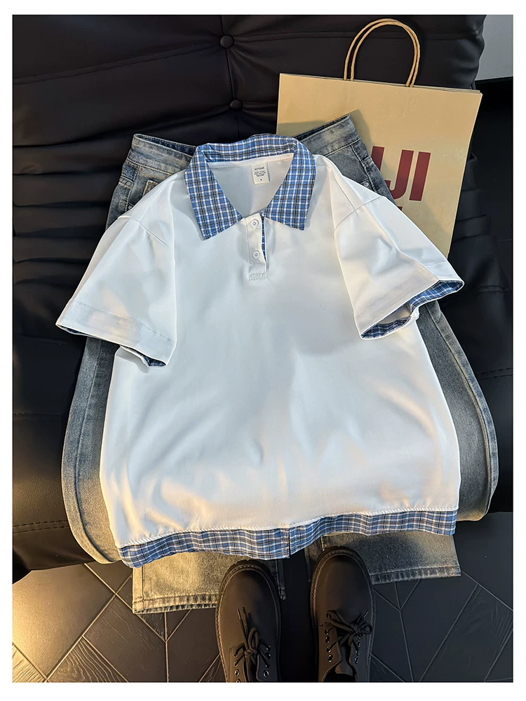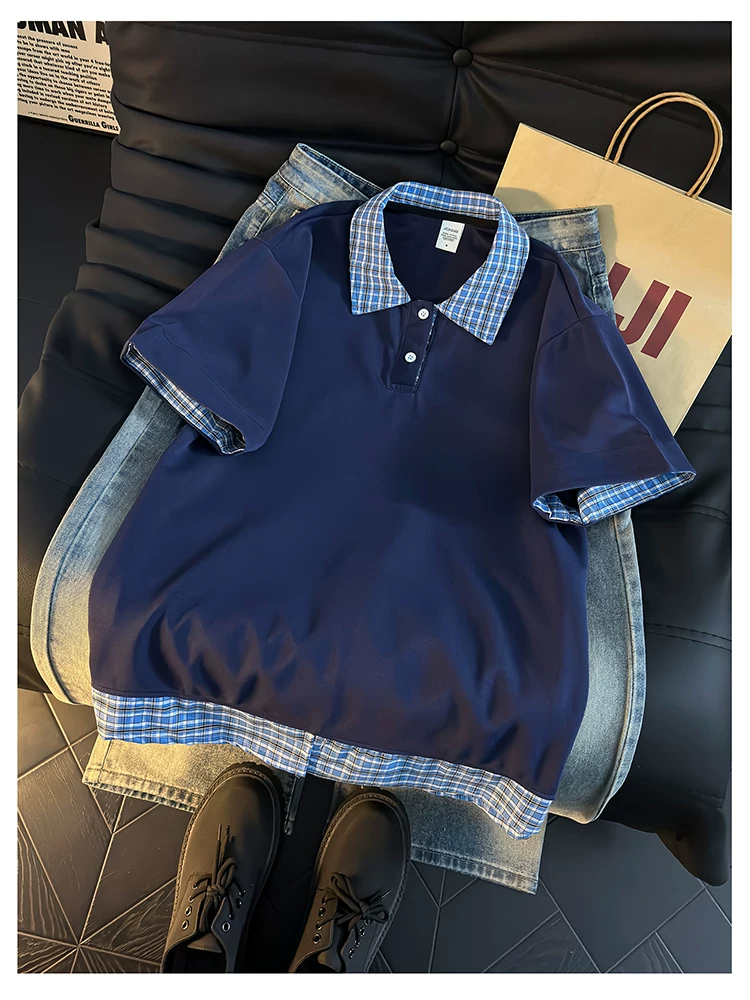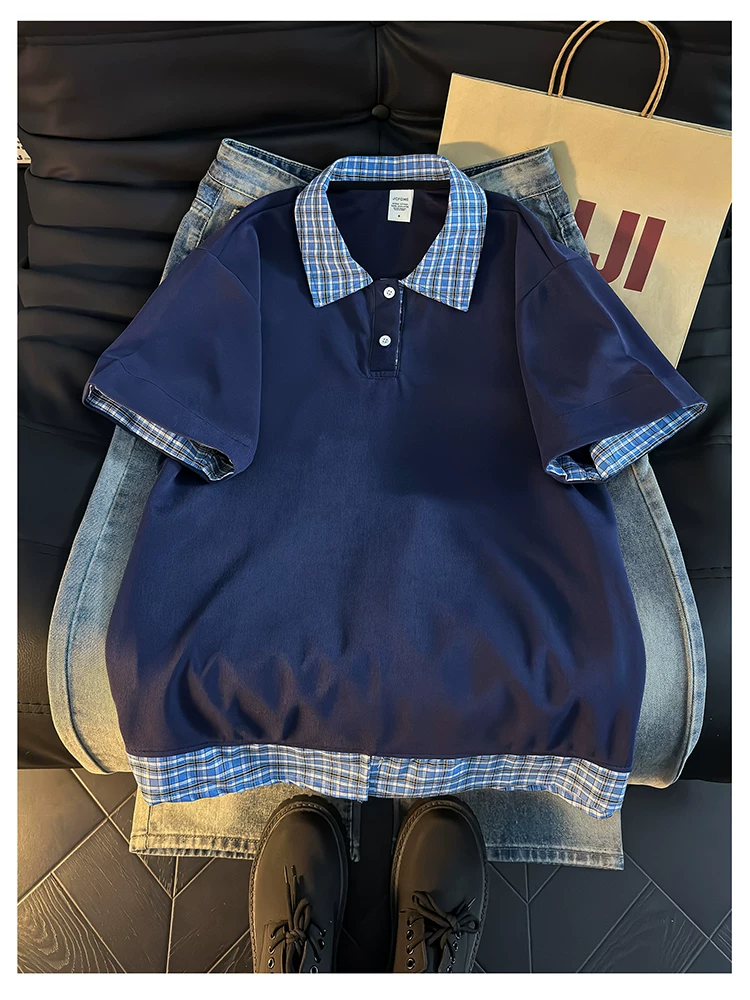 - Áo Polo giả hai mảnh kiểu Mỹ dành cho nam, áo thun nửa tay kẻ sọc mùa hè, áo thun cặp đôi dáng rộng hợp thời trang.