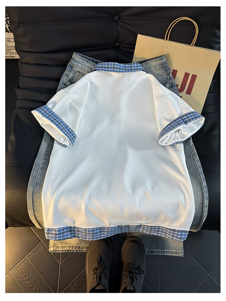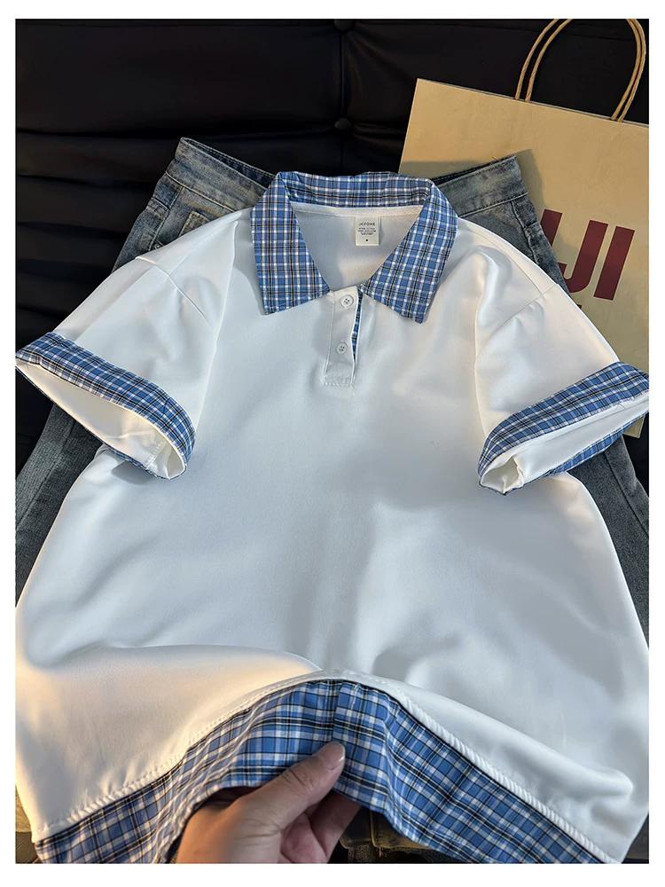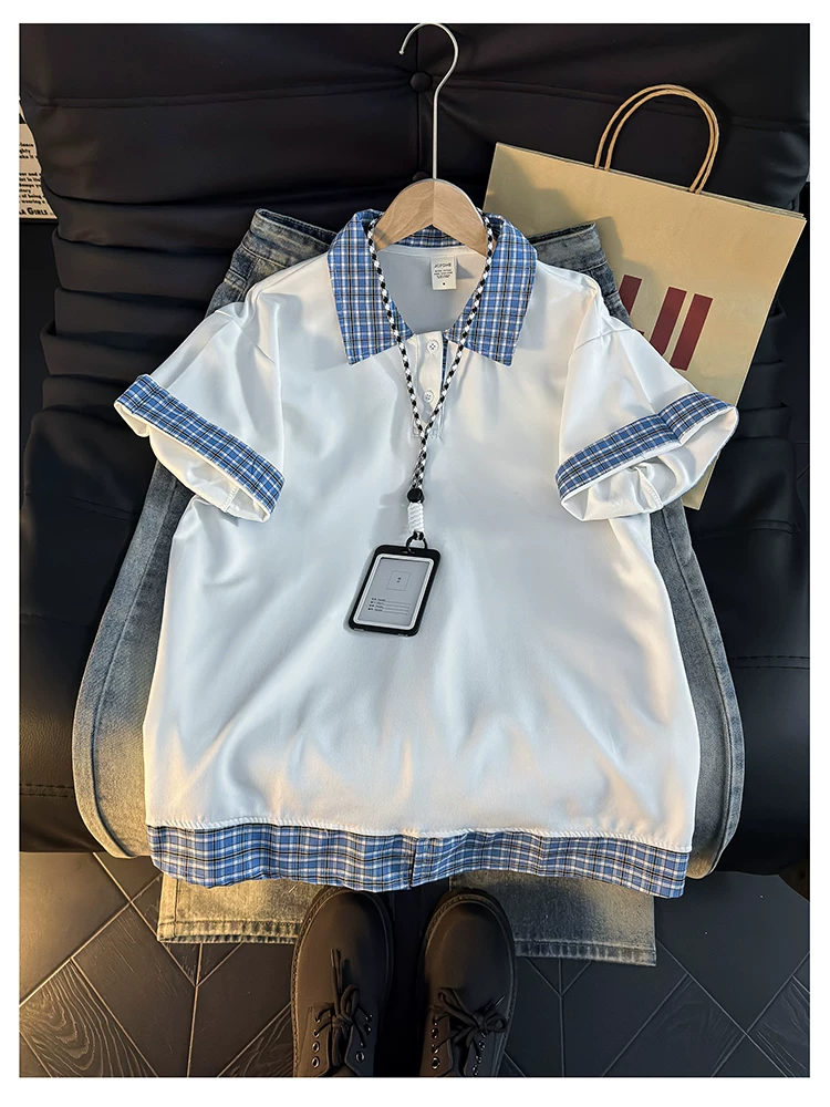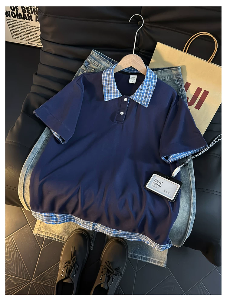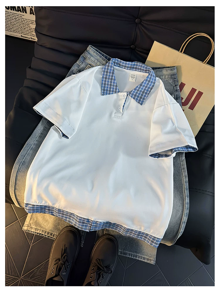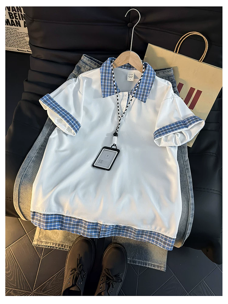 - Áo Polo giả hai mảnh kiểu Mỹ dành cho nam, áo thun nửa tay kẻ sọc mùa hè, áo thun cặp đôi dáng rộng hợp thời trang.