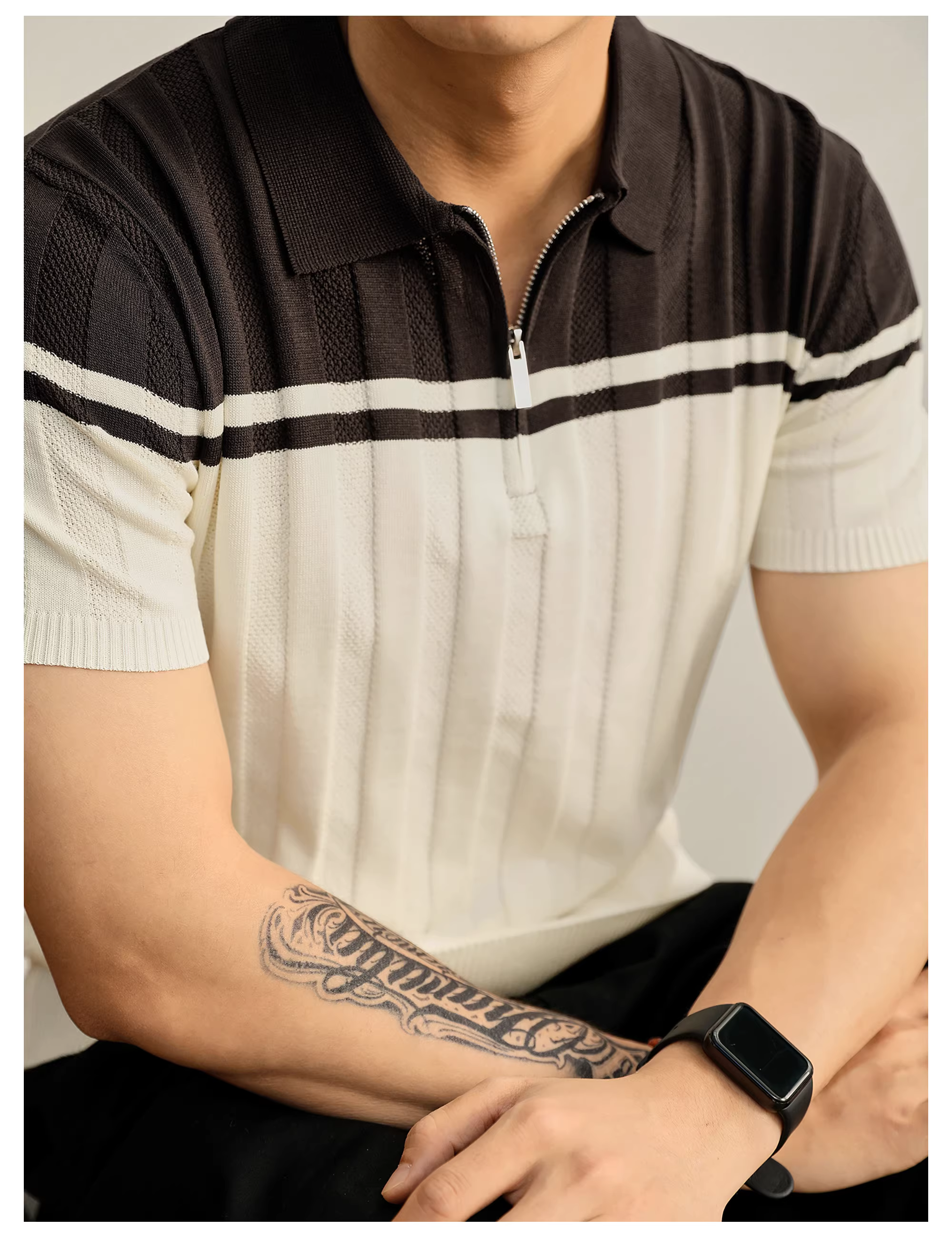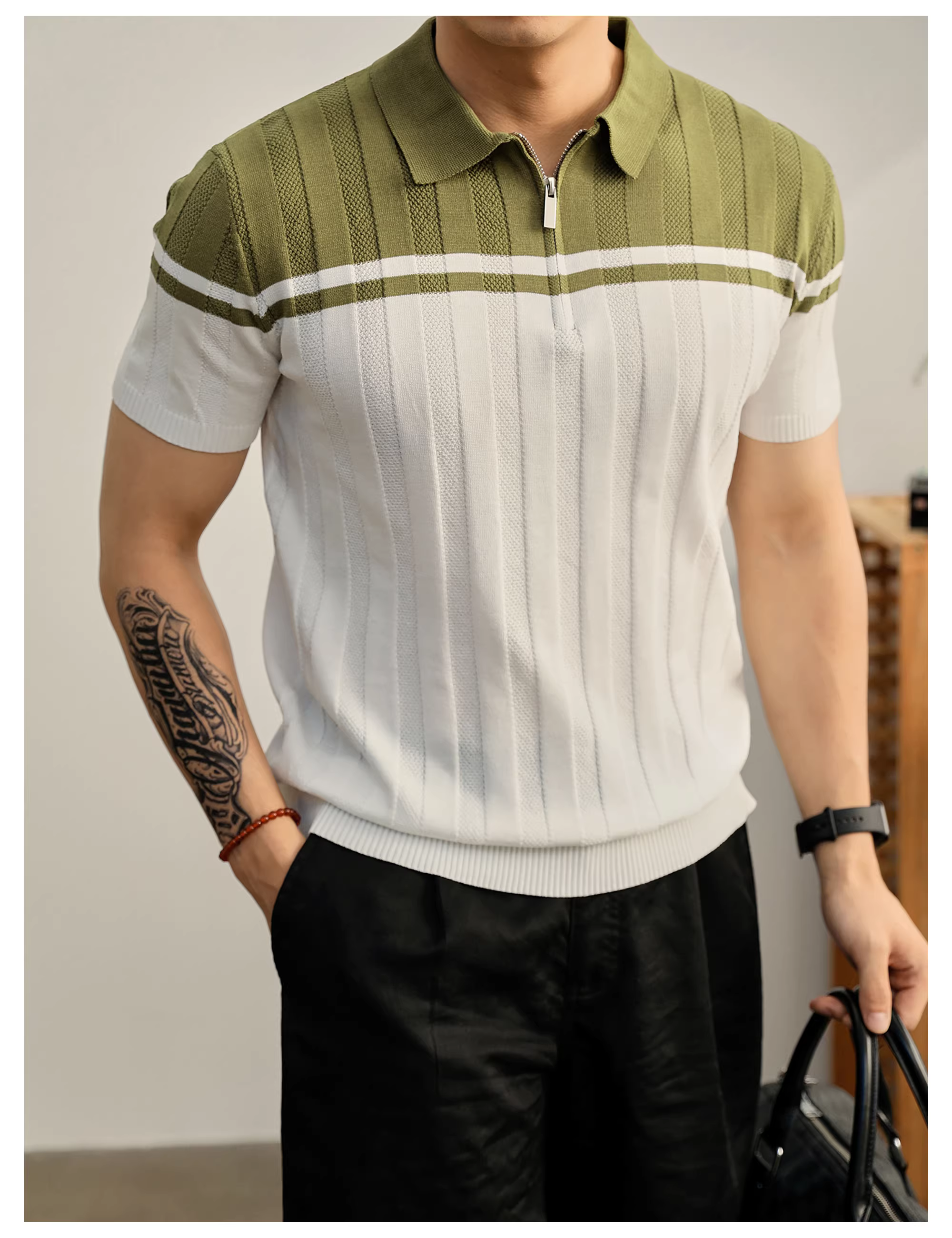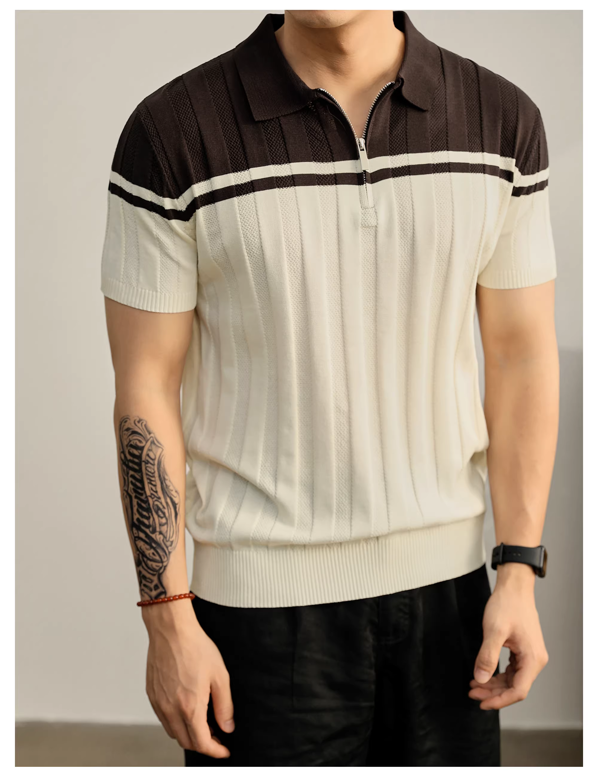 - Áo polo nam chất liệu dệt kim mềm mại như cát, phối màu độc đáo, kiểu dáng mùa hè, áo polo nửa khóa kéo chất liệu jacquard dệt nổi.