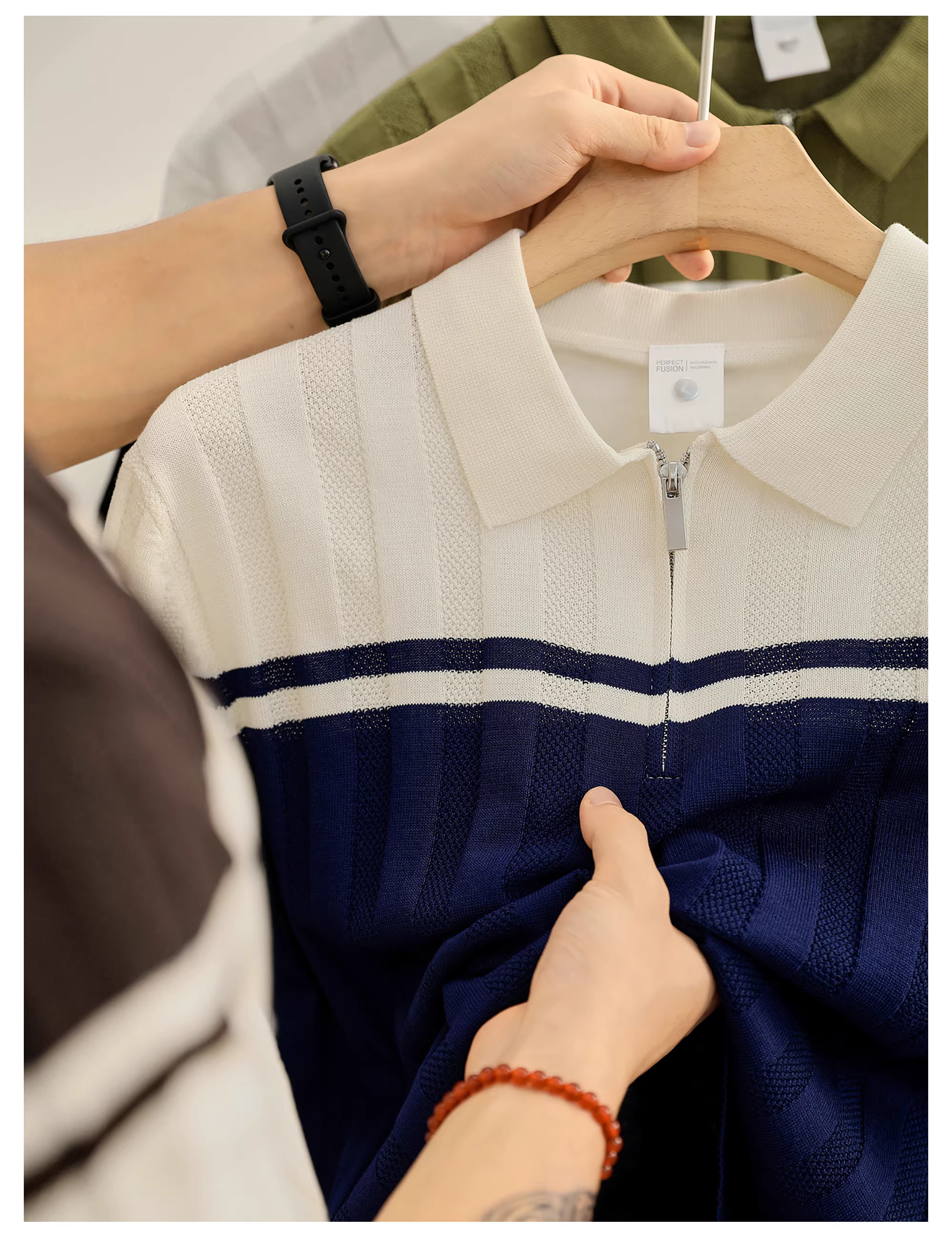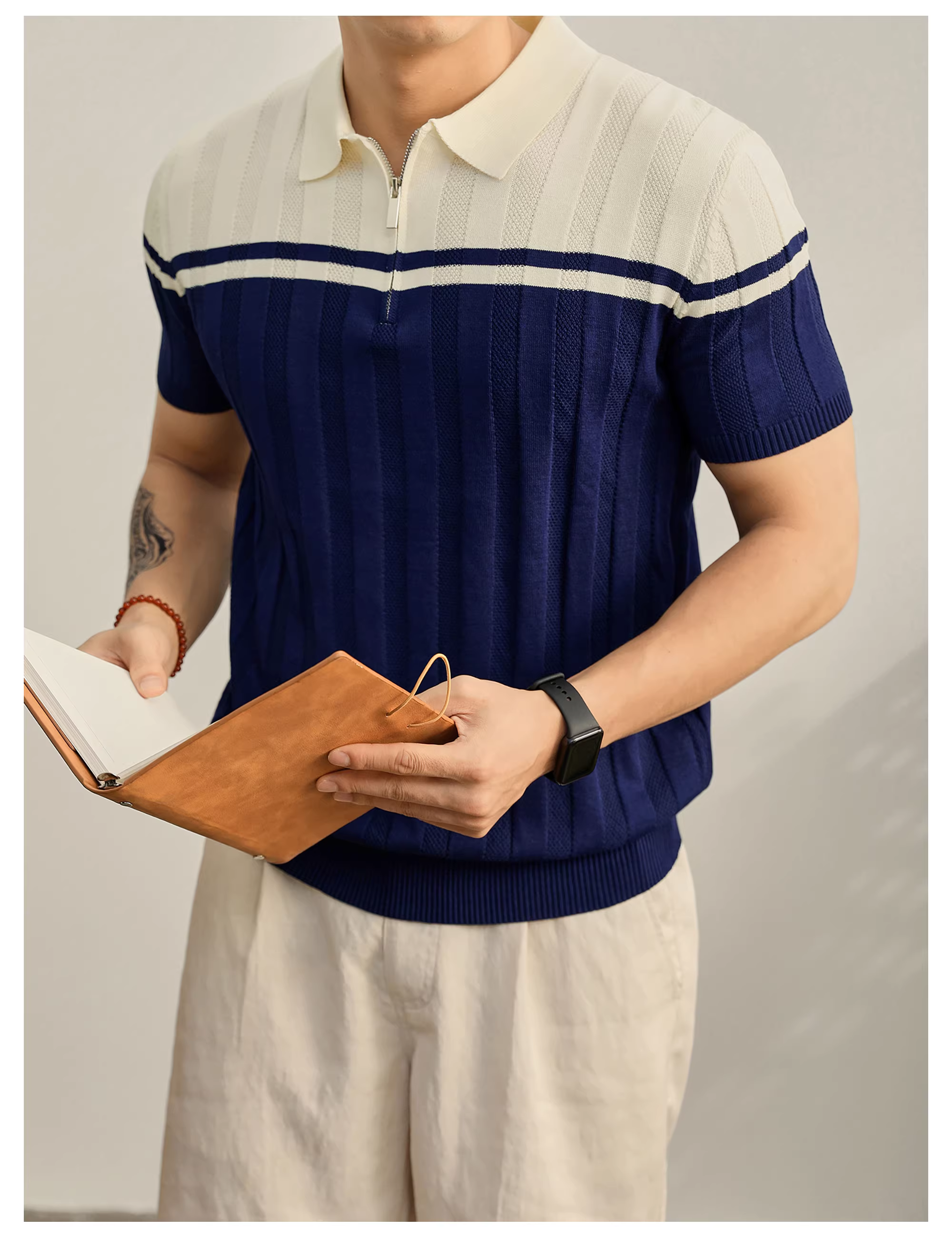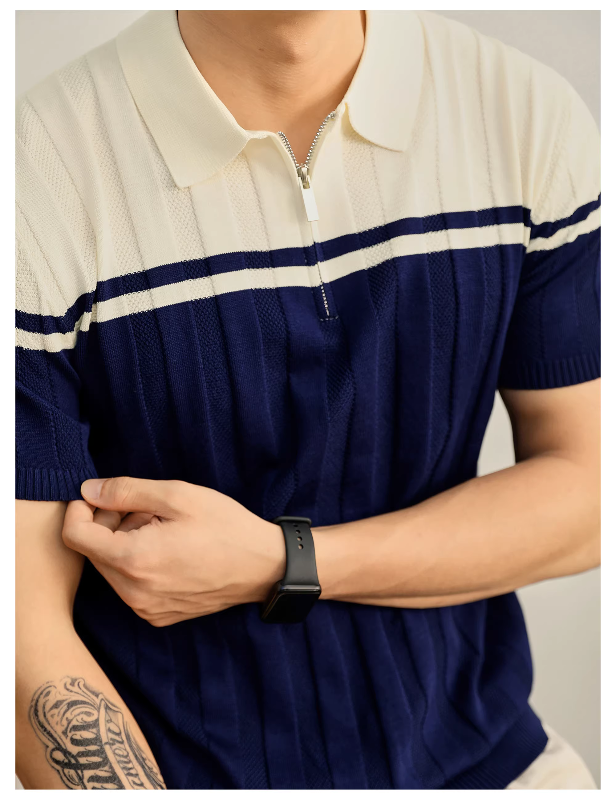 - Áo polo nam chất liệu dệt kim mềm mại như cát, phối màu độc đáo, kiểu dáng mùa hè, áo polo nửa khóa kéo chất liệu jacquard dệt nổi.