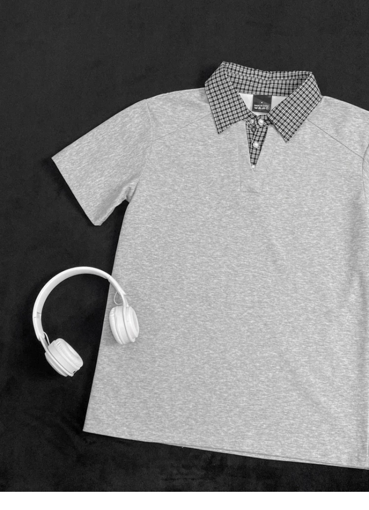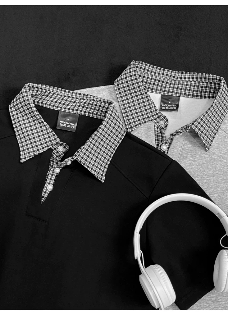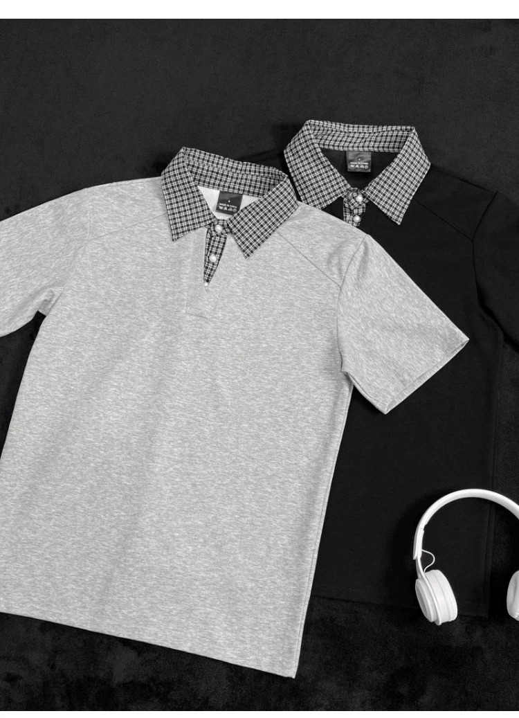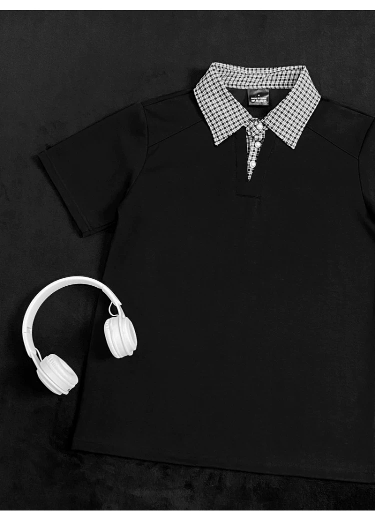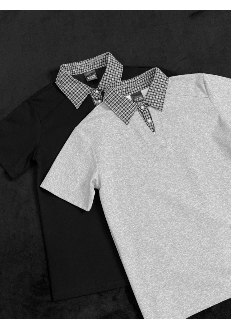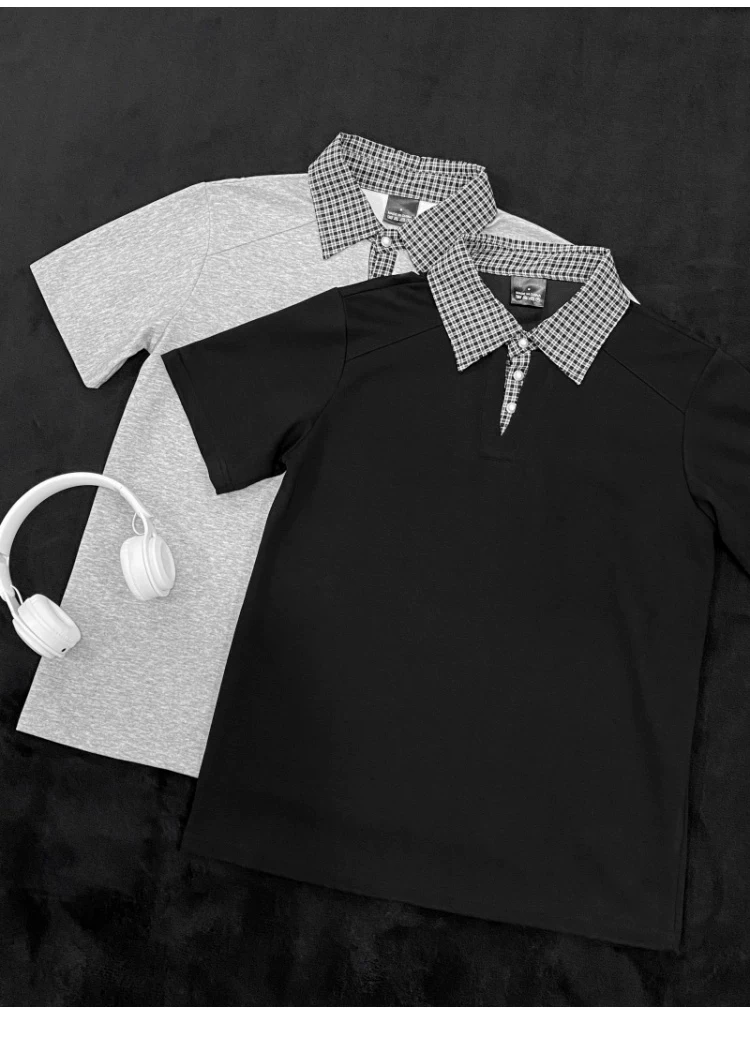 - Áo polo nam tay ngắn phối họa tiết caro, kiểu dáng thời trang mùa hè, form rộng, thiết kế giả hai lớp, áo thun nửa tay phong cách retro Mỹ.