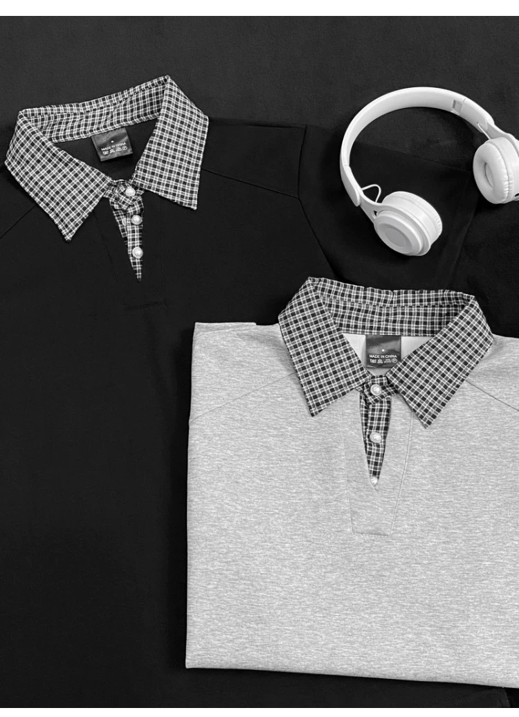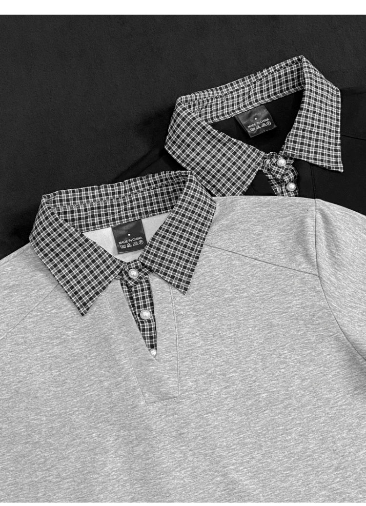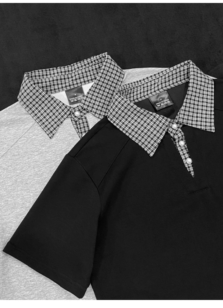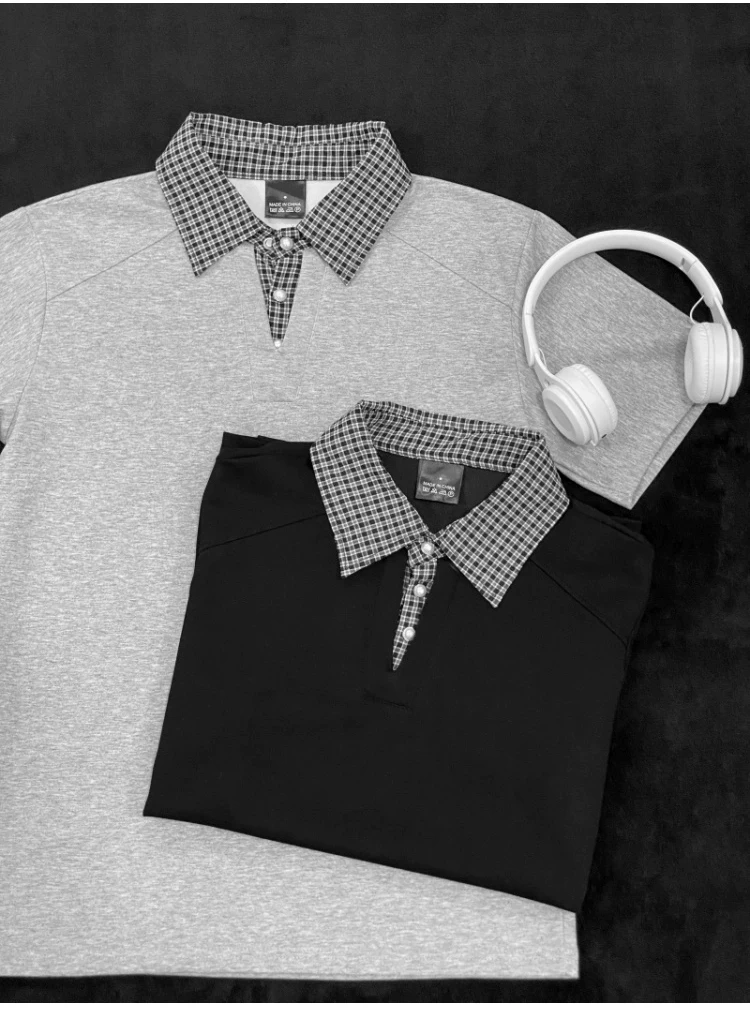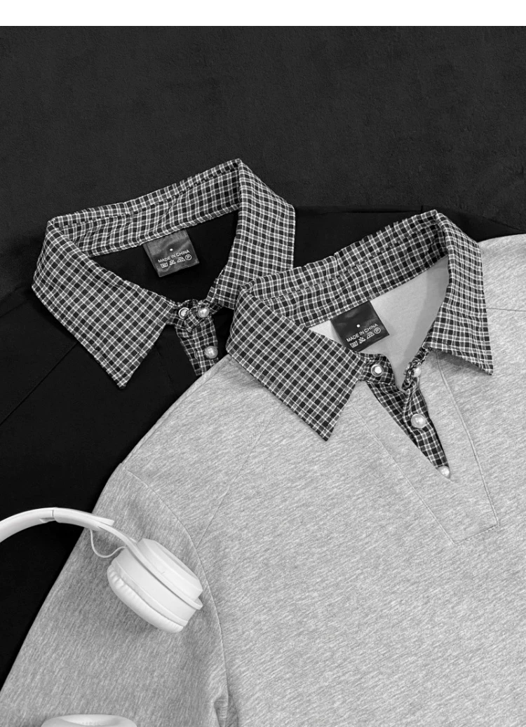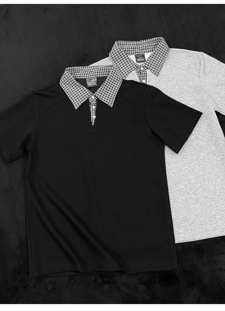 - Áo polo nam tay ngắn phối họa tiết caro, kiểu dáng thời trang mùa hè, form rộng, thiết kế giả hai lớp, áo thun nửa tay phong cách retro Mỹ.