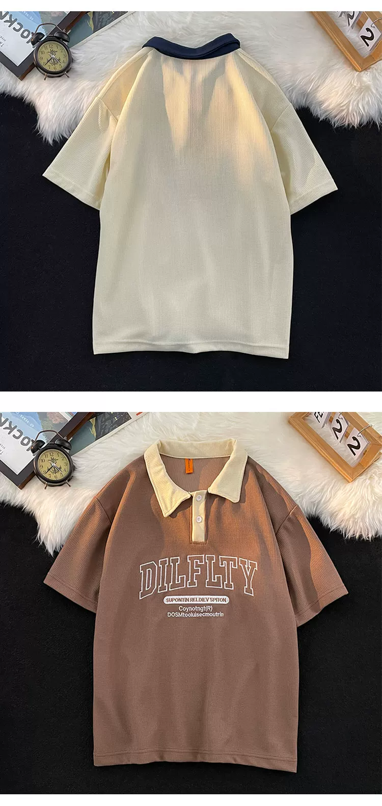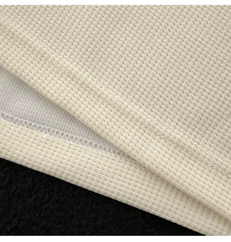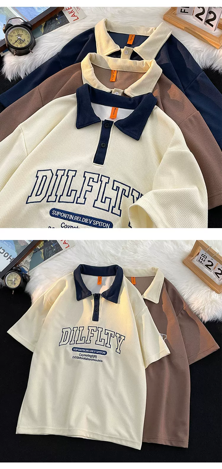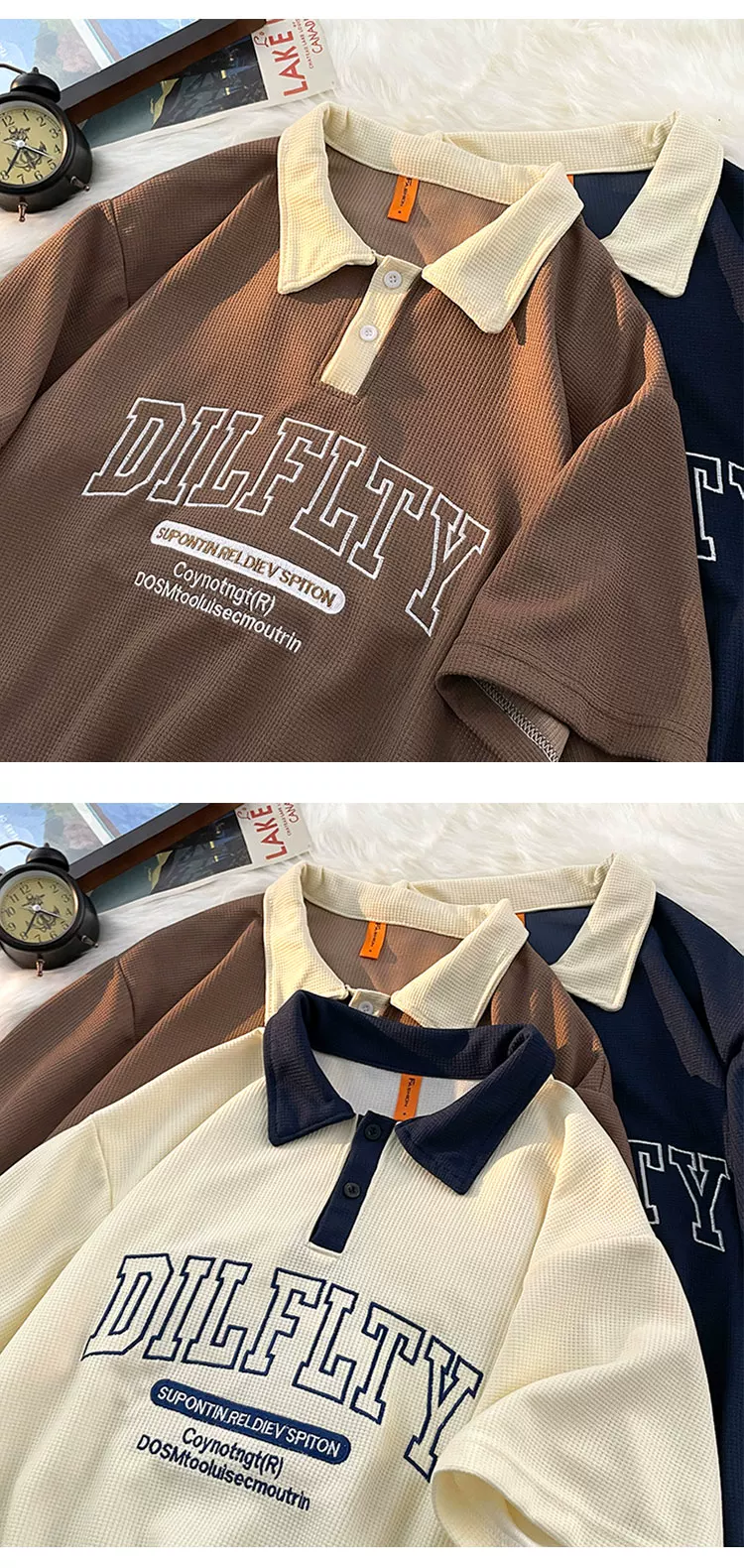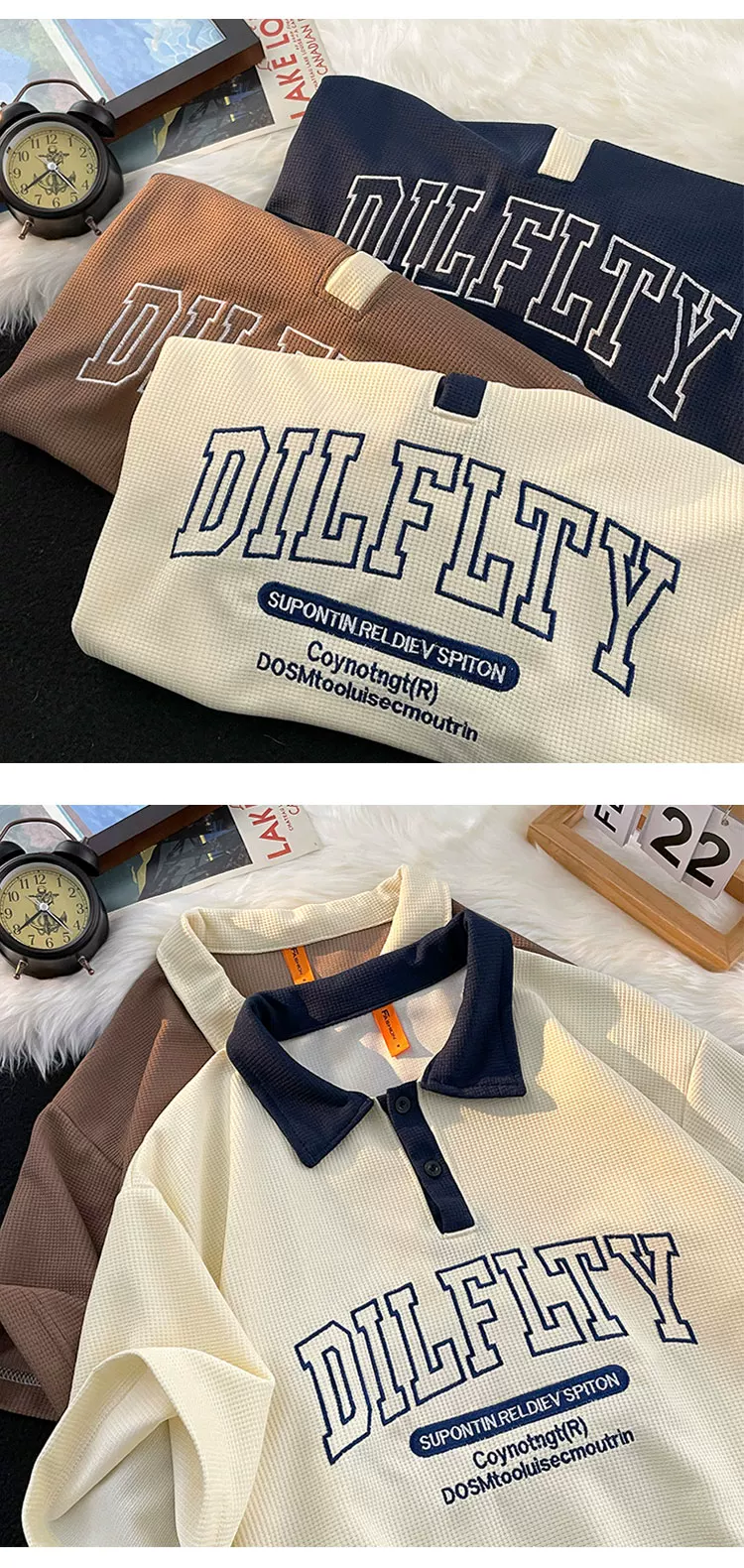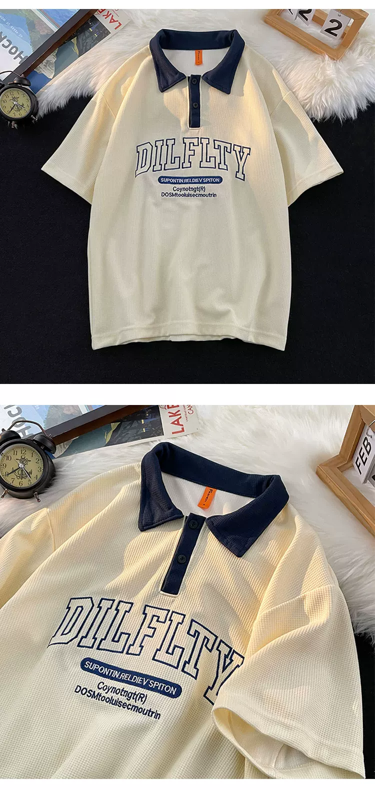 - Áo polo retro Mỹ dành cho nam, tay ngắn, thương hiệu thời trang mùa hè, áo thun dệt kim waffle, dáng rộng, đa năng, phong cách cặp đôi, tay áo lửng.