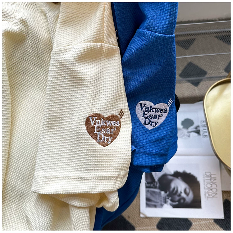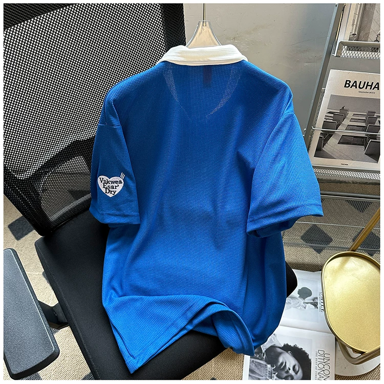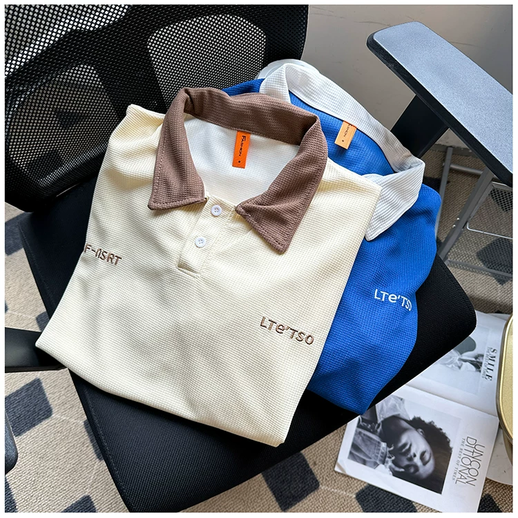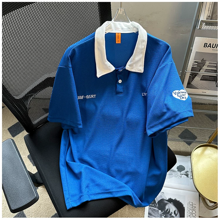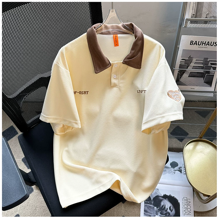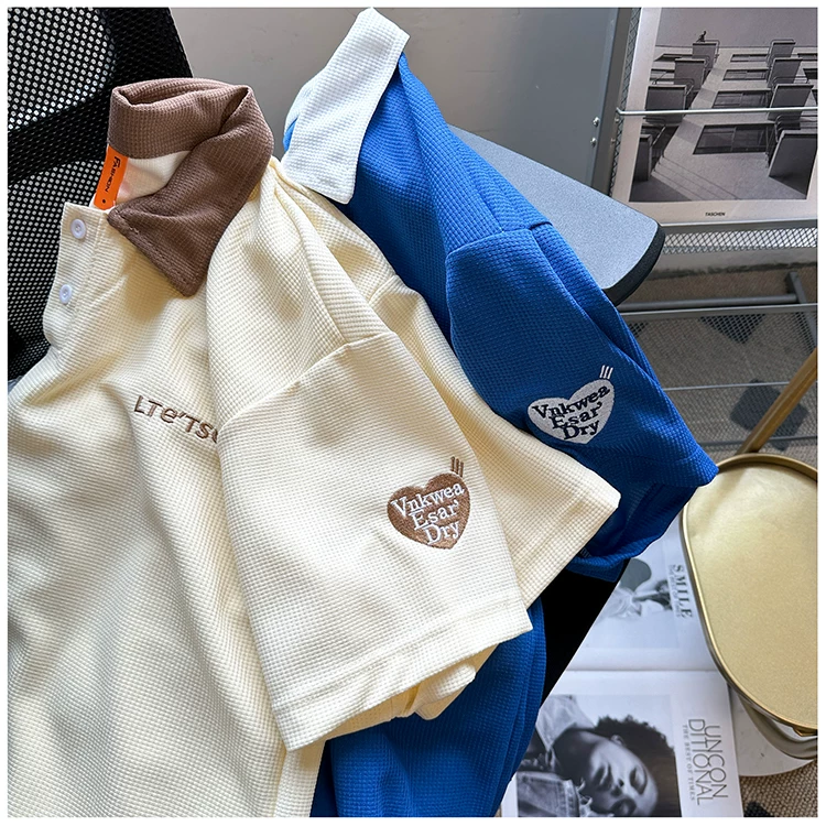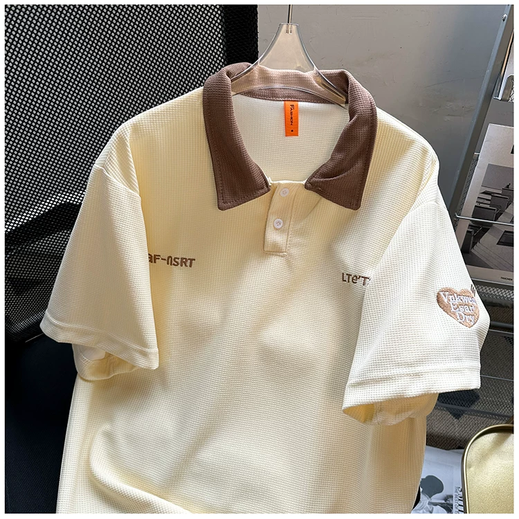 Áo polo thêu phối màu nam tay ngắn, chất liệu waffle, cổ bẻ, kiểu dáng thời trang Mỹ, form rộng, áo đôi, tay lửng mùa hè