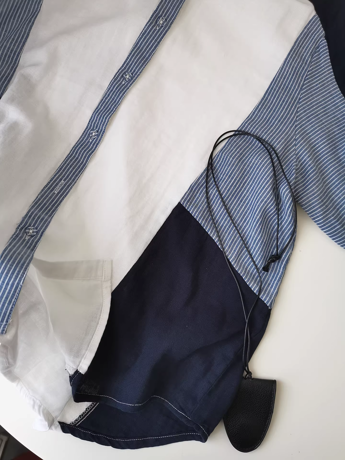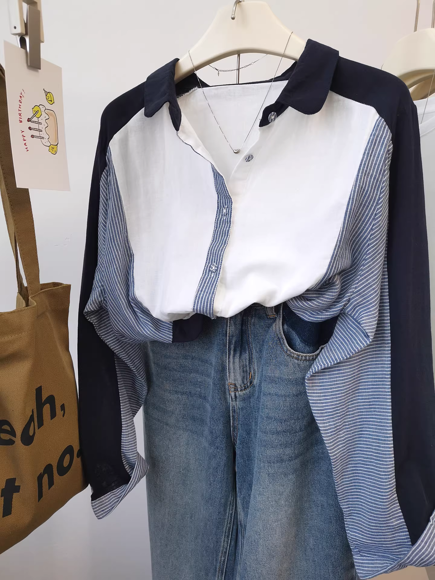 Áo sơ mi chắp vá sọc đôi bằng vải gạc đơn giản, đa năng và sành điệu! Áo kiểu dáng độc đáo, rộng rãi dành cho nữ.