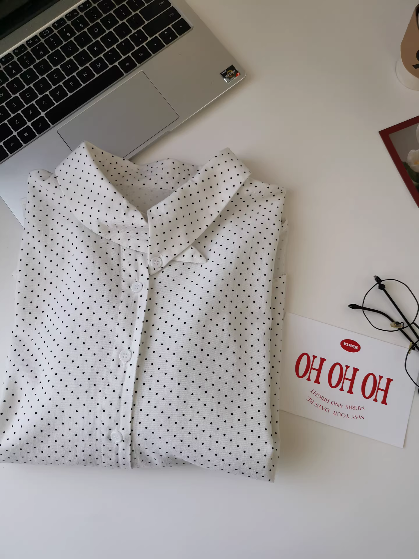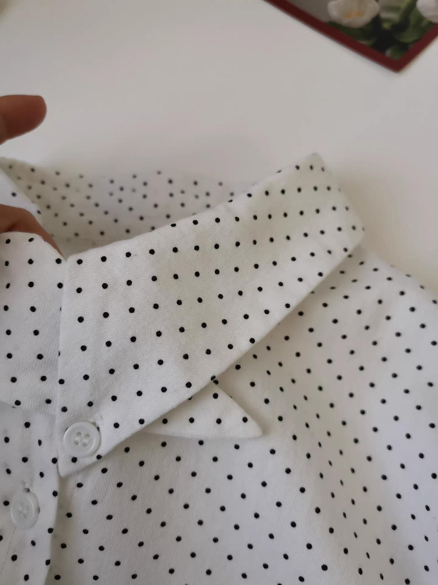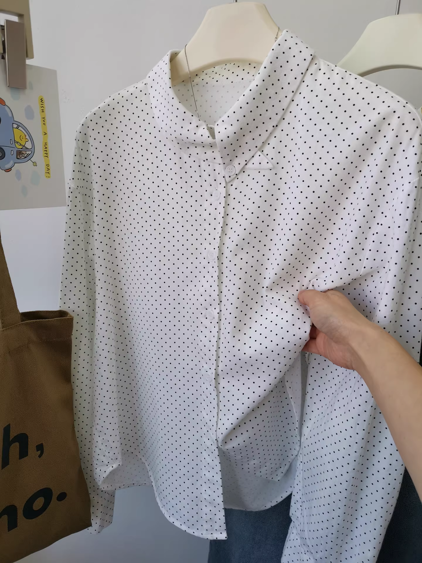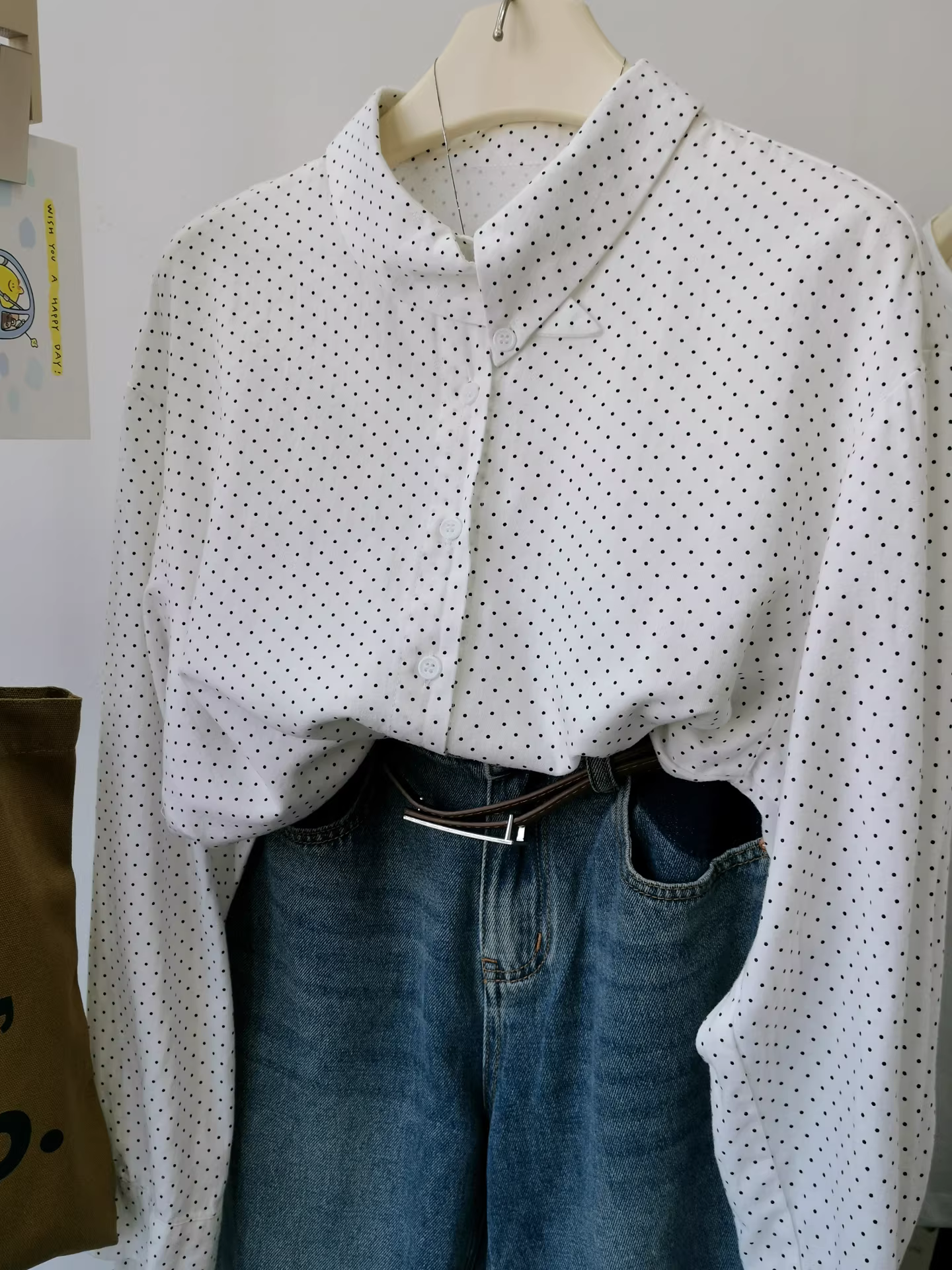 - Áo sơ mi cổ bẻ chấm bi nhỏ kiểu cổ điển màu nâu chấm bi dành cho nữ, áo sơ mi dài tay xếp lớp dáng rộng.