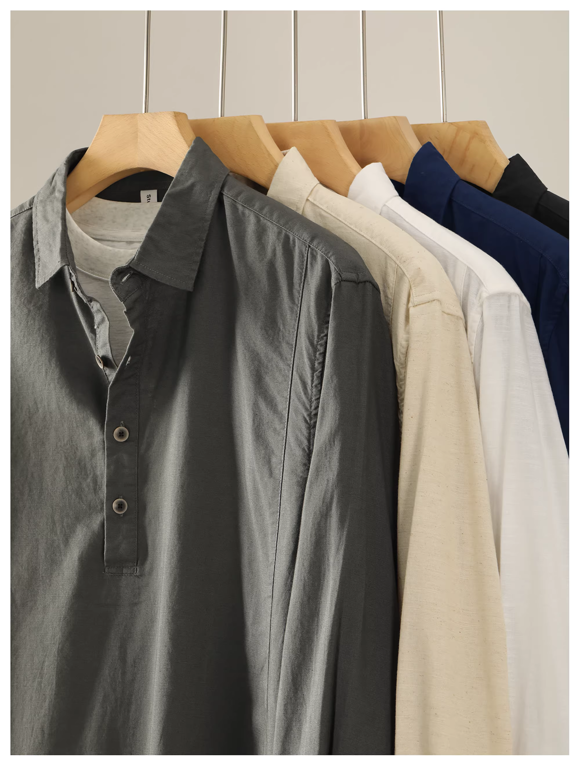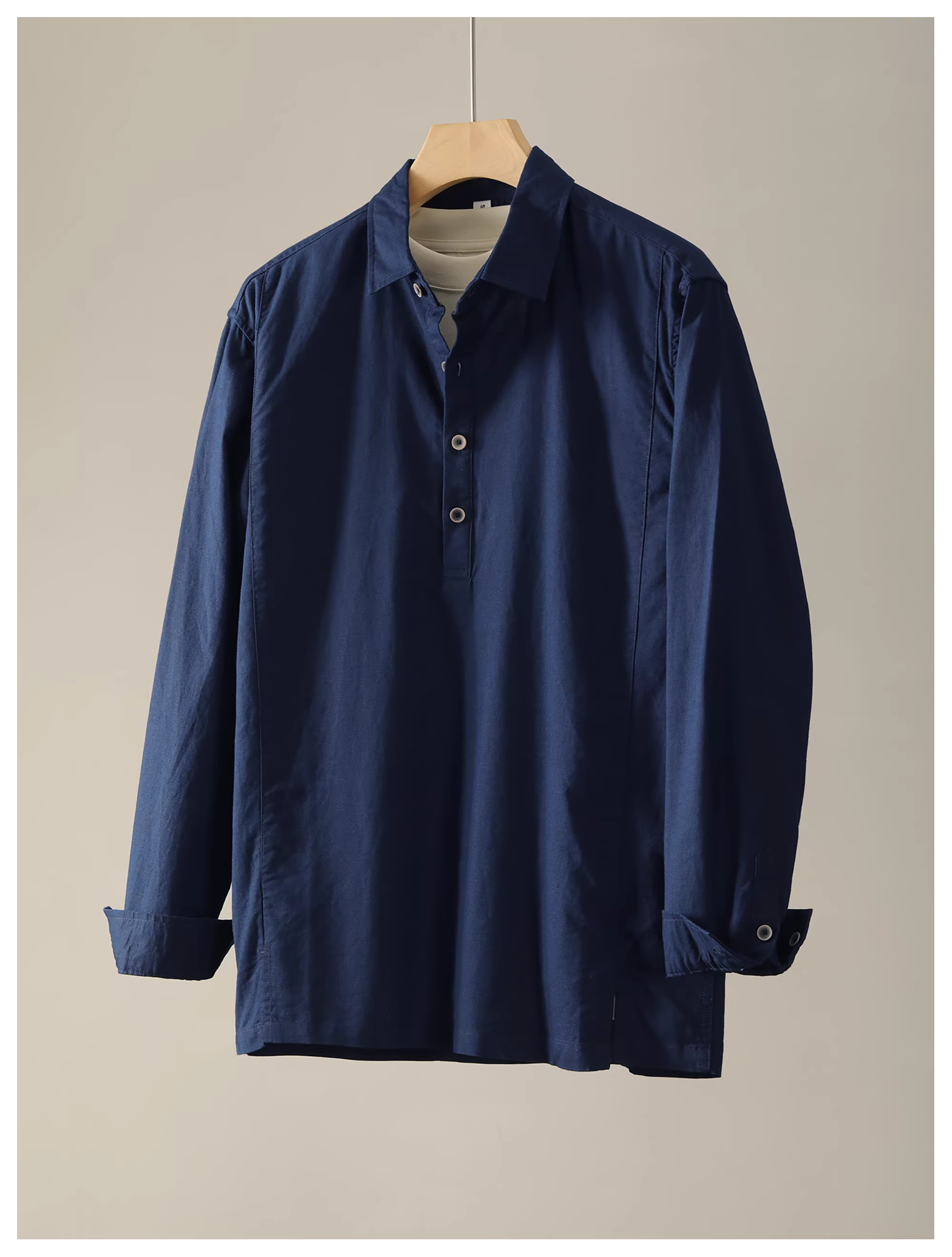 - Áo sơ mi có cổ dài tay bằng vải cotton-linen kiểu Nhật Bản kiểu Nhật Bản dành cho nam với viền được định hình và có khe hở ở bên hông.