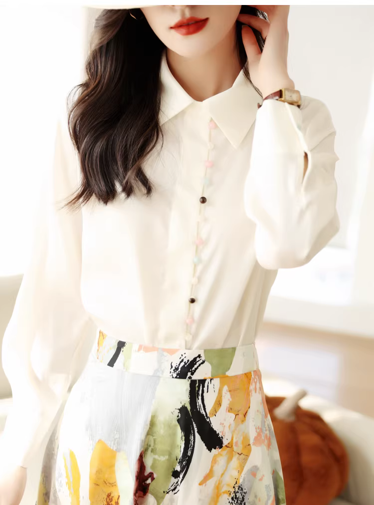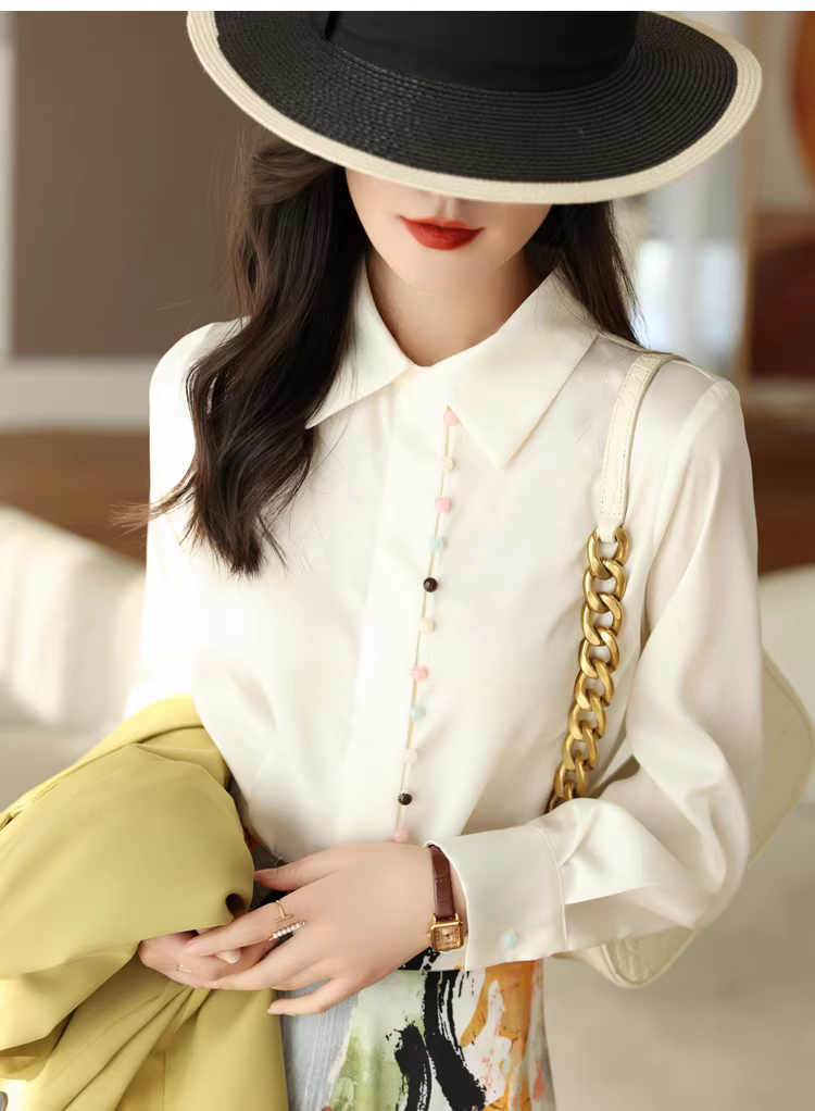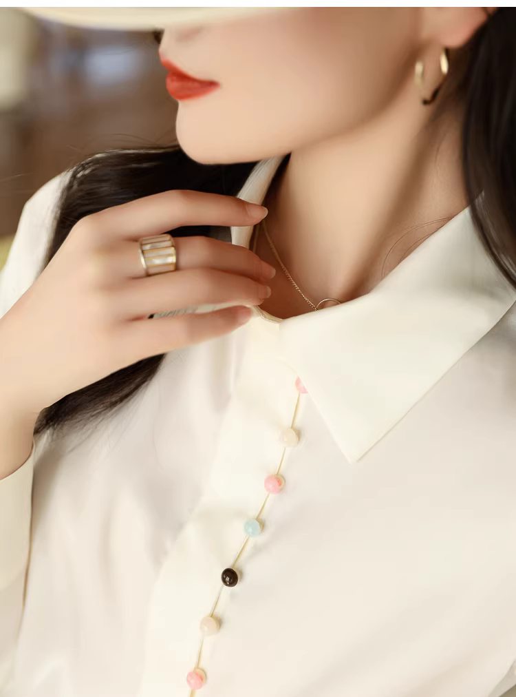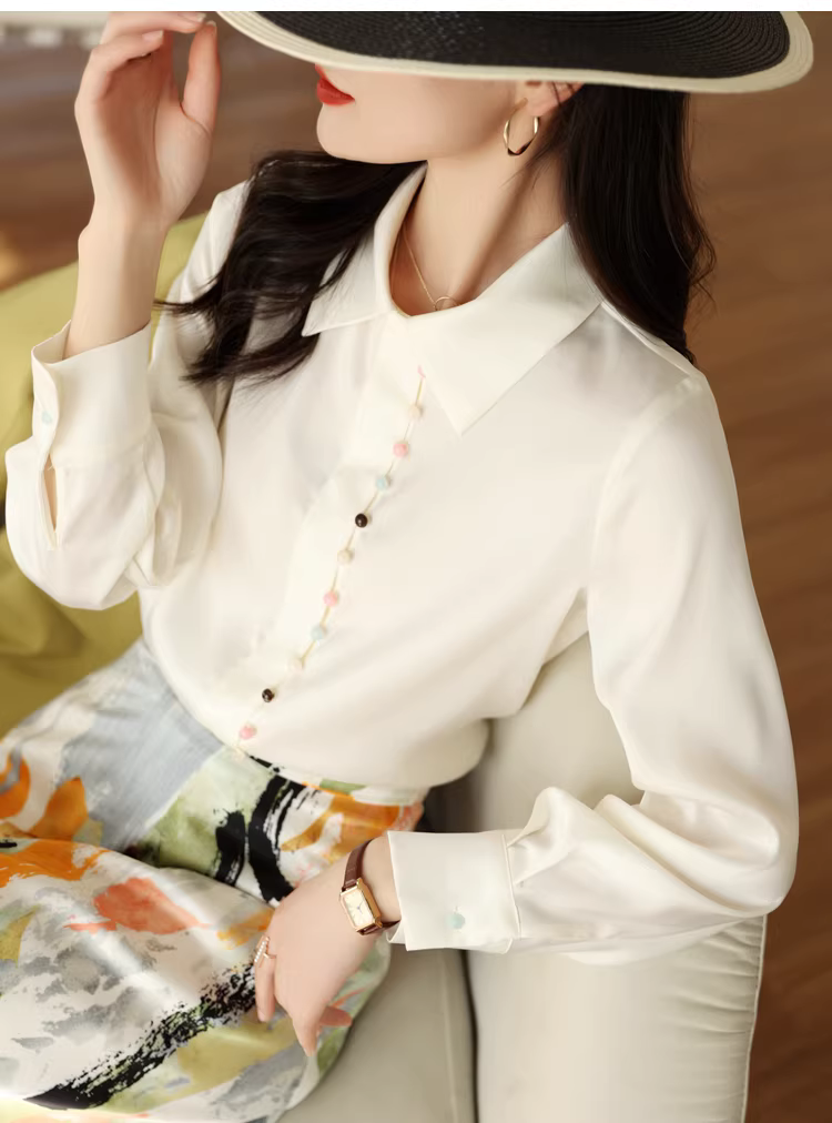 - Áo sơ mi dài tay satin bóng mượt nhiều nút cầu vồng dành cho nữ mùa xuân