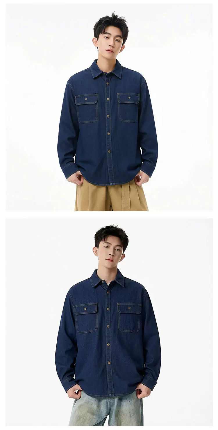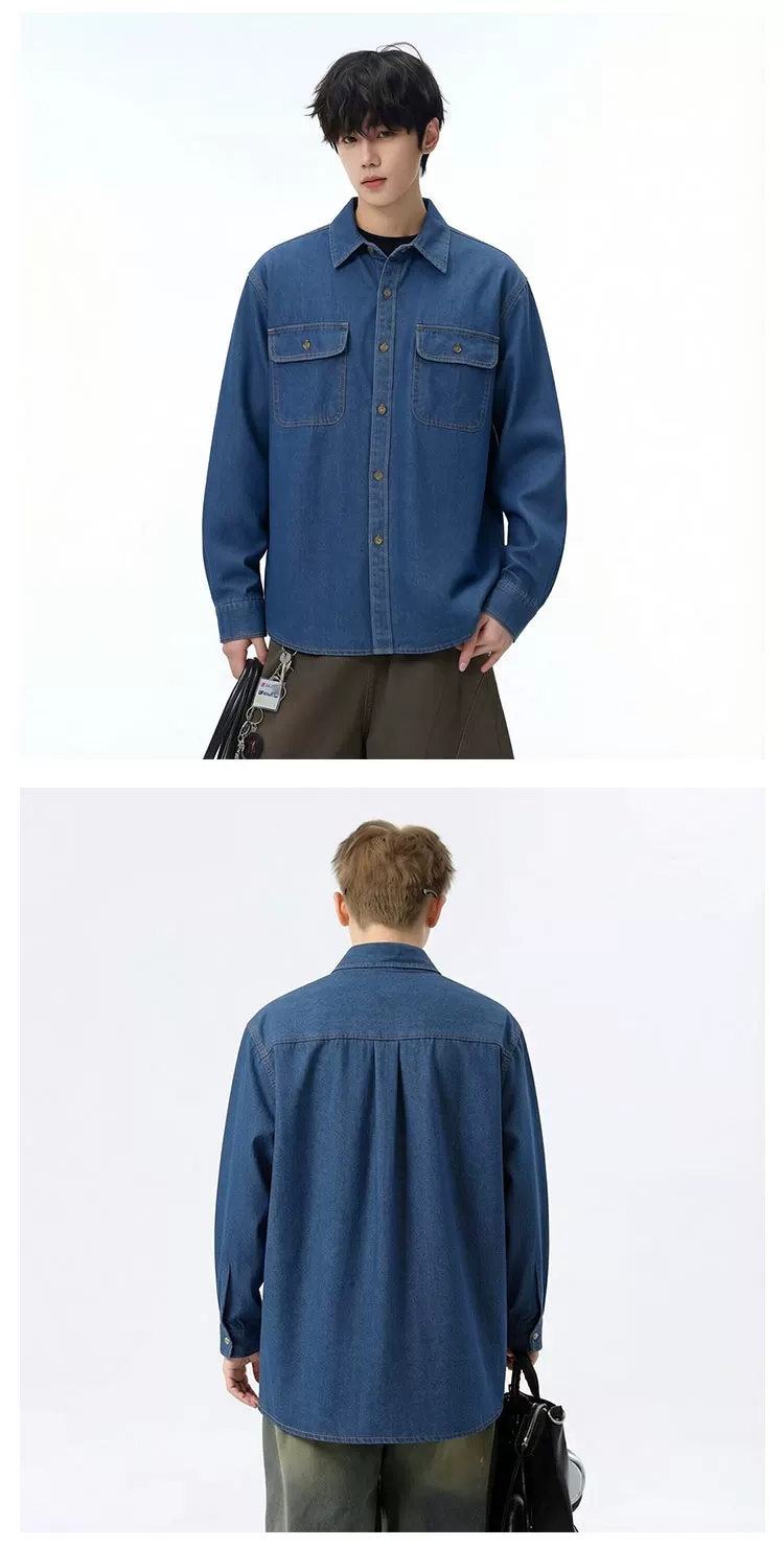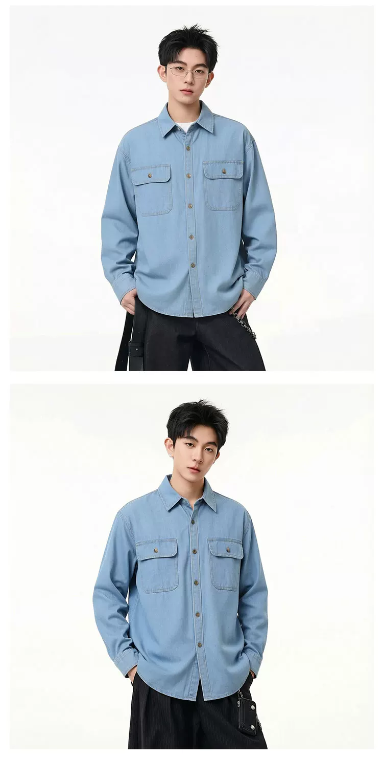 Áo sơ mi denim kiểu Nhật dành cho nam, áo đa năng thường ngày mùa xuân thu, áo khoác sơ mi nhiều túi rộng rãi, hợp thời trang.