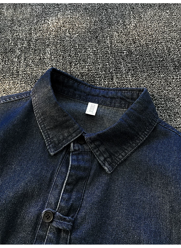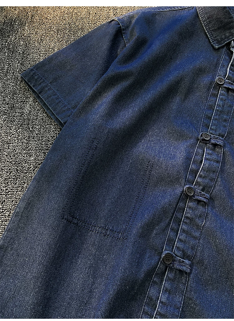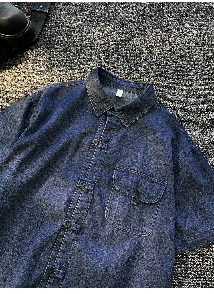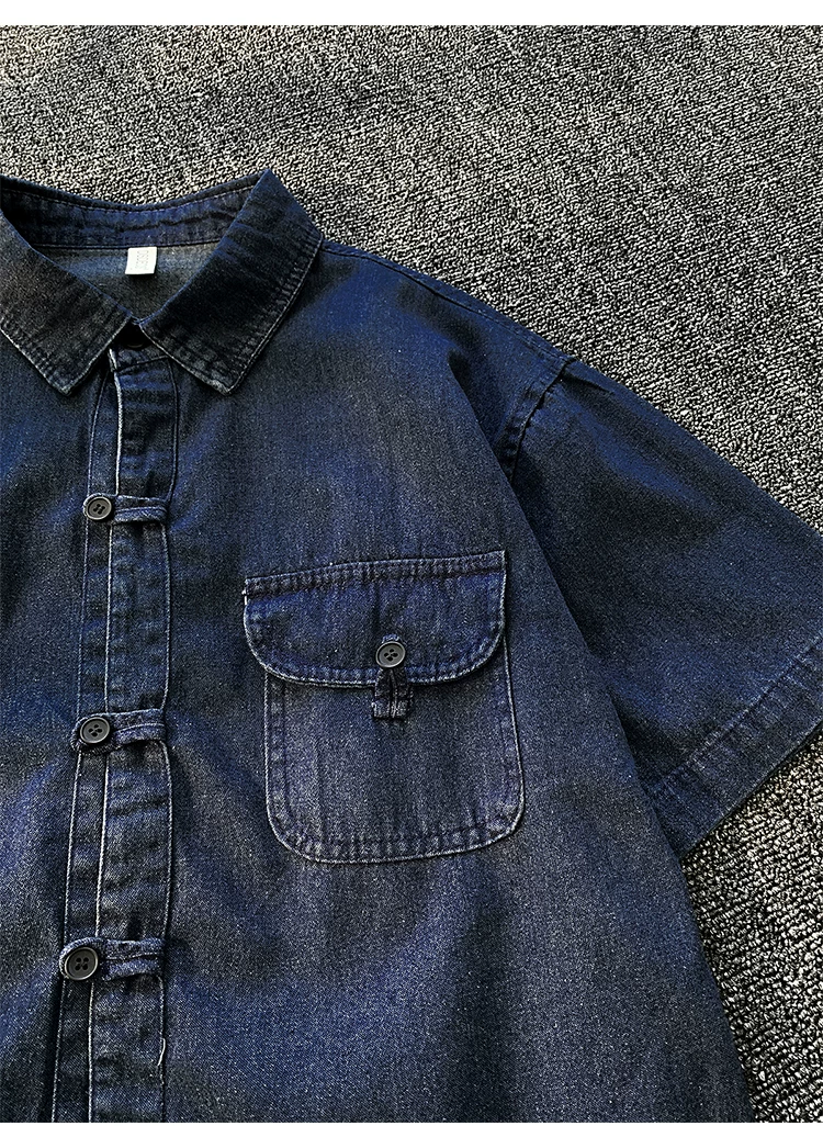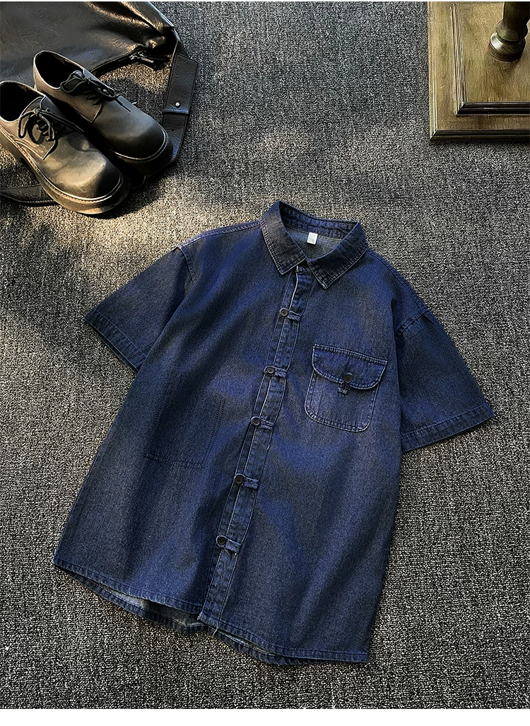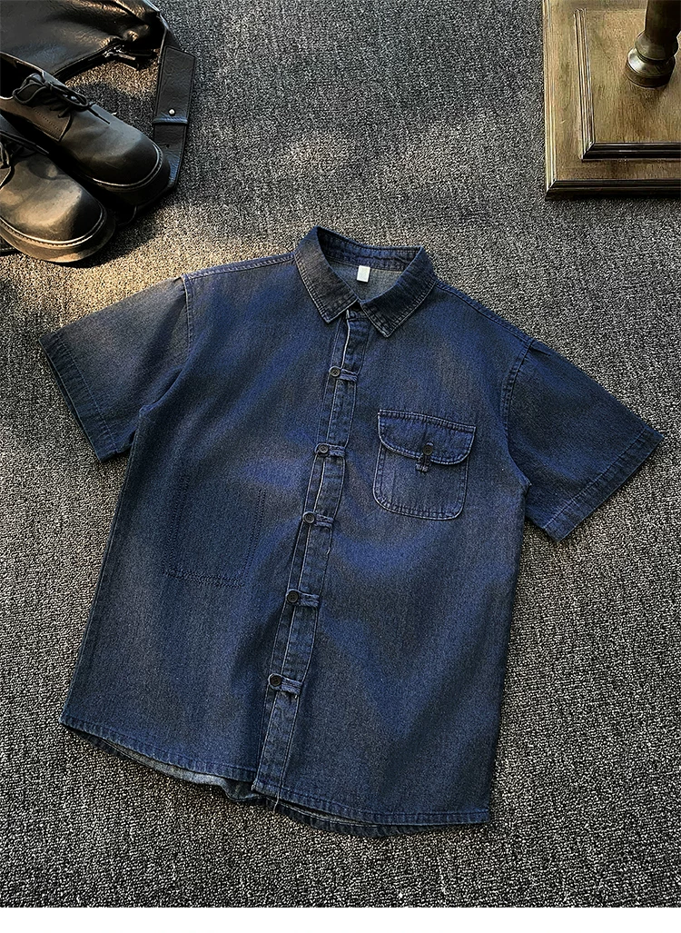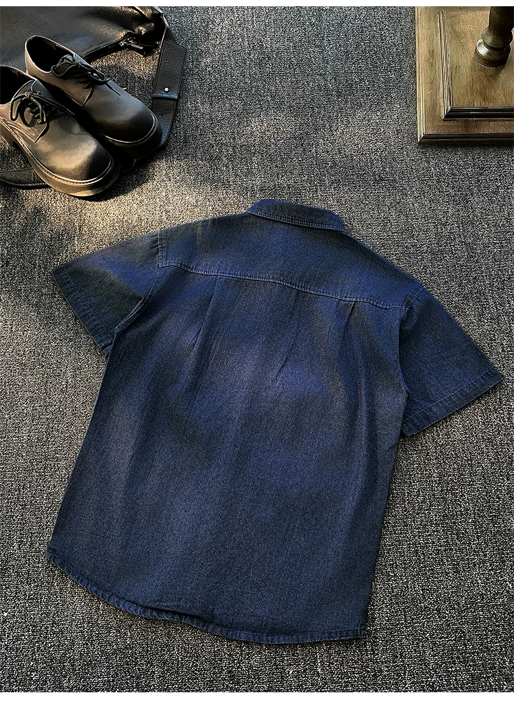 - Áo sơ mi denim nam tay ngắn, kiểu dáng rộng rãi, thời trang mùa hè, có khuy cài, phong cách áo khoác công sở Mỹ.