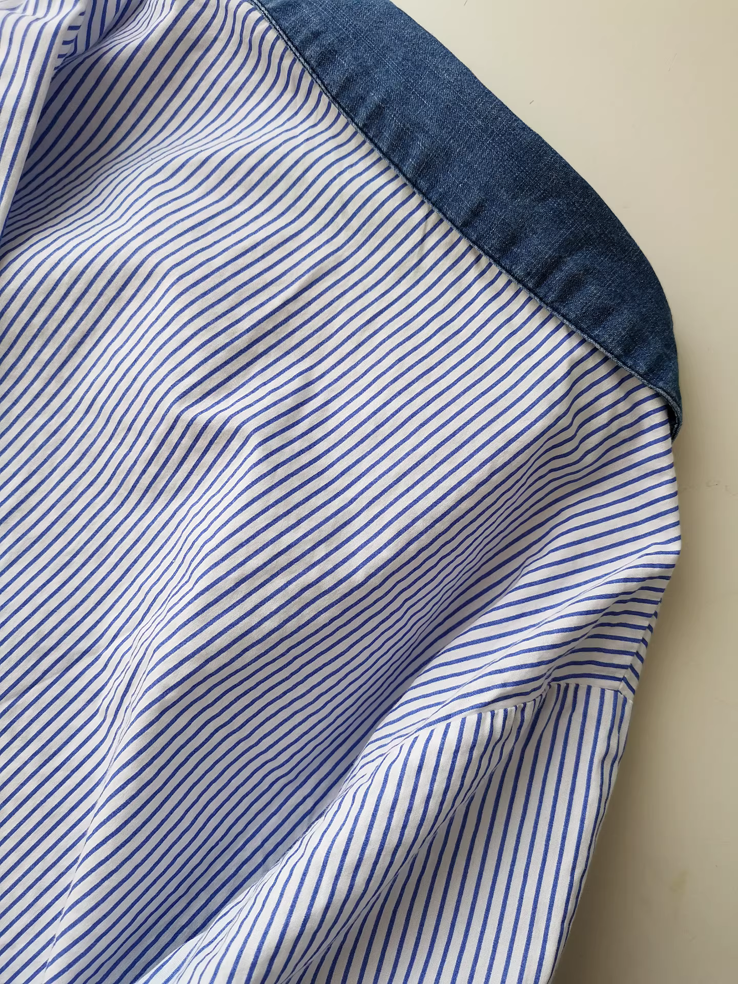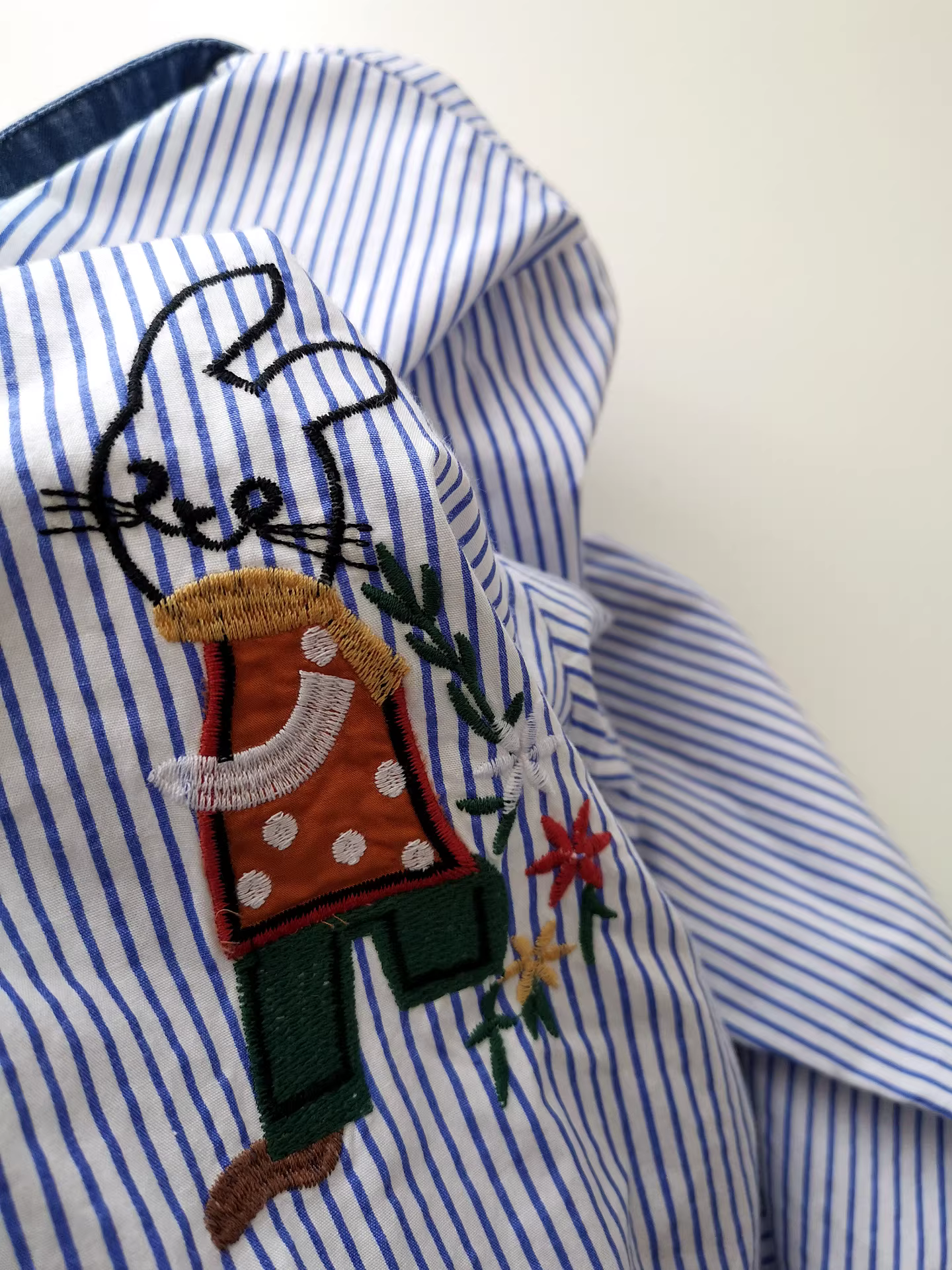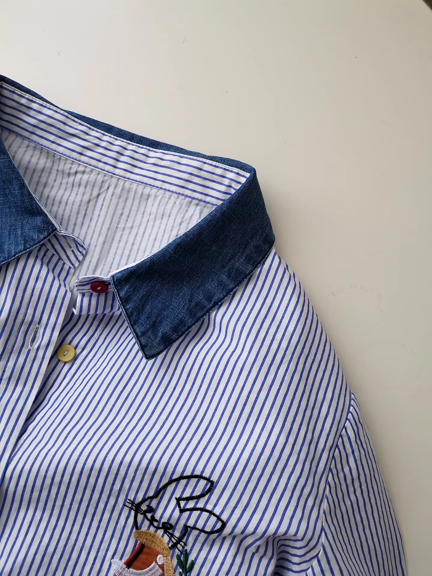 Áo sơ mi denim phối màu, thêu hình thỏ, áo sơ mi dáng rộng, áo sơ mi dài tay đa năng để phối đồ mùa thu.