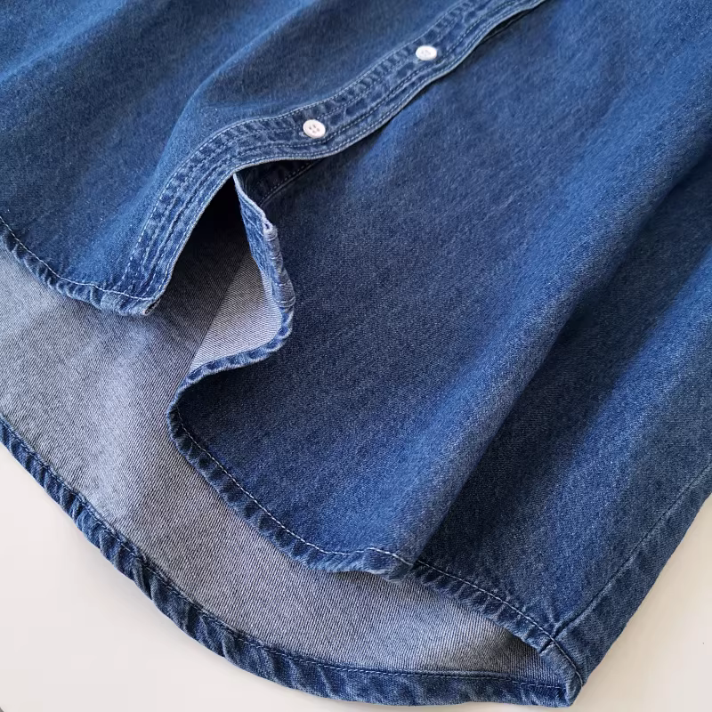 - Áo sơ mi denim xanh đậm tối giản, dài tay, dáng rộng, có họa tiết thêu cổ điển dành cho nữ
