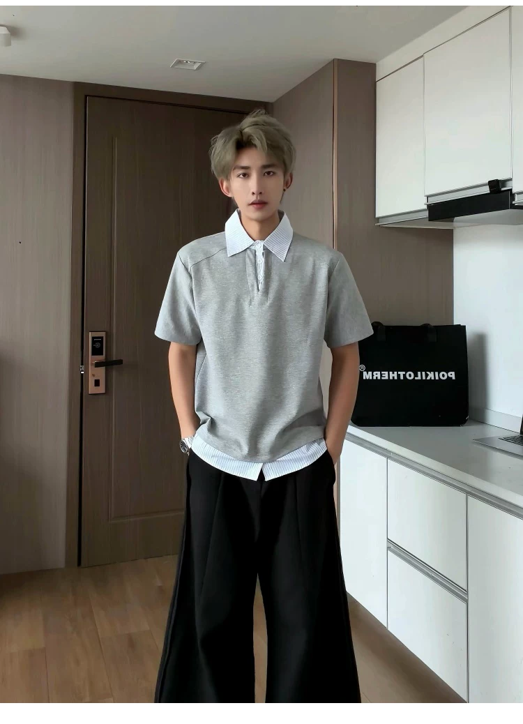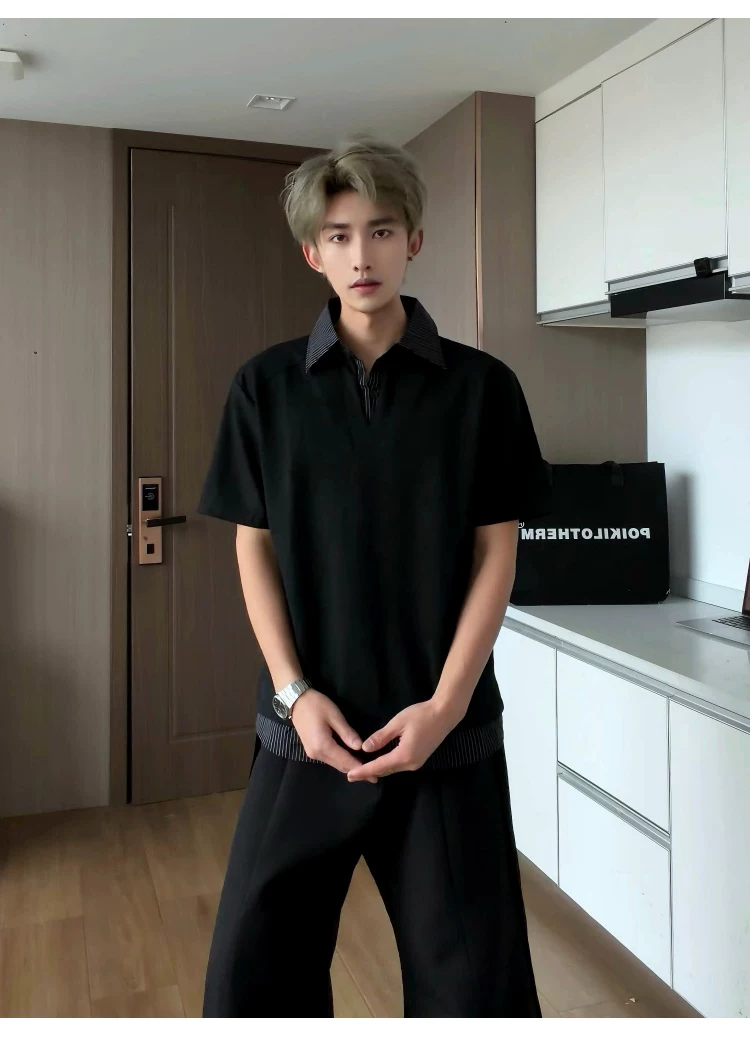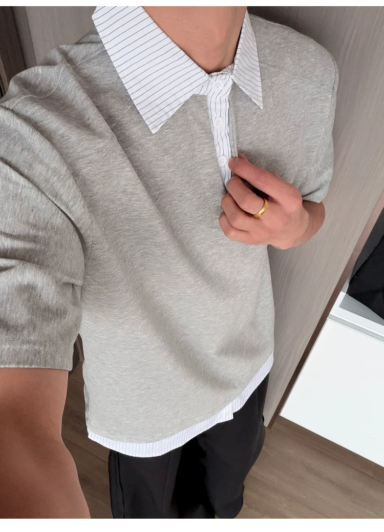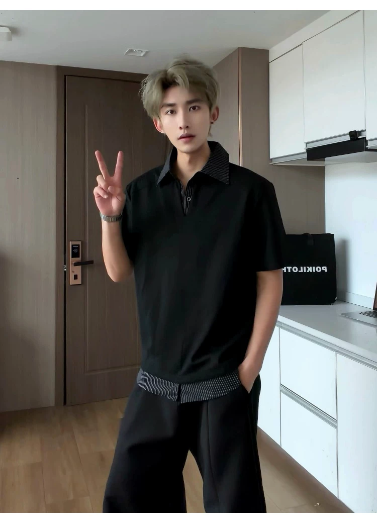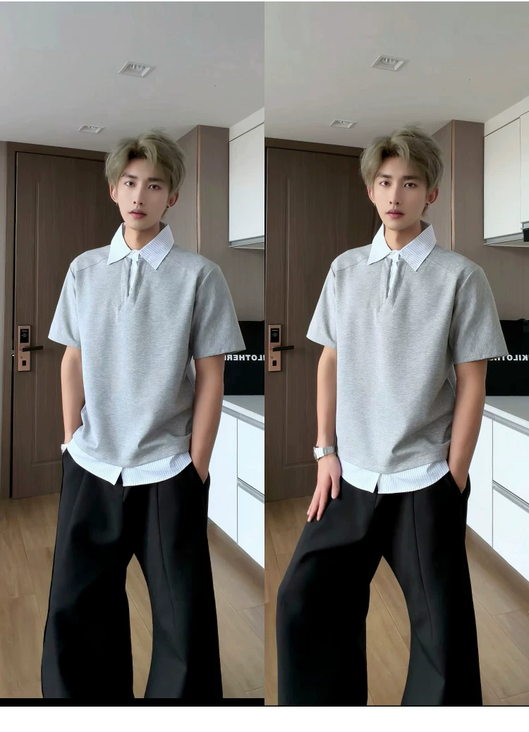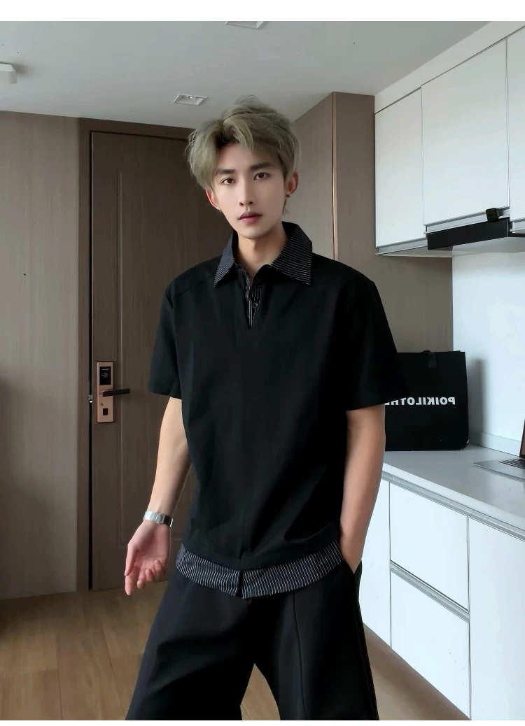 - Áo sơ mi giả hai mảnh cổ polo dành cho nam, áo thun sọc phối màu rộng rãi mùa hè, áo thun cao cấp phong cách Mỹ thời thượng.
